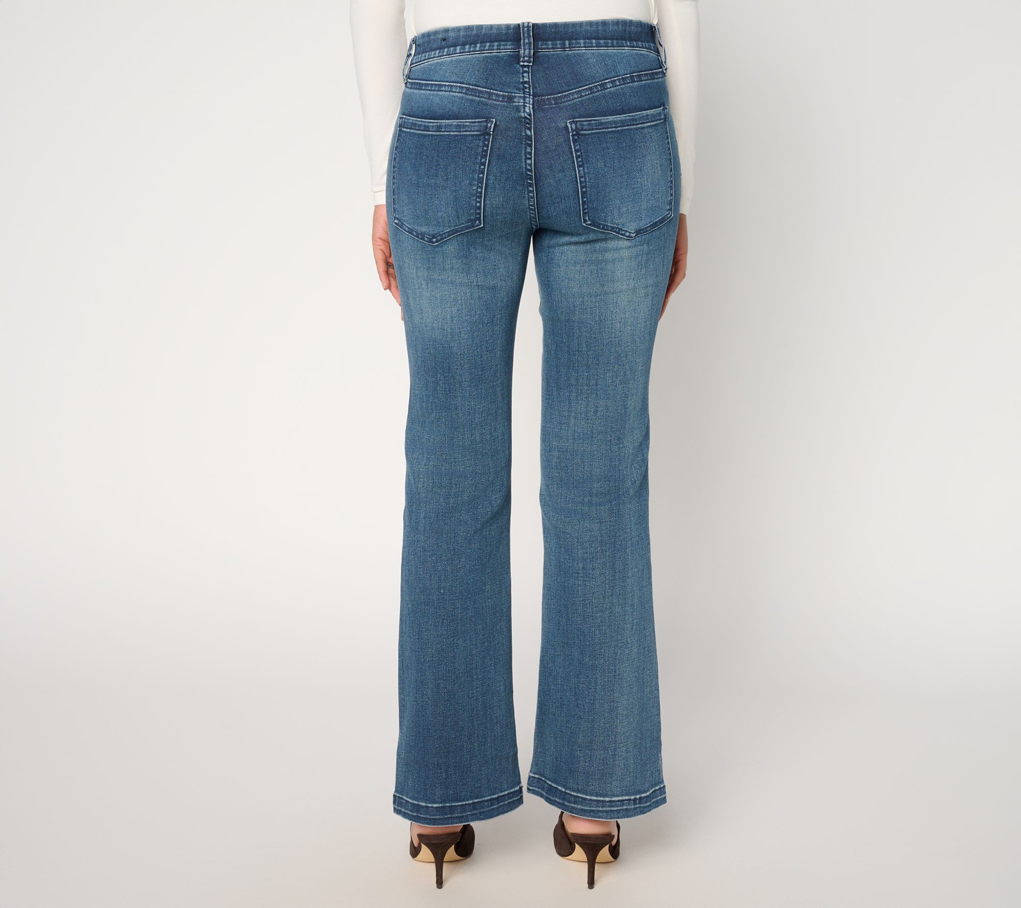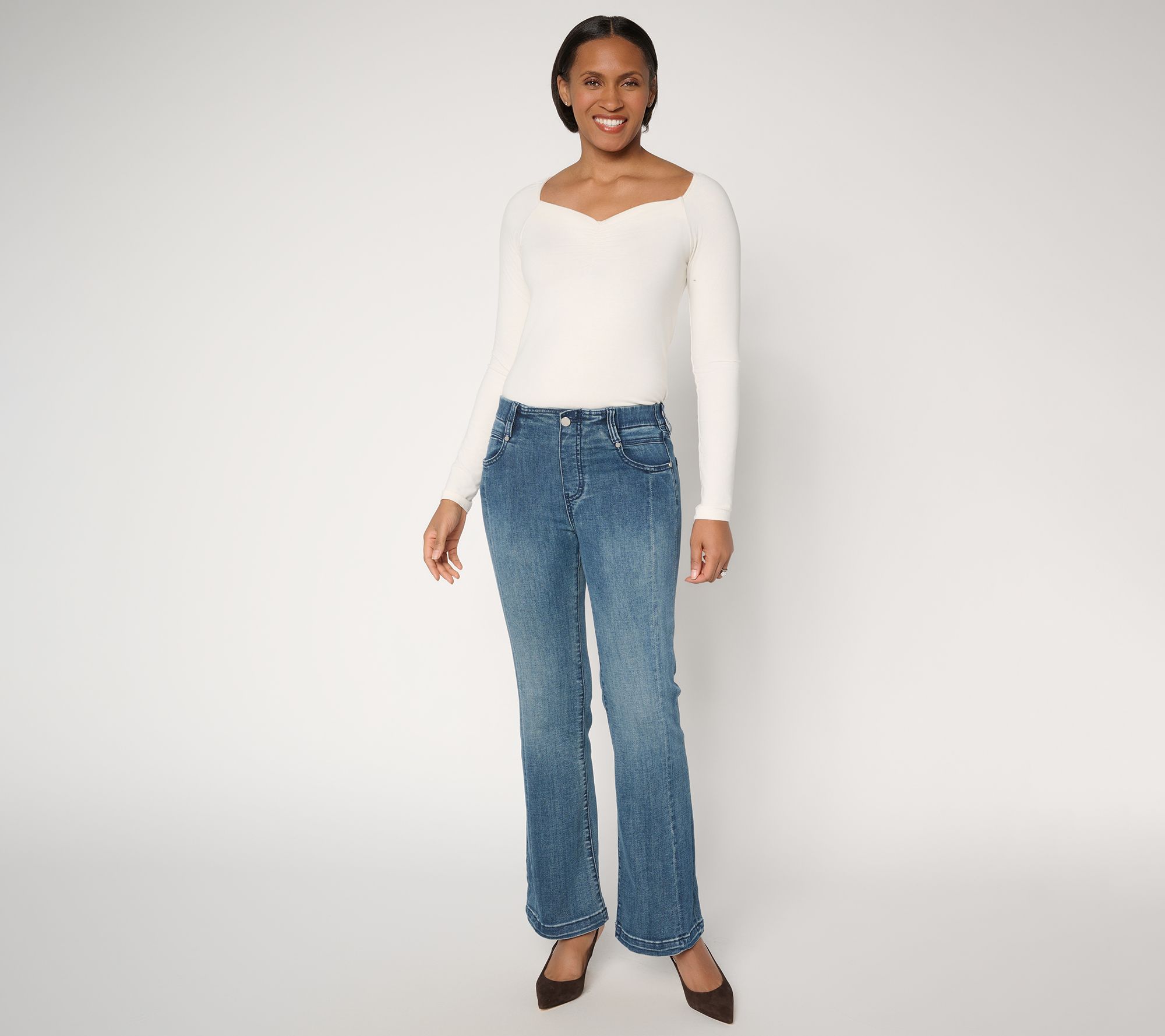Classic cool. Styled with crisp seaming and a balanced boot-cut shape, this take on Liverpool's Gia Glider jeans creates a sleek look whether you're dashing into work or catching up with friends on the weekend. The smooth stretch, five-pocket design, and elastic waistband give a comfortable fit that flatters and moves with you -- just add sneakers or heels for an instant outfit. From Liverpool Los Angeles.
