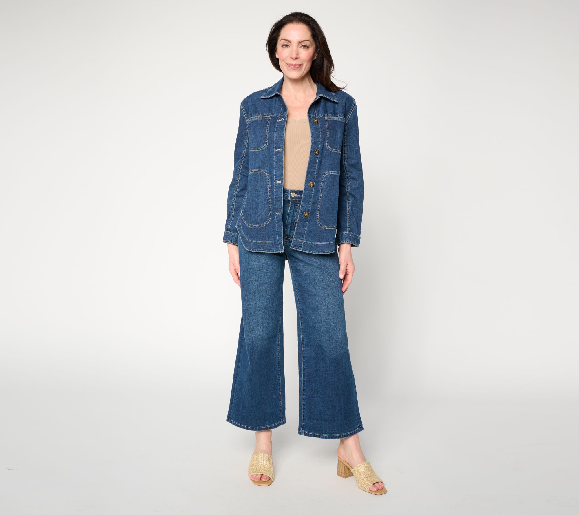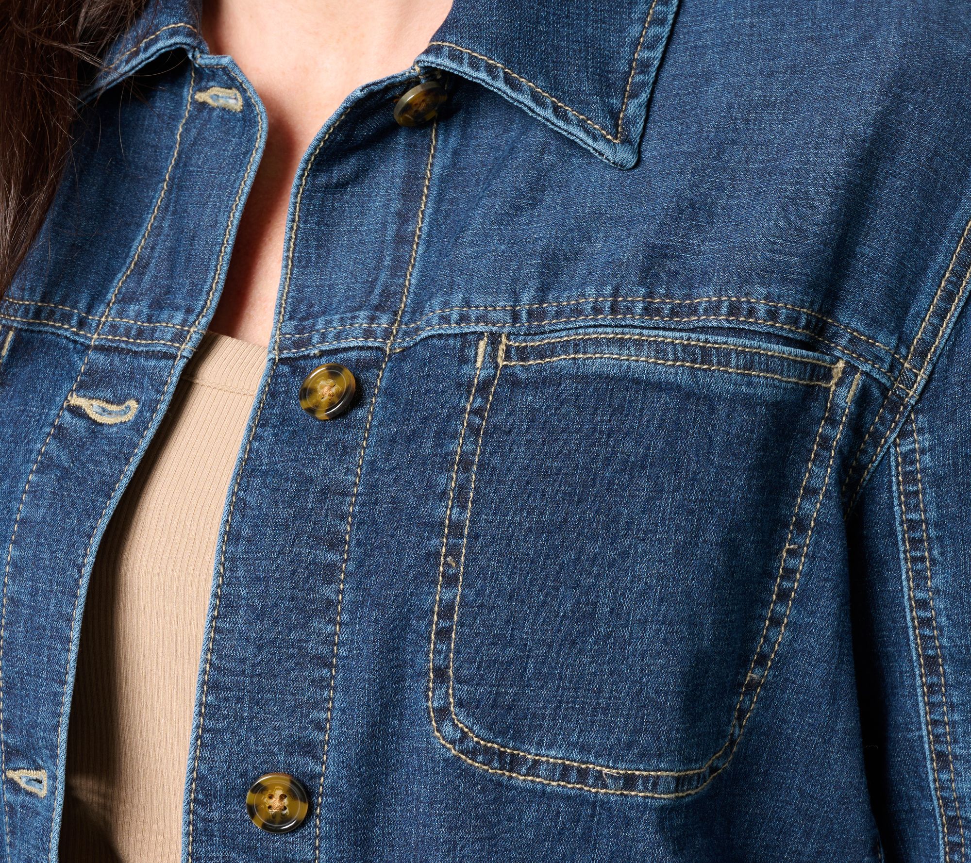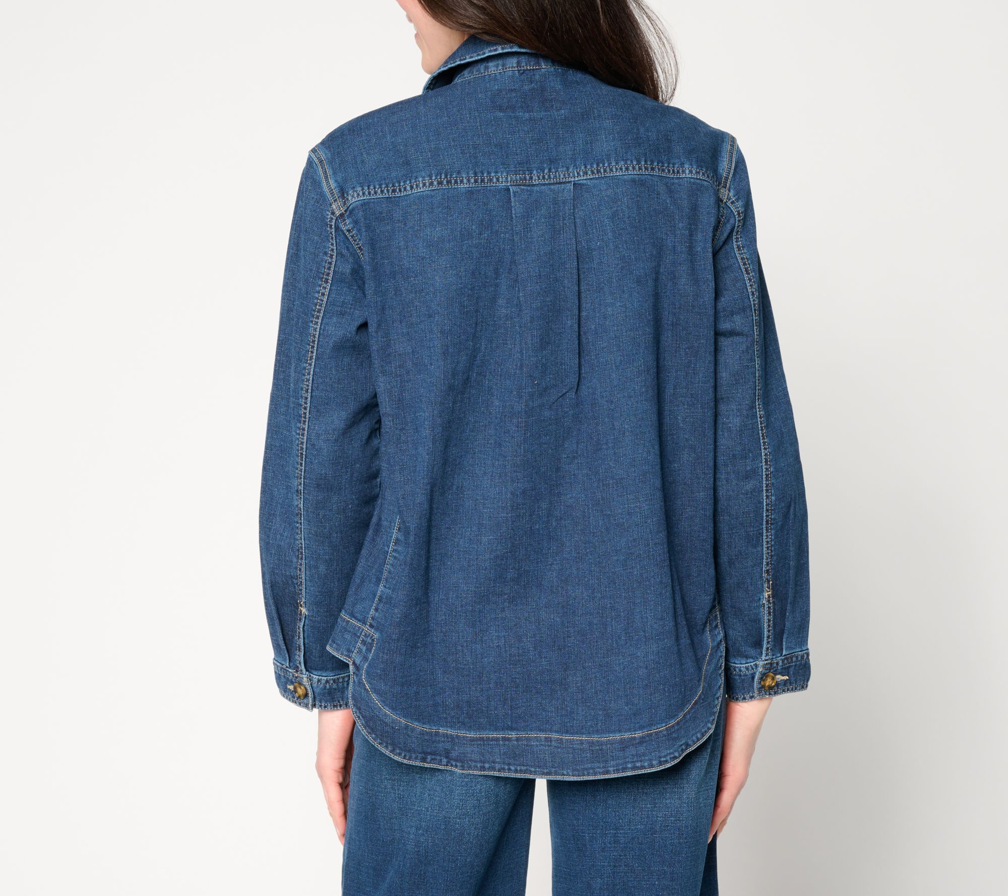 For those brisk mornings that blur into warm afternoons -- from your favorite coffee spot to a stroll in the park -- this weekender shirt jacket adds laid-back comfort and style to your look. Classic details like a point collar, button-front closure, and practical chest and front pockets offer endless outfit possibilities, buttoned or layered over a tee. From Liverpool Los Angeles.