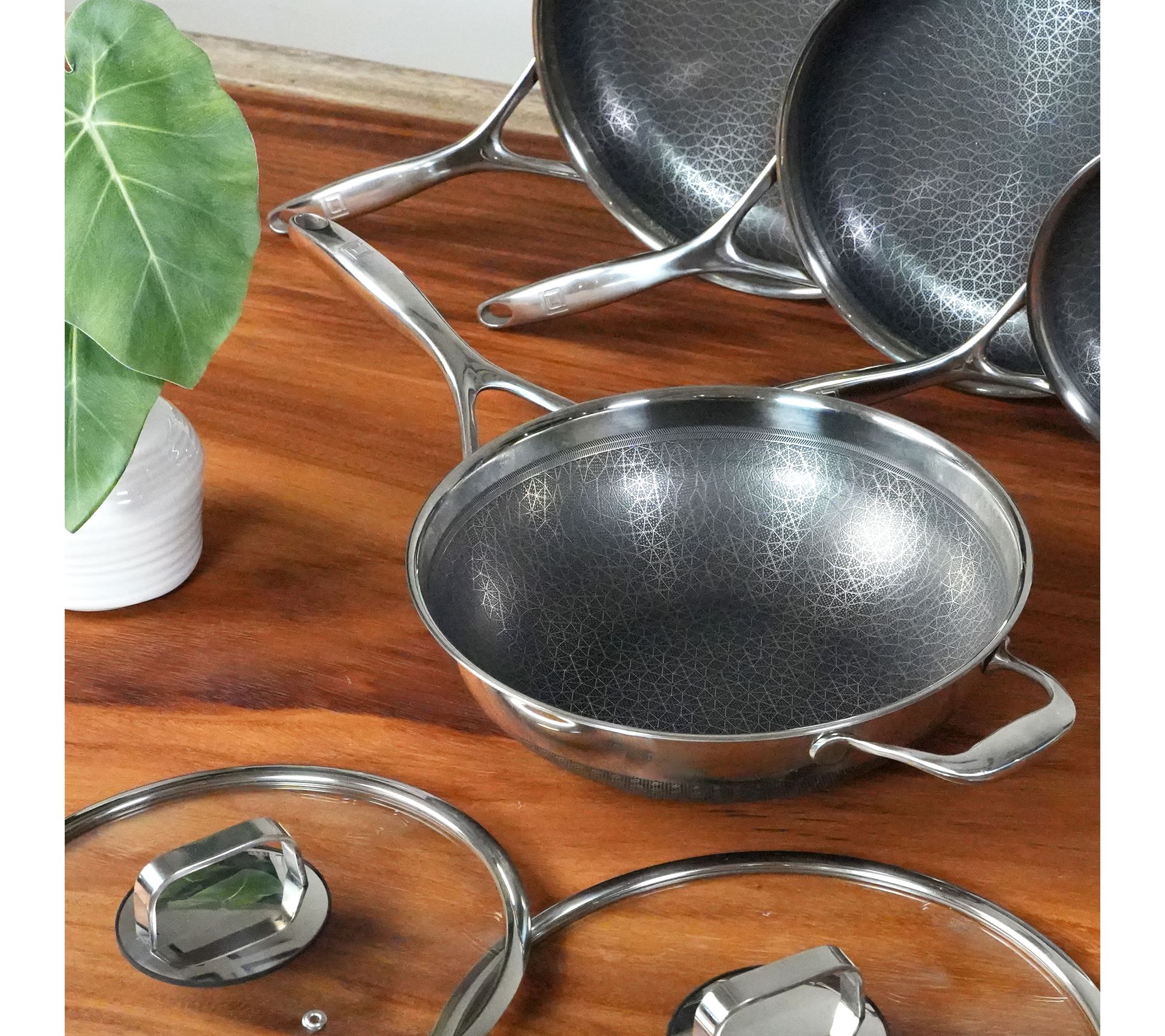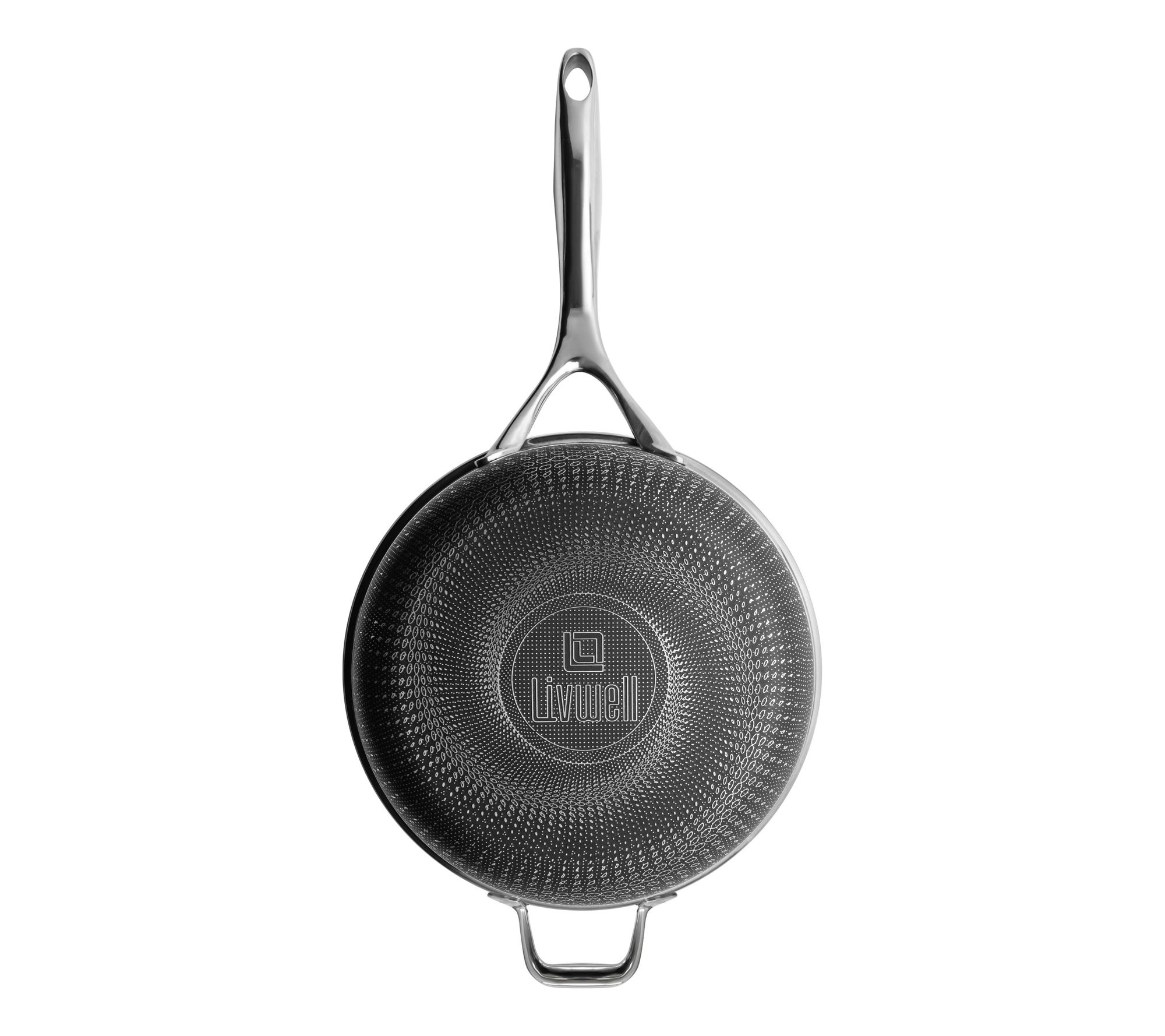 Elevate your cooking game with the Livwell DiamondClad 12" stainless steel nonstick wok pan. This versatile pan features stainless steel peaks and titanium-infused nonstick valleys for superior metal utensil resistance. From Livwell.