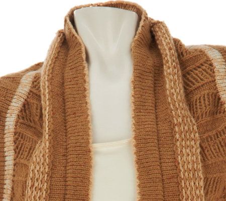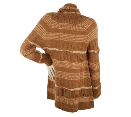 Set the tone. Showcasing a shawl collar, long sleeves and an allover, mixed-stitch, tonal stripe pattern, this open-front sweater makes a chic choice for every day. Pair it with your favorite skinny jeans or a sleek skirt and embrace its warmth and sophisticated style. From Liz Claiborne New York.