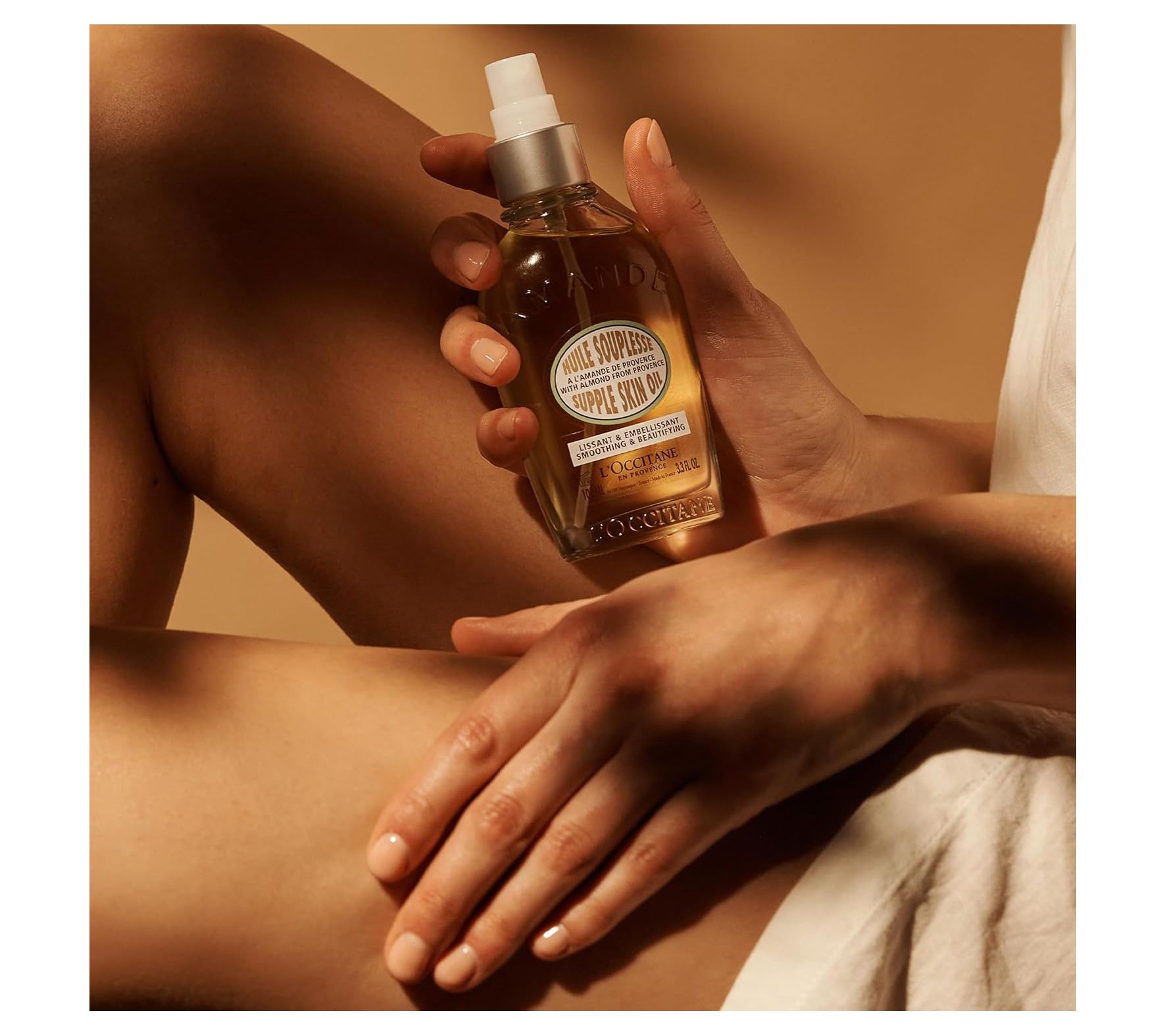Formulated with sweet almond oil, L'Occitane Almond Supple Skin Oil leaves your body feeling decadently soft with the look of a satiny-smooth finish. This fast-absorbing oil melts into skin, delivering hydration and an irresistible aroma of fresh almond and warm vanilla.