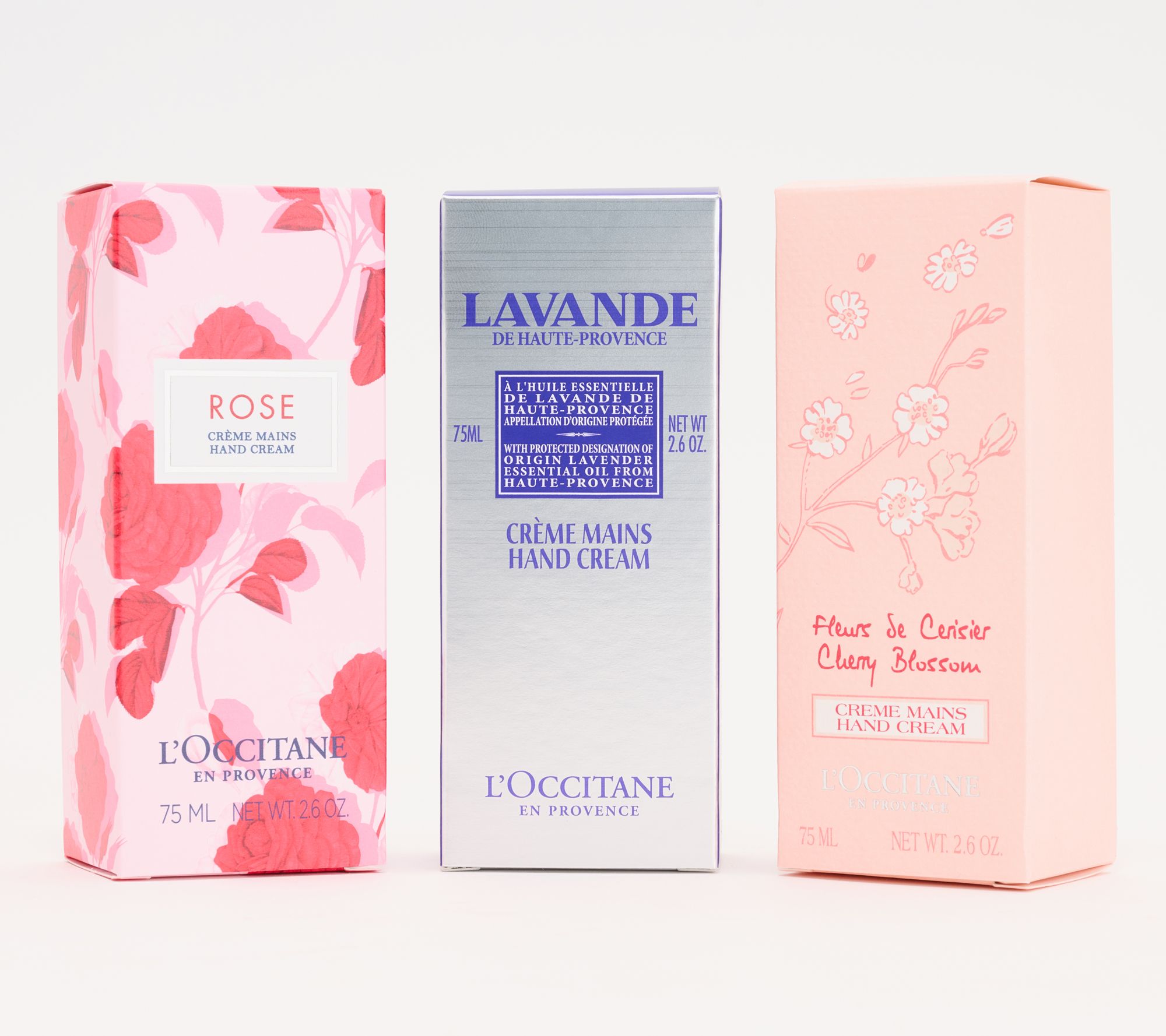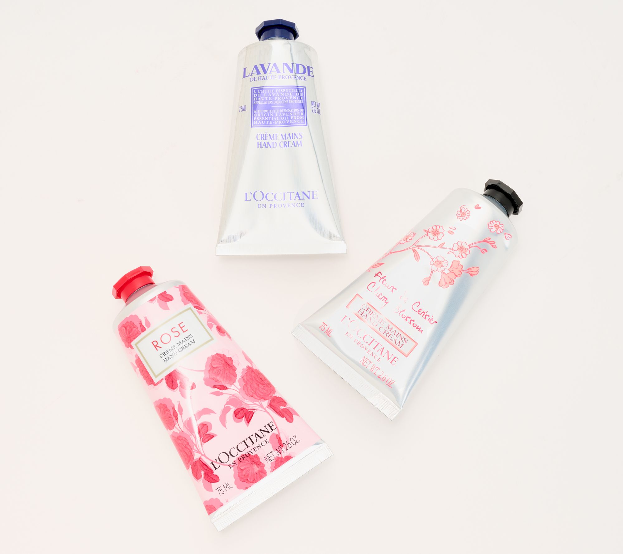 A vibrant trio of some of the most-loved scents of nature, enriched with shea butter, this L'Occitane hand cream kit includes Lavender, Cherry Blossom, and Rose.