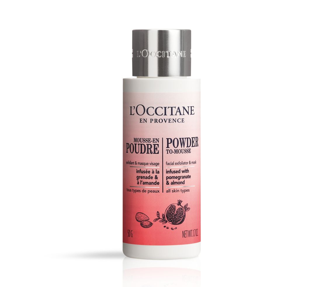 L'Occitane Powder to Mousse Facial Exfoliator is ideal for all skin types. This innovative exfoliating powder transforms into a sparkling mousse on contact with water to deeply cleanse the skin. Infused with exfoliating fruit enzymes, flower acide, and almond proteins, this hybrid formula gently removes dead cells. Immediately, skin looks radiant and feels incredibly soft and smooth.