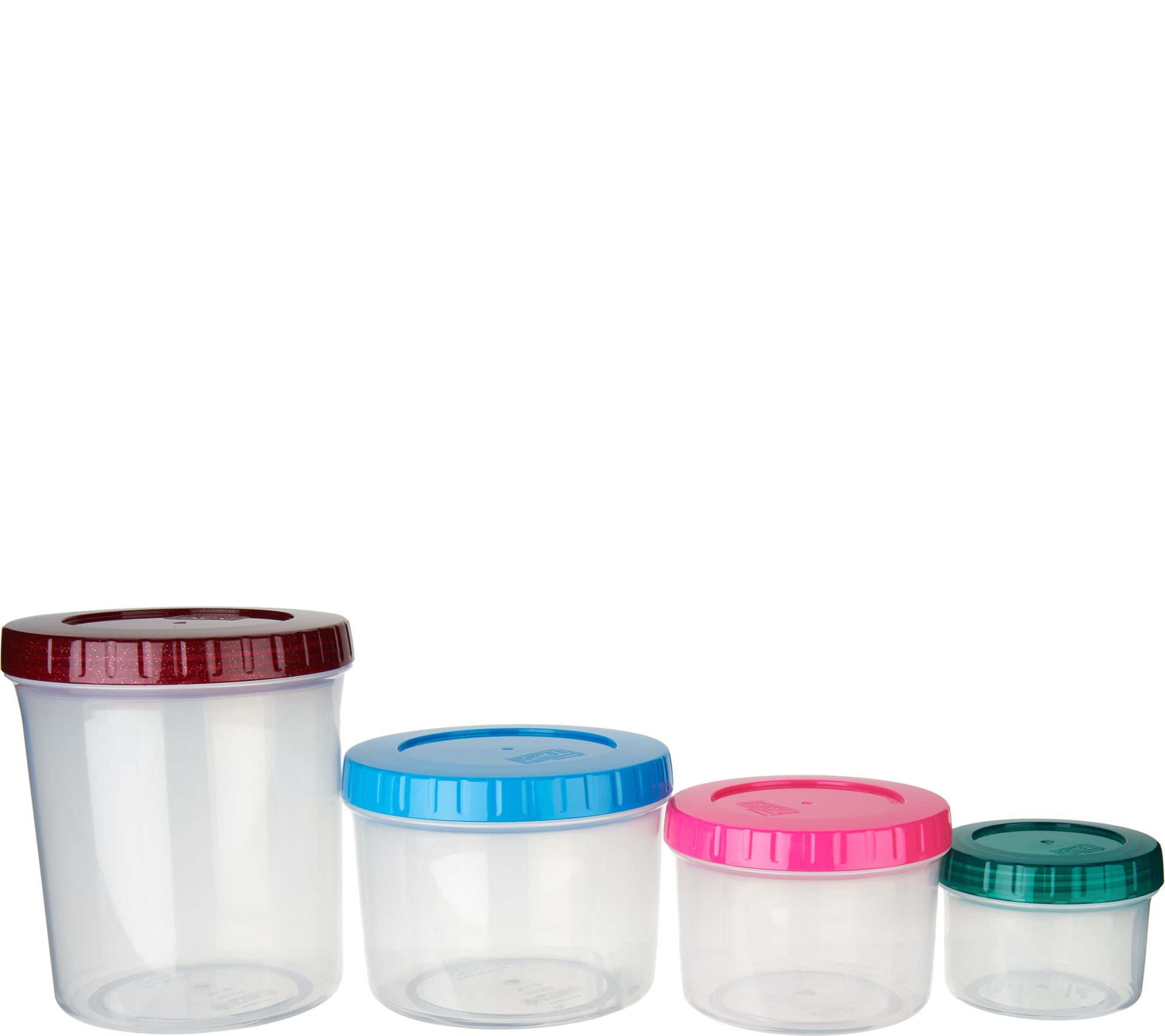 Includes 12 containers with 12 twist lids: three 0.6-cup containers, three 1.5-cup containers, three 2.7-cup containers, and three 4.2-cup containers