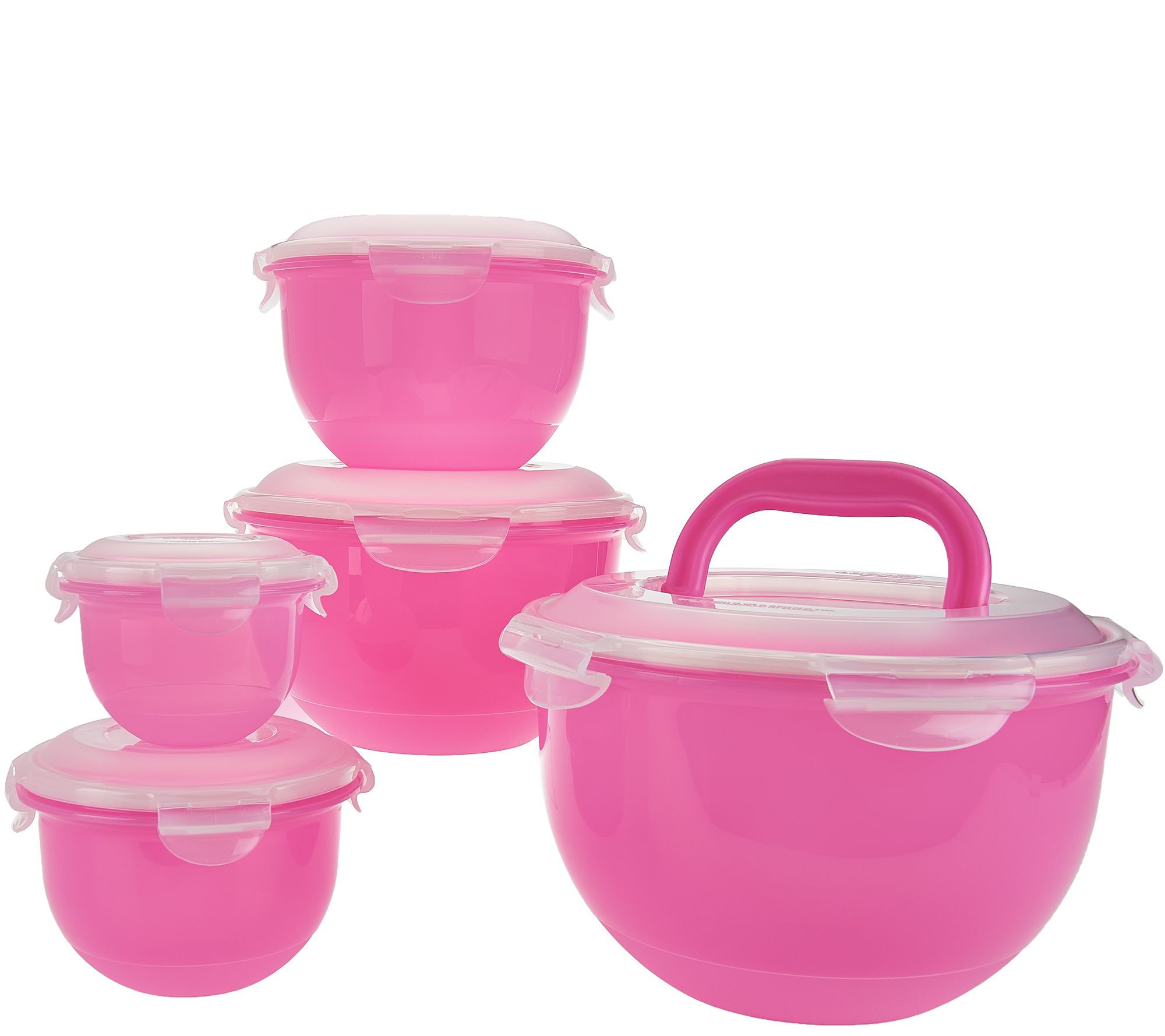 Storage in every size. This five-piece Tulip Bowl set from Lock & Lock has all your kitchen storage needs covered, with 36 cups of total storage between the five bowls. Store tons of soup or sauces in the huge 16-7/8-cup bowl--it even features a handle for safe toting. And you know your food is secure and fresh thanks to the locking lids. From Lock & Lock.