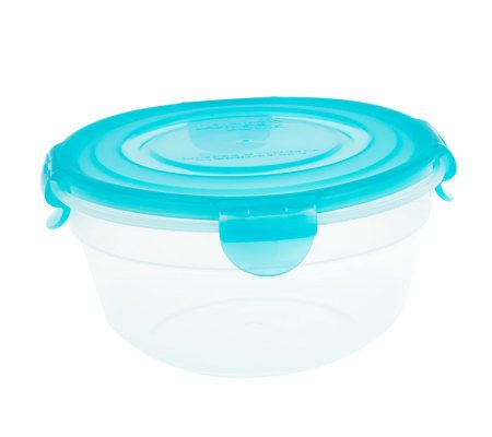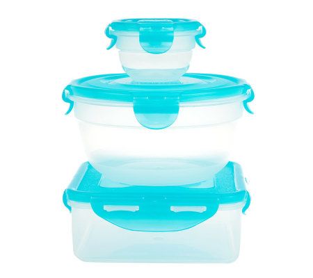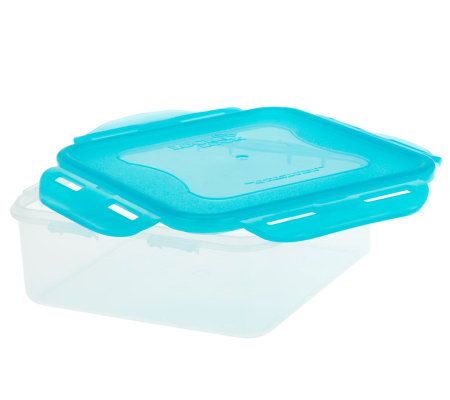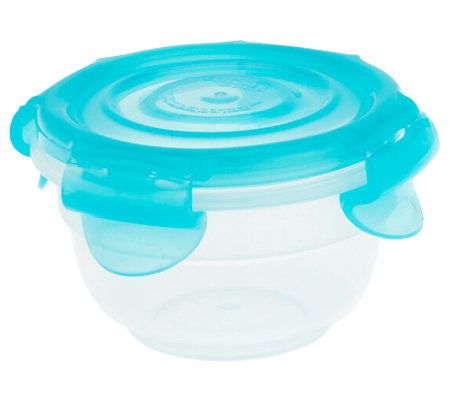 Containers: four-hinge locking lids; freezer-, microwave-, and top-rack dishwasher-safe