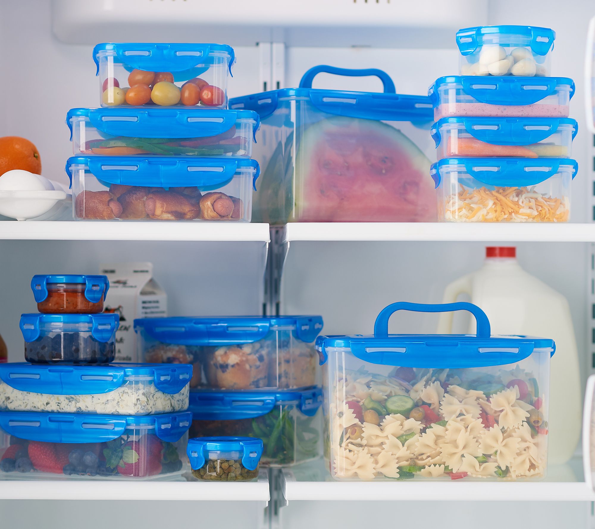 Includes two 19-cup rectangular containers with handled lids, two 4-1/4-cup rectangular containers, two 6-cup rectangular containers, two 3-1/2-cup rectangular containers, two 2-1/2-cup rectangular containers, two 1-1/2-cup rectangular containers, two 1-1/4-cup round containers, and two 1/2-cup round containers