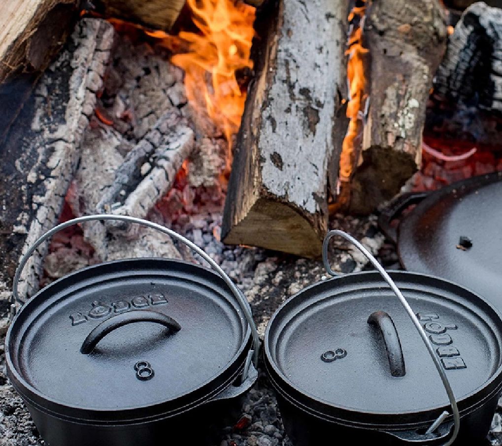 Whether you're making a pot of chili at the campsite or creating a delicious stew in your oven, this thoughtfully designed cast iron dutch oven is your go-to cookware, featuring a sturdy handle and feet that allow it to be used over coals. From Lodge.