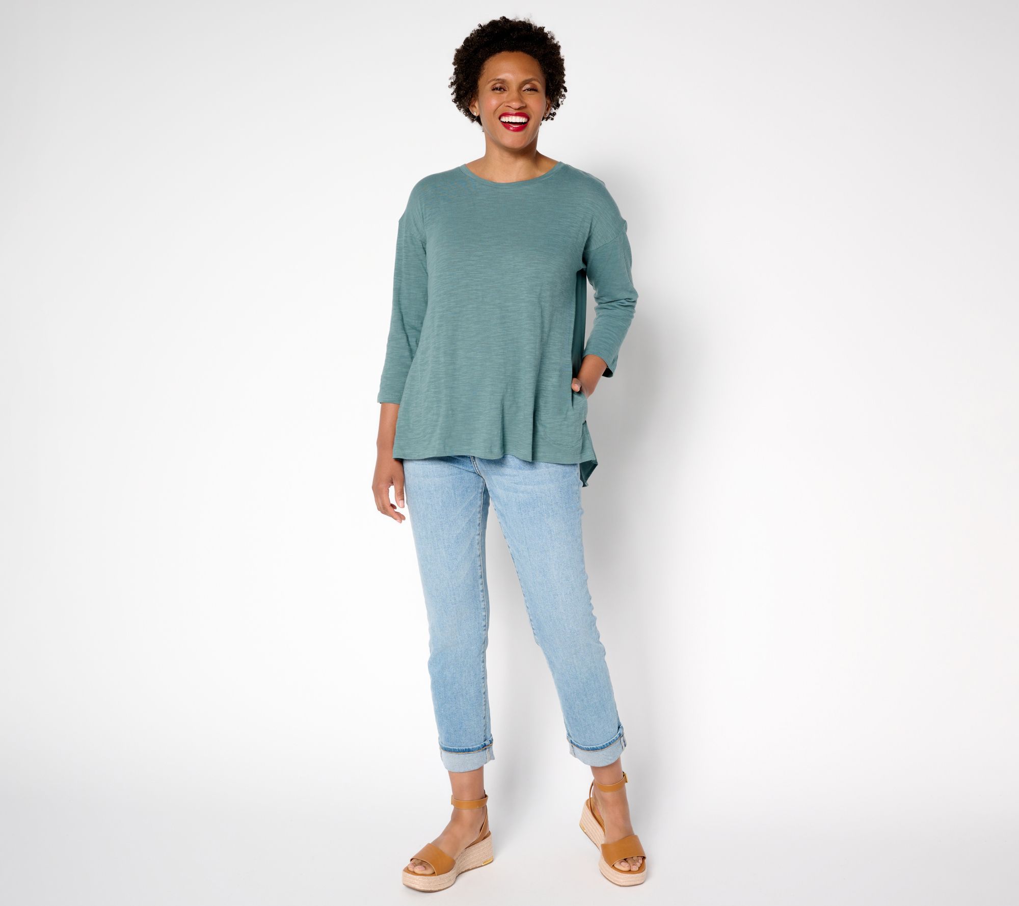 Cue up cool, carefree style for your next coffee run or creative day out with this LOGO A-line top. The 100% cotton body feels soft against your skin, while the modal back, side pockets, and drop-shoulder sleeves add interest from every angle. Top off straight-leg crops and slides for easy mornings or toss it over leggings and thongs for laid-back afternoons. From LOGO by Lori Goldstein®.