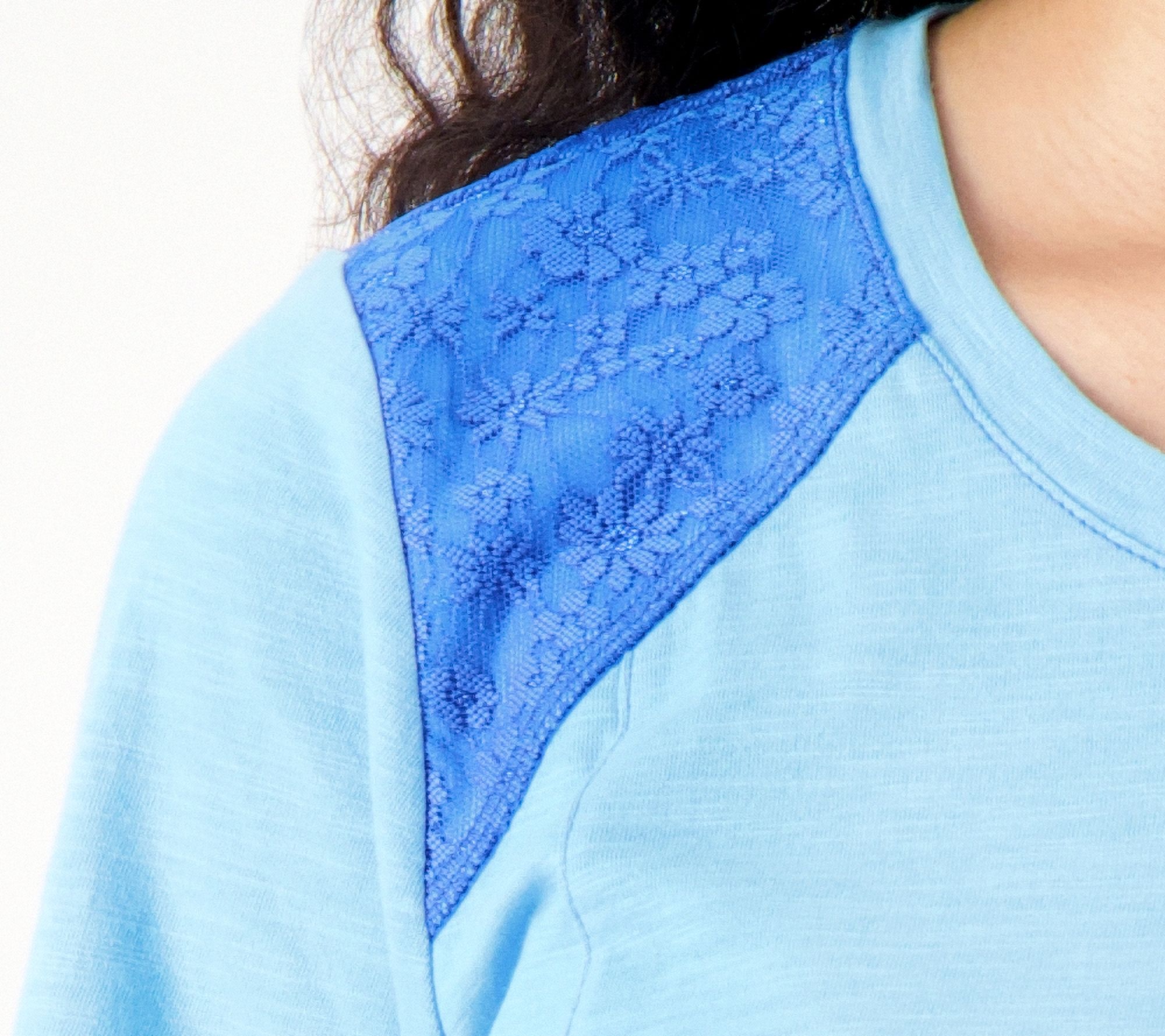 • Features: scoop neckline, short sleeves, on-seam pockets, lace trim detail at front and back yoke and bottom hem