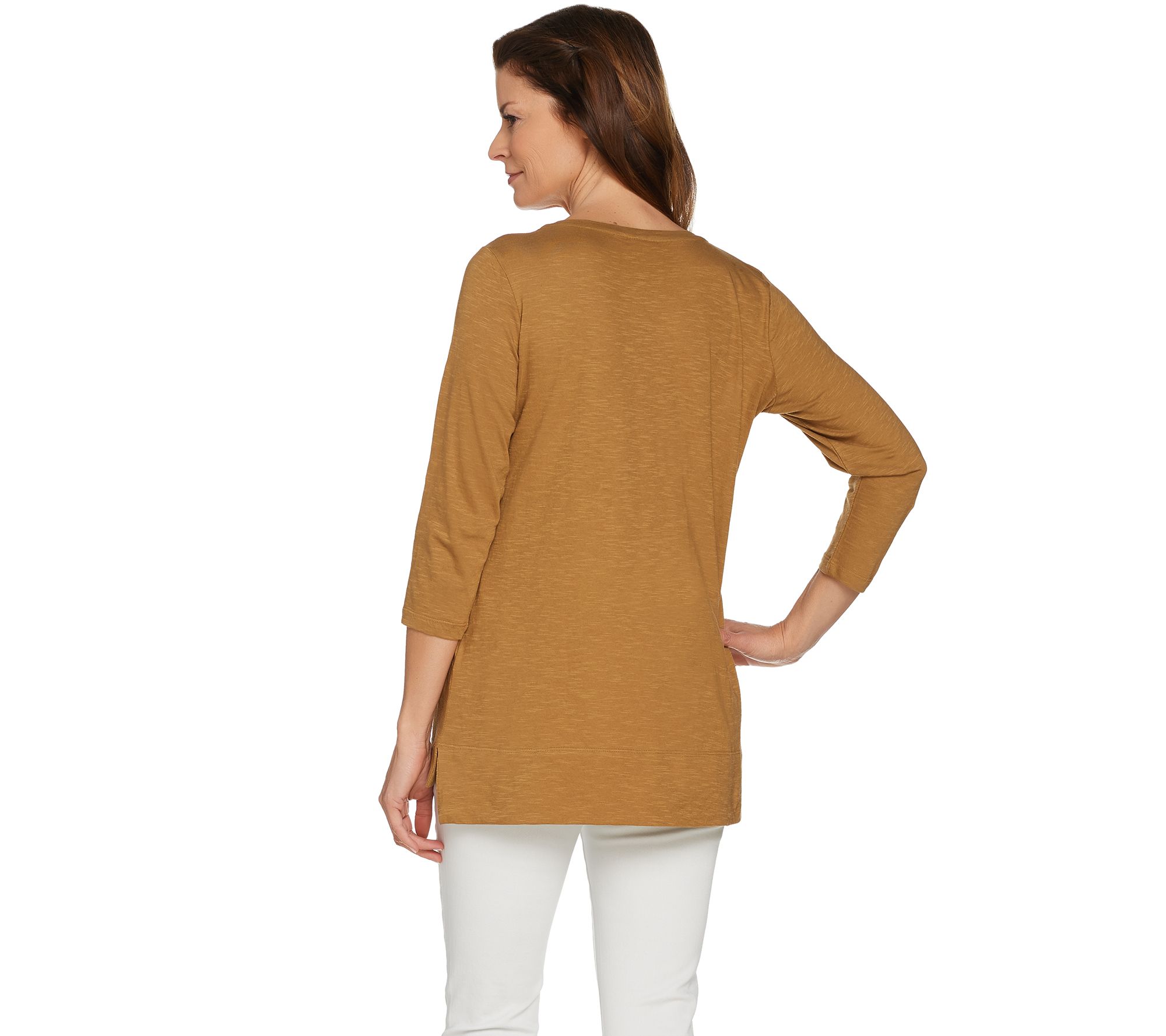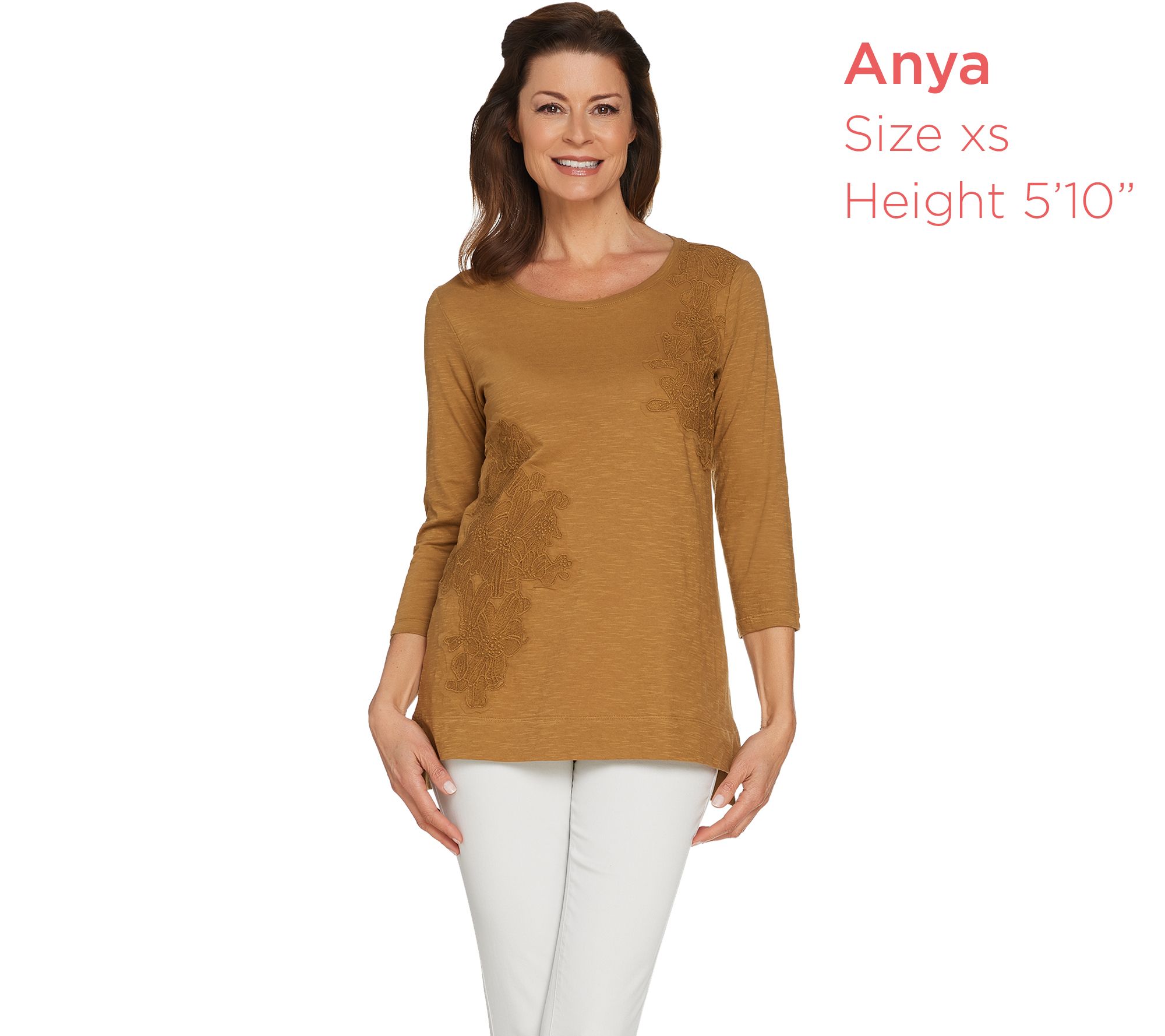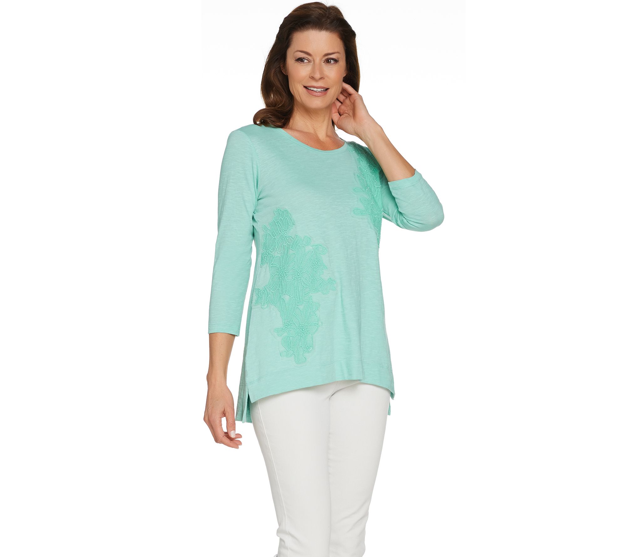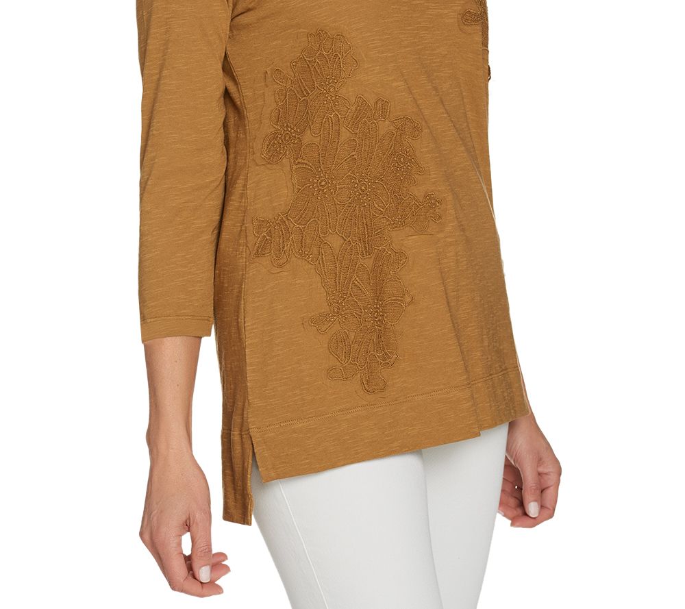 • Features: scoop neckline, front embroidered applique, 3/4-length sleeves, hi-low straight bottom hem with side slits
