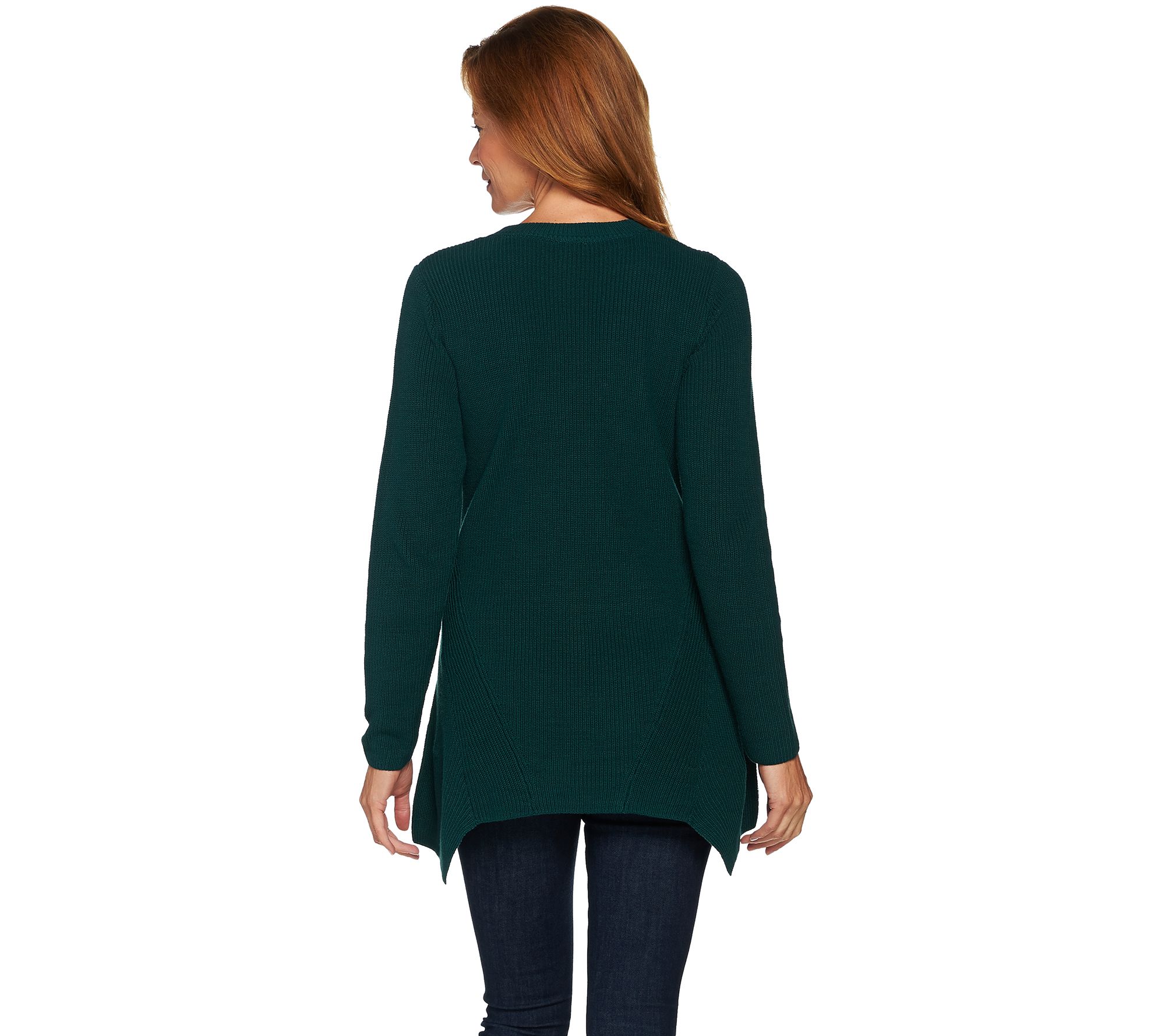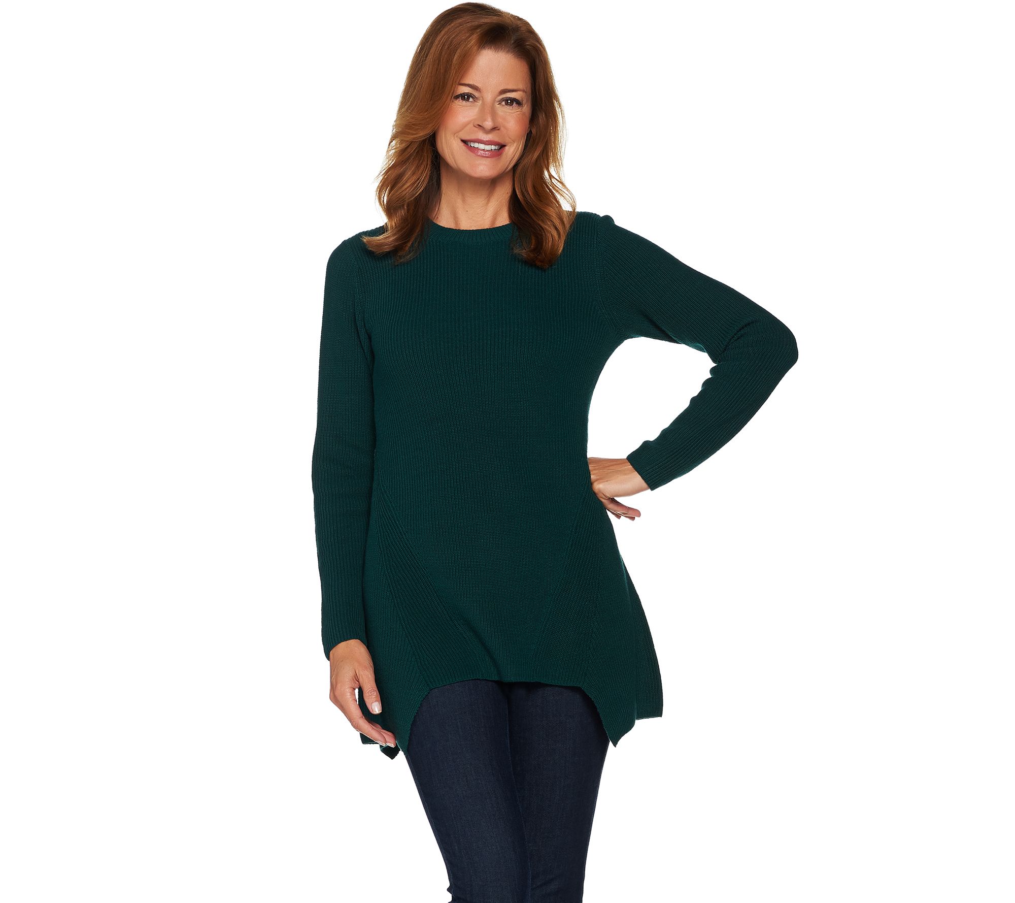 Don't over think it, just get dressed. You'll always look polished and put together in this crew neck LOGO sweater. It covers you in warmth--and in all the right places--with an asymmetric hem for visual interest and feminine flair. From LOGO by Lori Goldstein.
