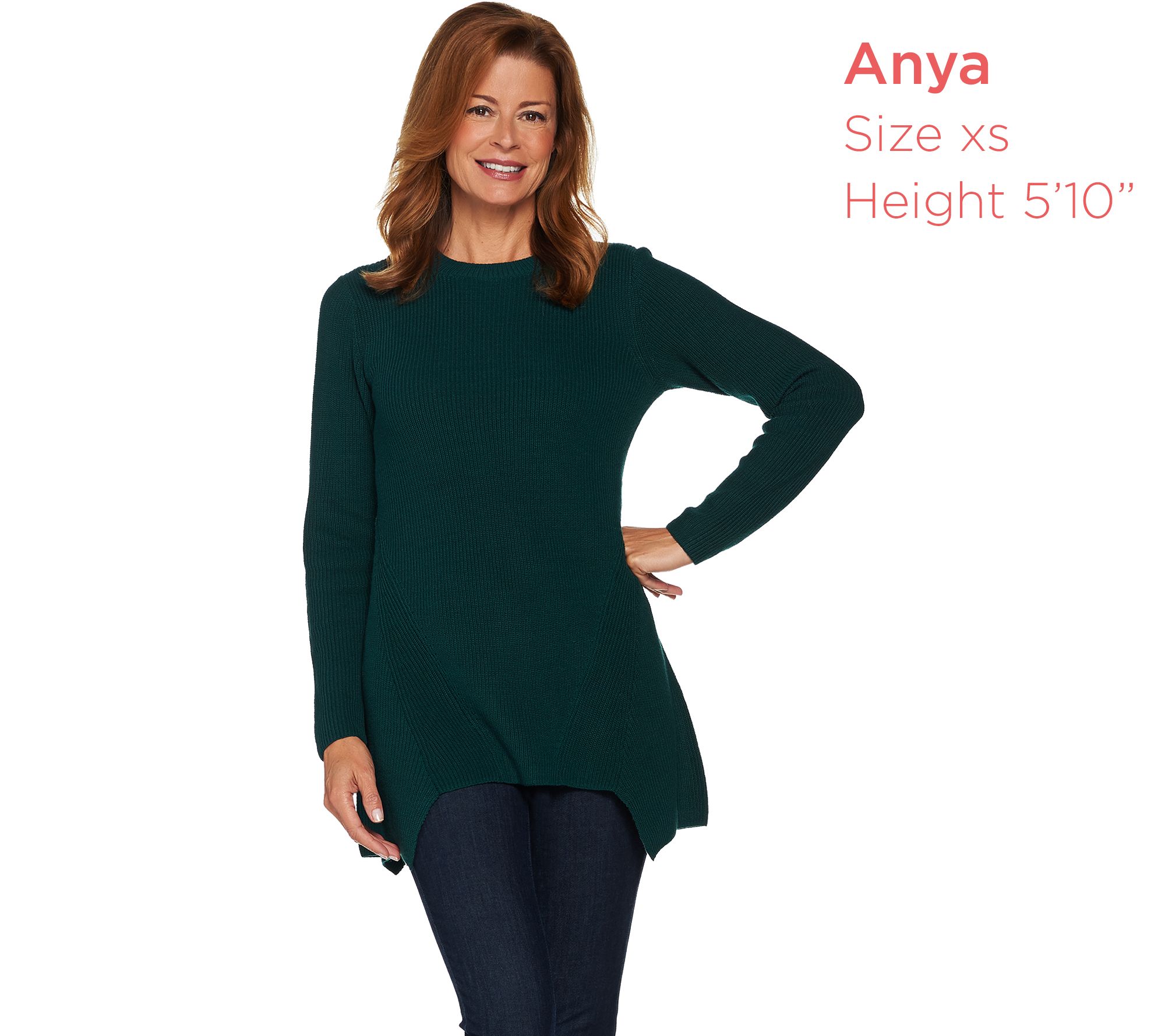 Features: ribbed crew neck, long sleeves, asymmetric hem