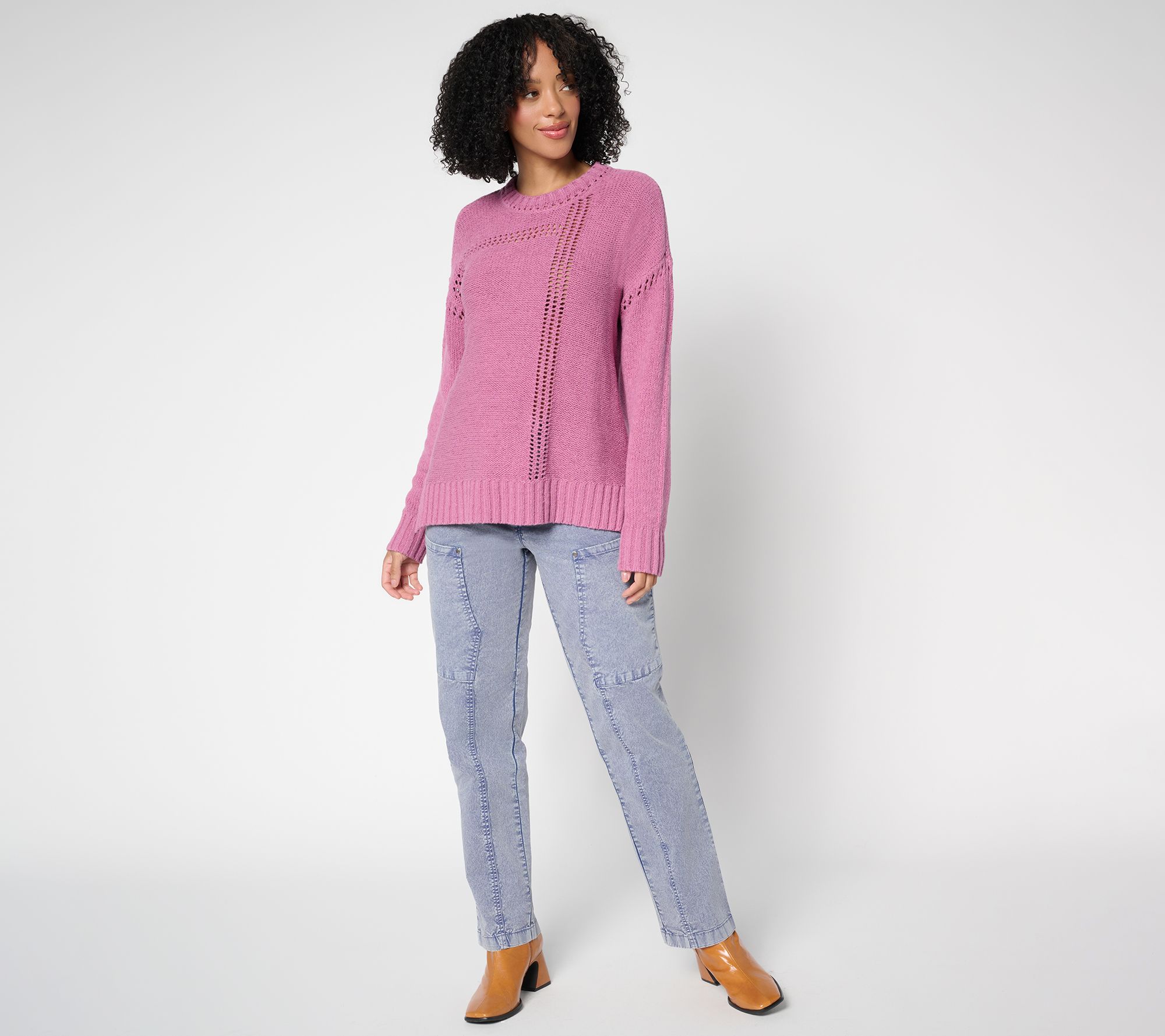 Ready to refresh your sweater rotation? This crewneck pullover catches the eye with openwork pointelle detailing at the neck, sleeves, and body, finished with ribbed trims and side slits for ease of movement. Layer it over a button-down for an office-ready look or style solo with denim for effortless weekend vibes. From LOGO by Lori Goldstein®.