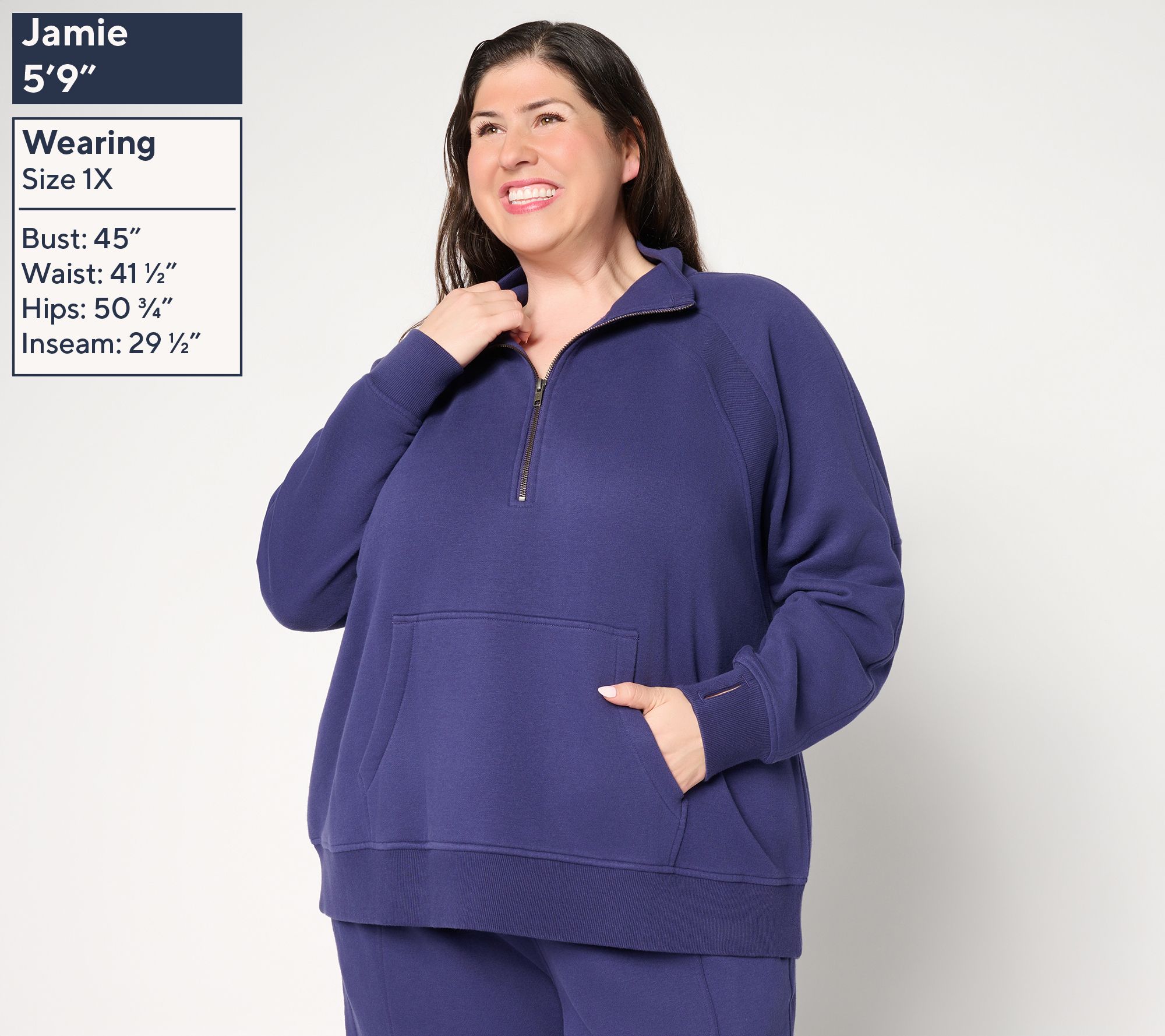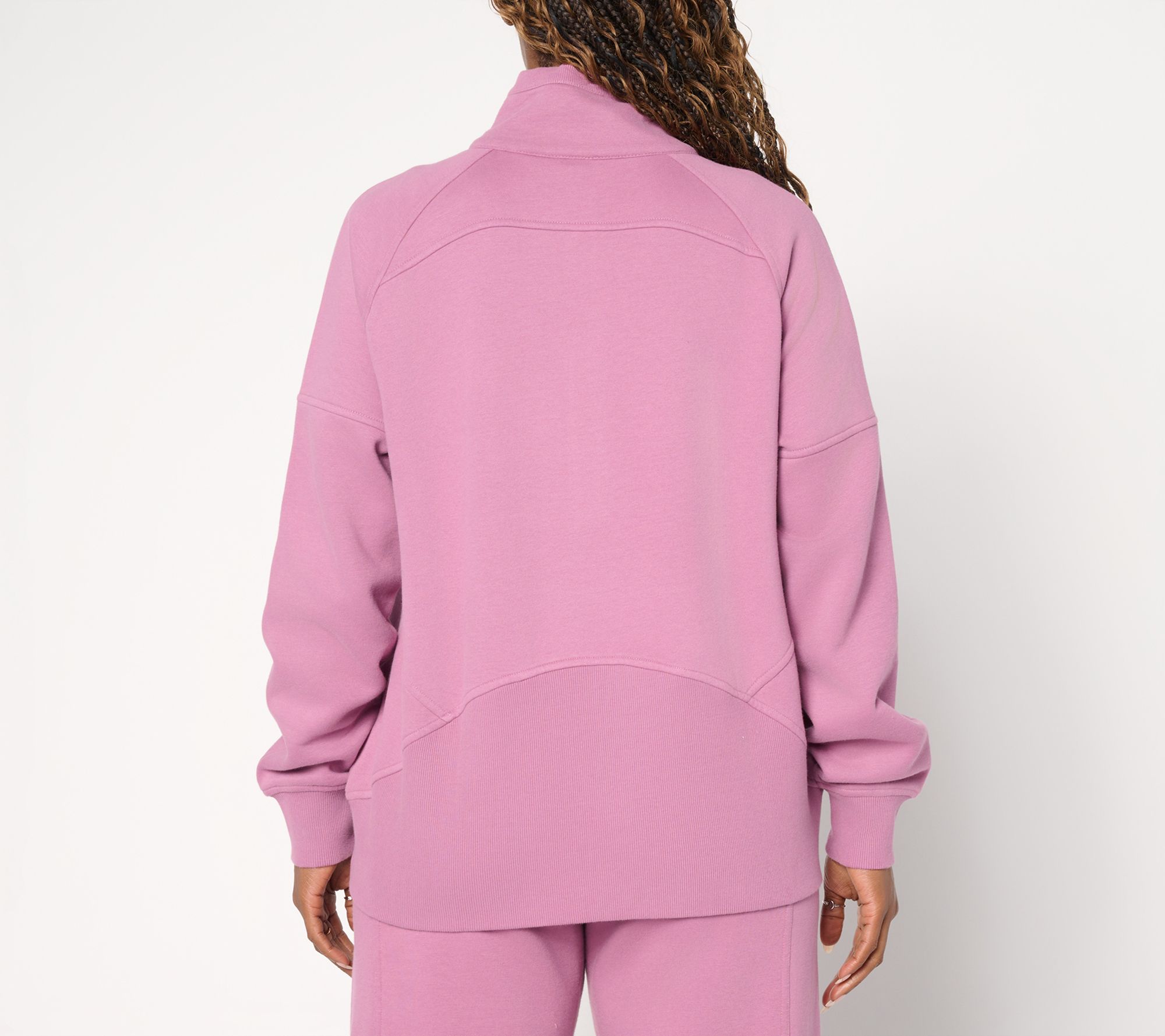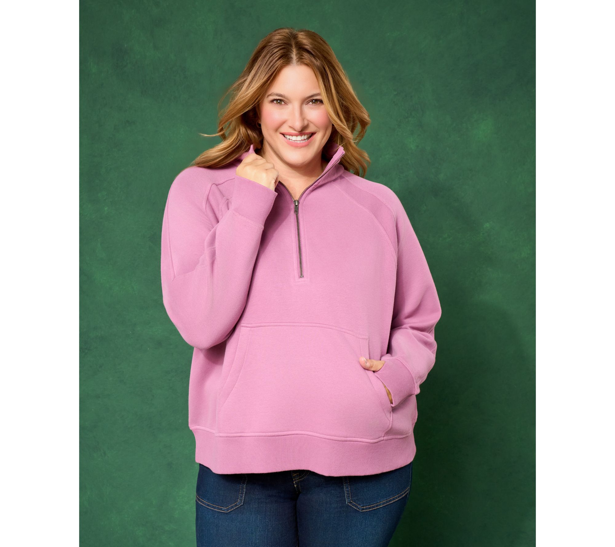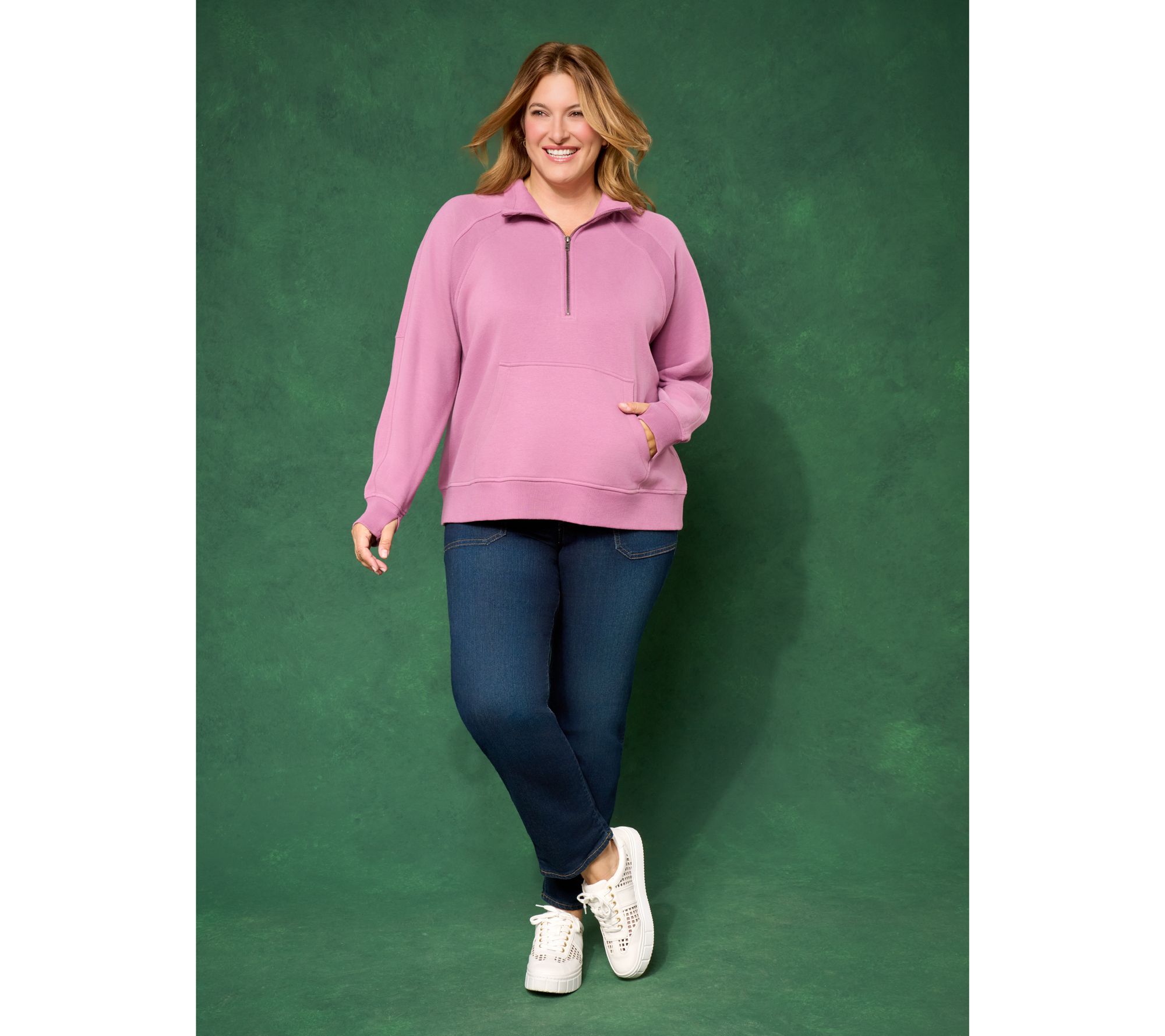 On chilly afternoons or slow Sunday mornings, this plush terry sweatshirt feels like a cozy retreat. The collar zipper lets you adjust airflow or style, while the raglan sleeves and handy kangaroo pocket make for easy layering while out or lounging at home. Ribbed cuffs and hem add a comfortable finish to a laid-back essential. From LOGO by Lori Goldstein®.