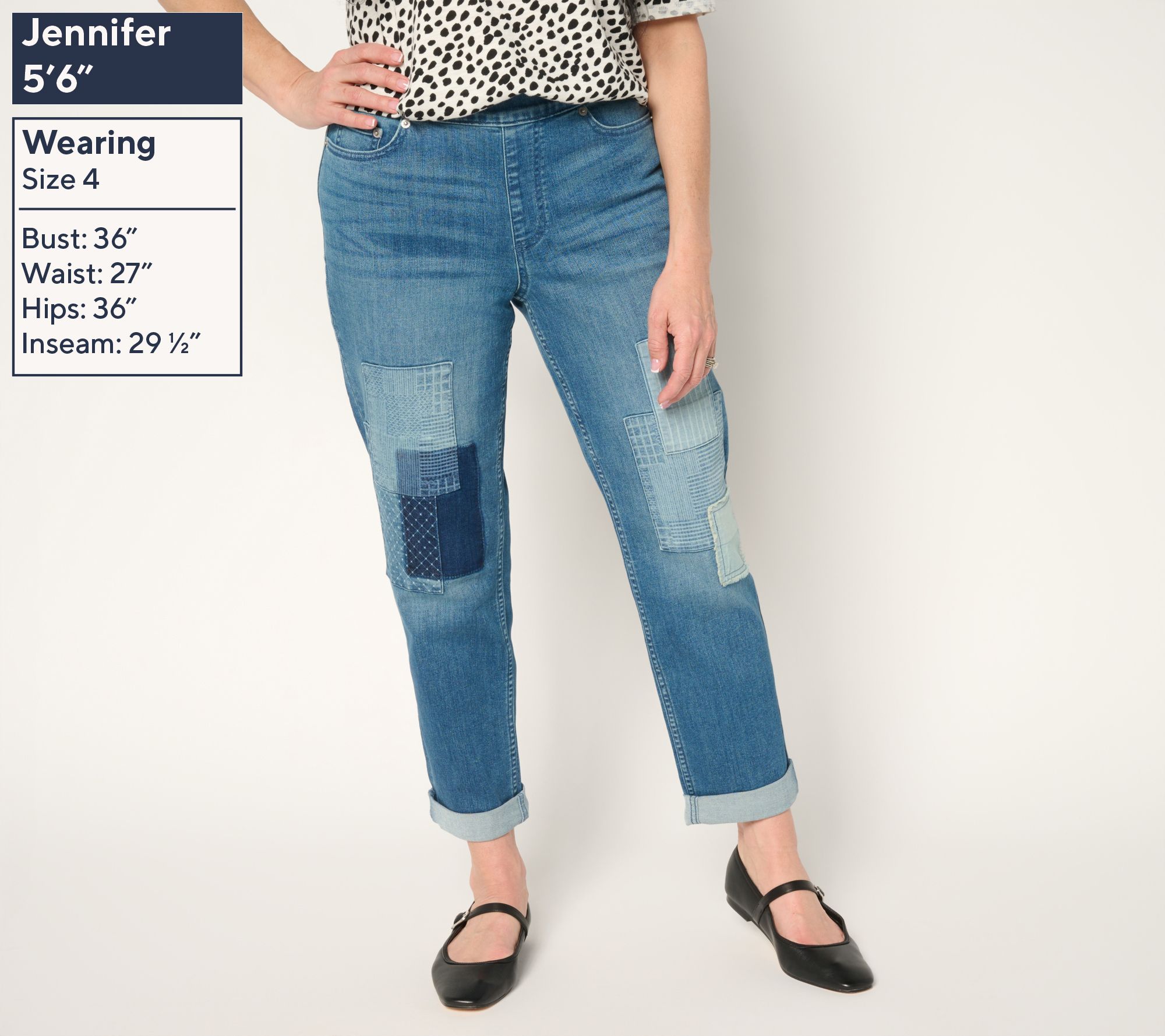 Casual date night to picnics in the park -- this boyfriend is ready for any adventure! Peppered with playful patchwork, these pull-on jeans exude an artsy aethestic and a fresh departure from basic bottoms. (This one's a keeper!) From LOGO by Lori Goldstein®.
