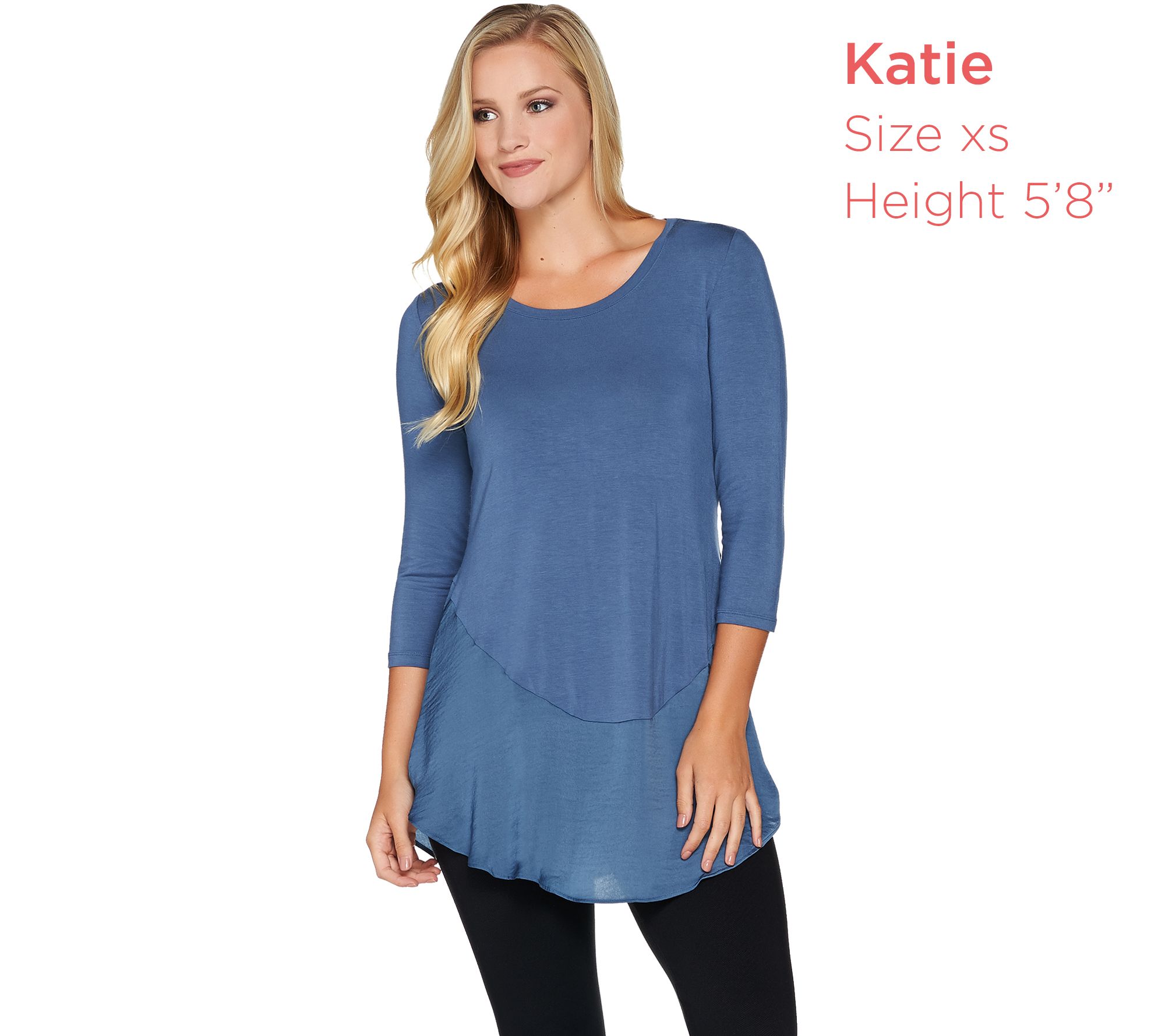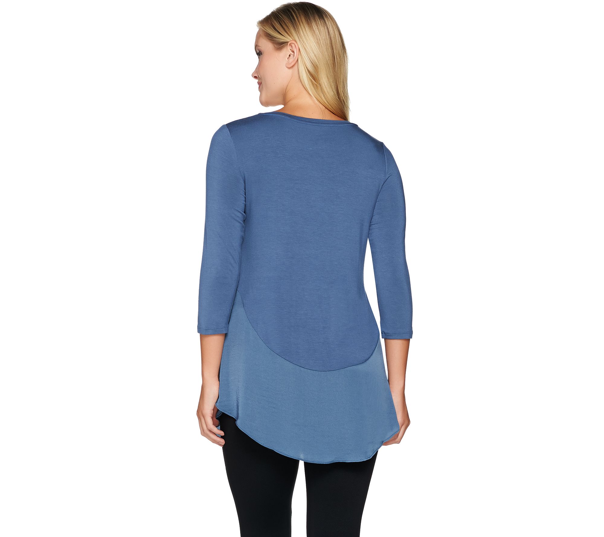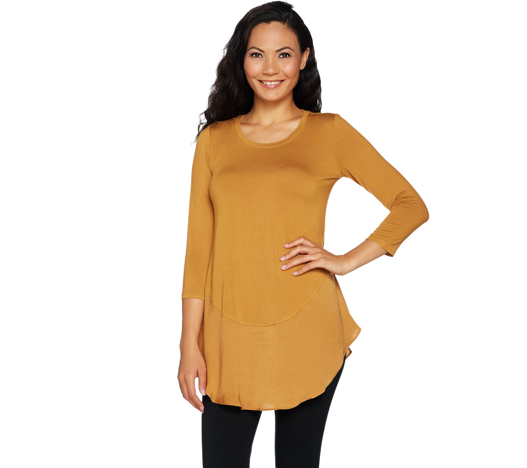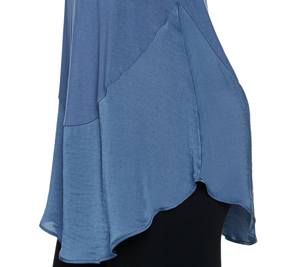 You have curves, and so does this trend-forward top from LOGO by Lori Goldstein. Complemented by a scoop neckline, the flattering knit design is trimmed with a satin curved hem so you can go with the flow in fabulous style. From LOGO by Lori Goldstein(R).