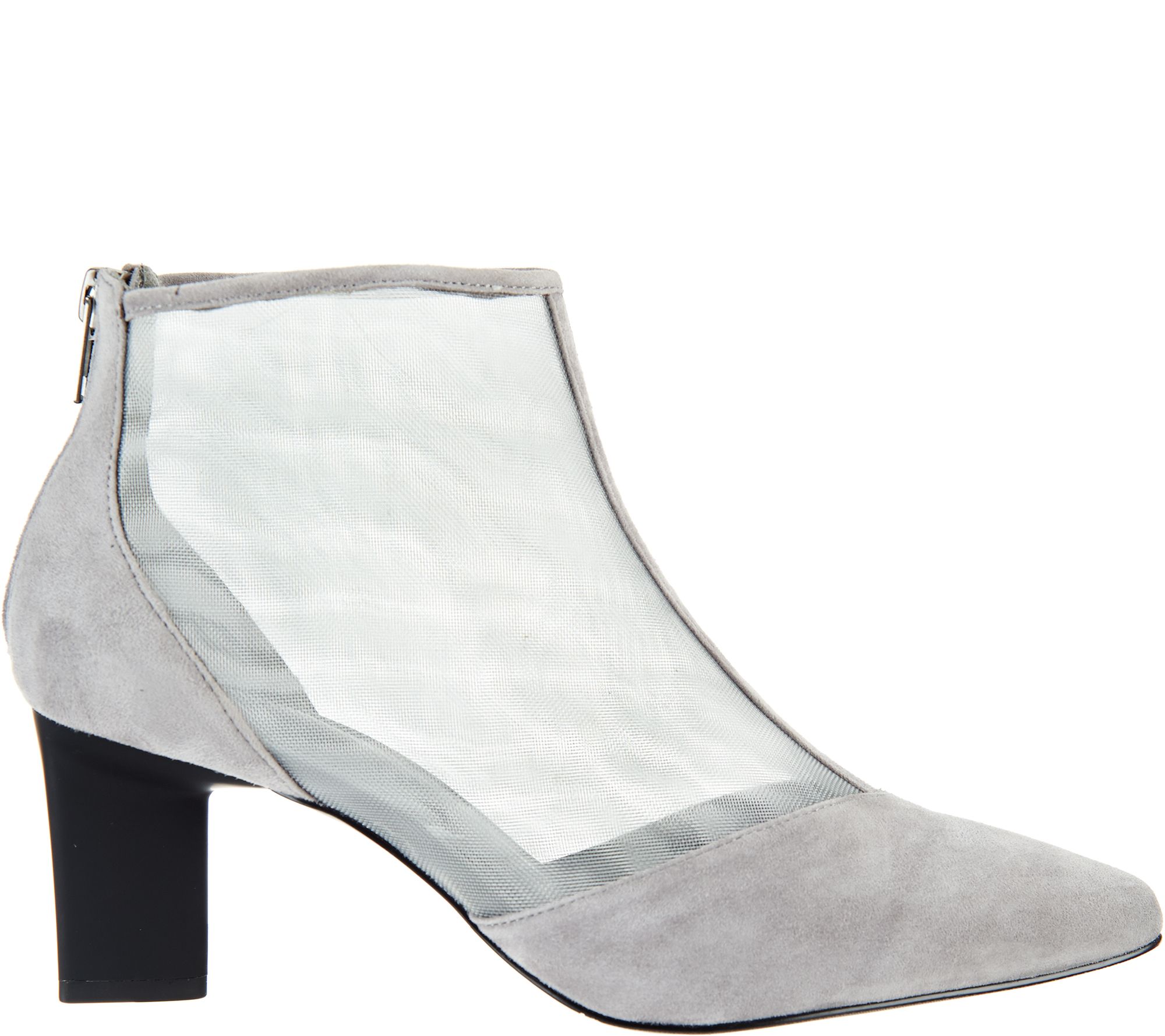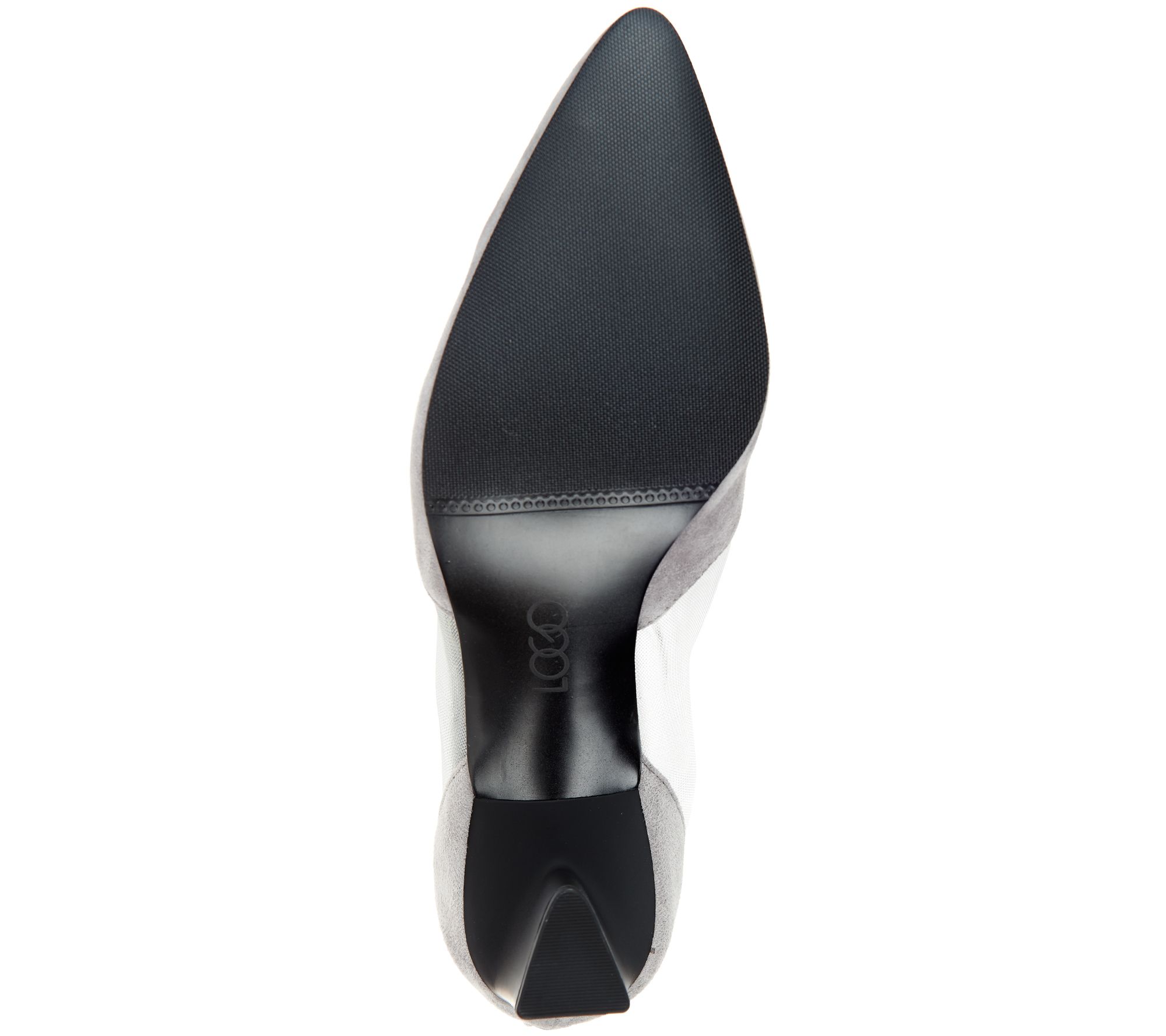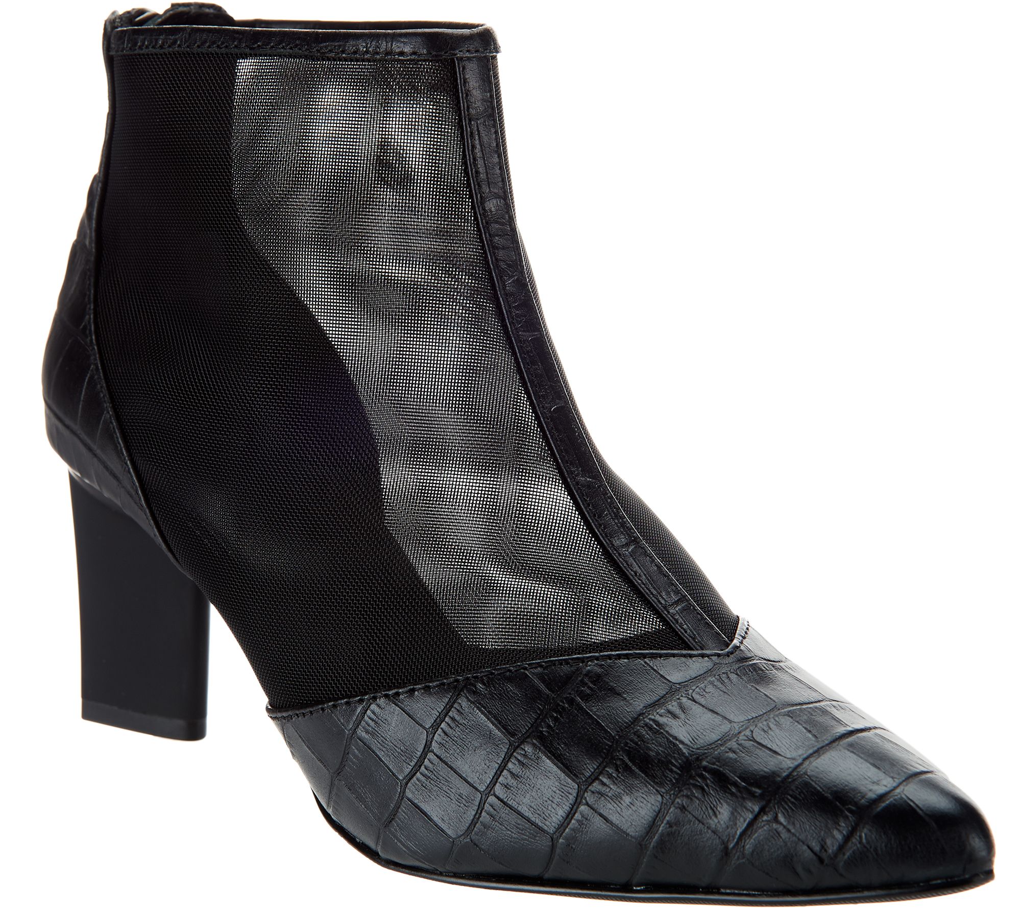 Break free from bulky boots with this breezy style from LOGO by Lori Goldstein. The runway-ready ankle boot gets its lighter look from a mesh design with leather seam details. A triangle block heel puts a little lift in your step. From LOGO by Lori Goldstein(R).