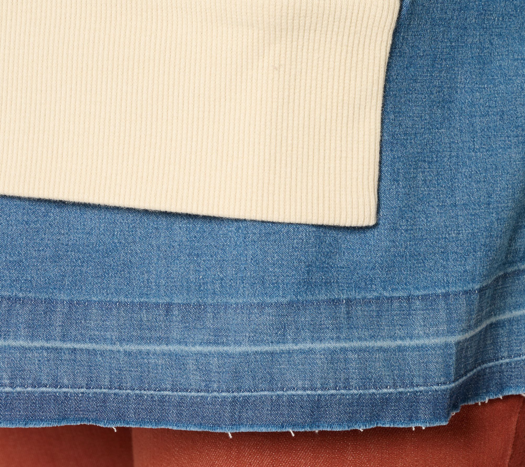 • Features: long sleeves; rib trim at front neckline, front cuff, and front bottom hem; side entry pockets with stitched rib trim; released hem with separate frayed detail hem