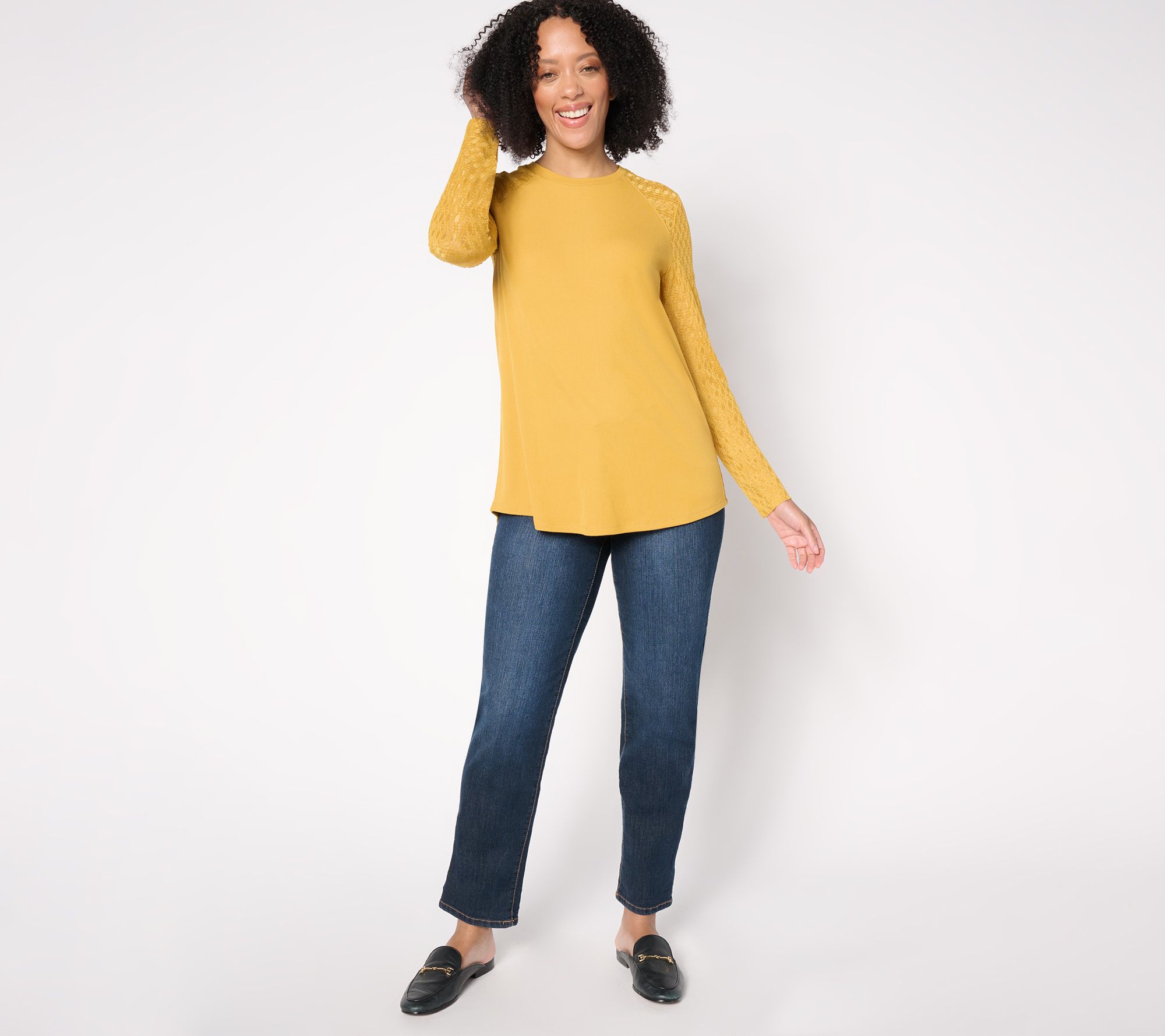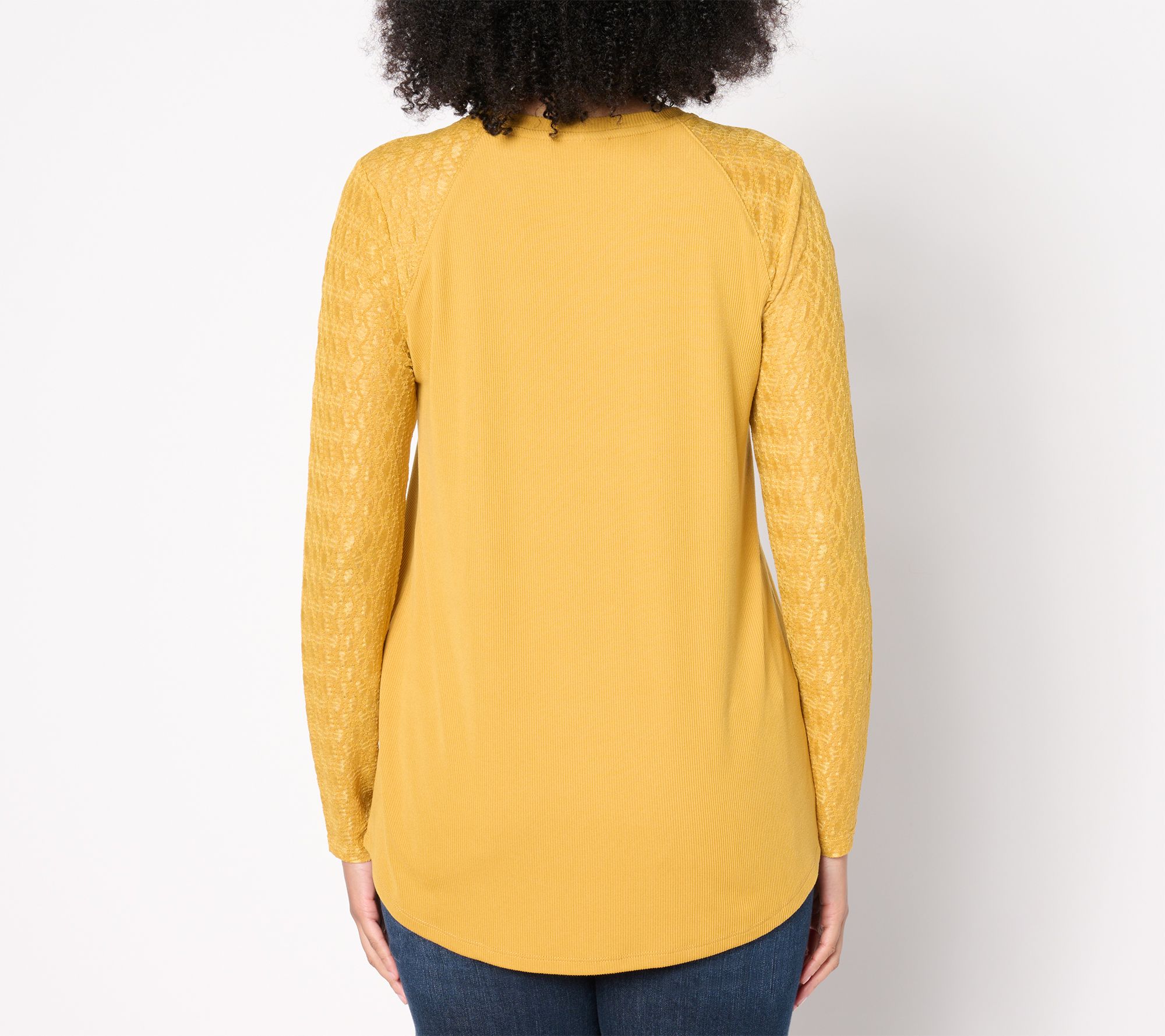 Make a statement with the LOGO by Lori Goldstein long sleeve rib and lace mix top. This top features delightful lace accents at the yoke and sleeves, adding a touch of elegance to a casual day out. Effortlessly pairing style with comfort, the semi-fitted design ensures you look chic while feeling great. From LOGO by Lori Goldstein®.