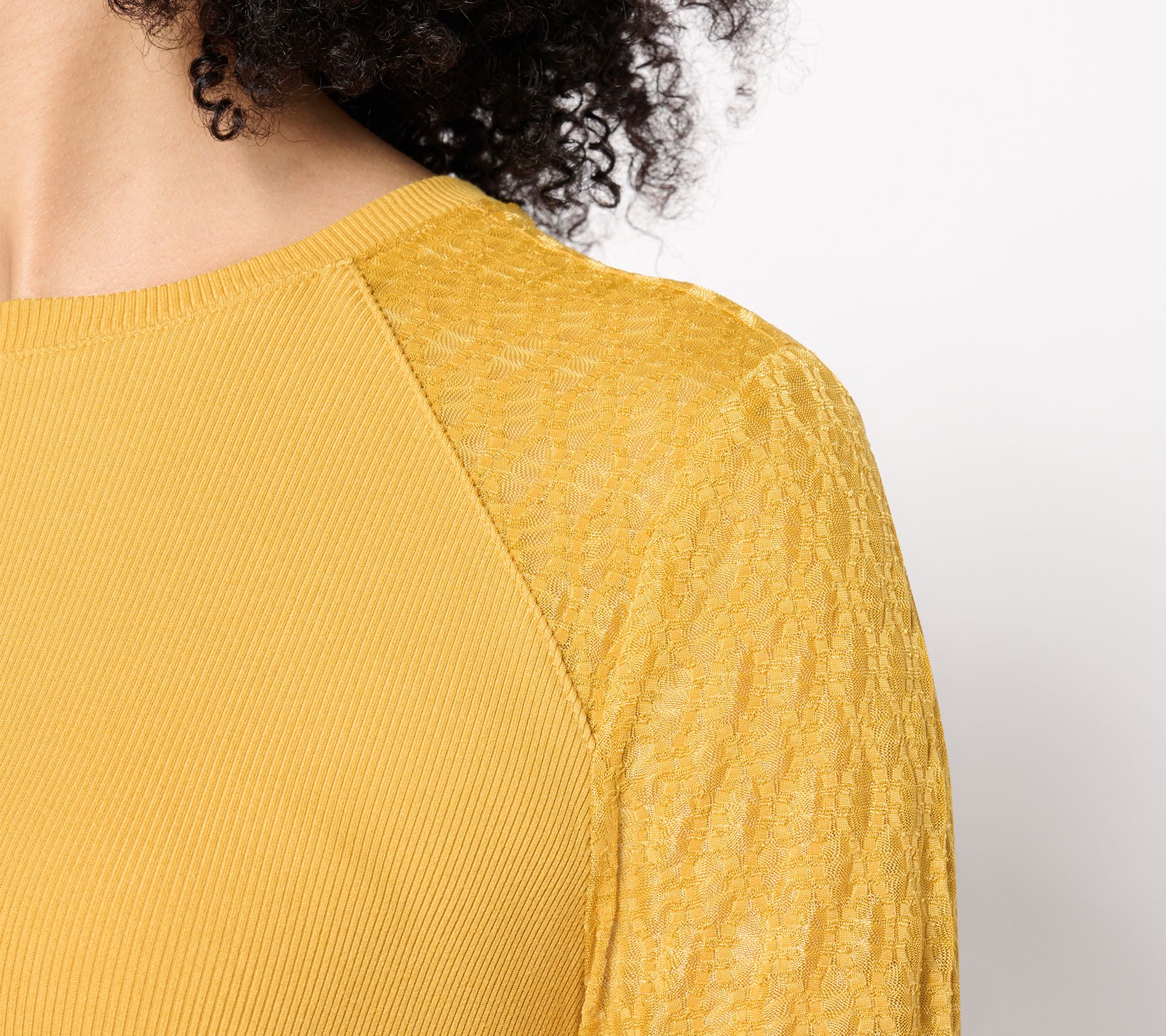 Features: crew neck, long sleeves, rib, lace at yoke and sleeves