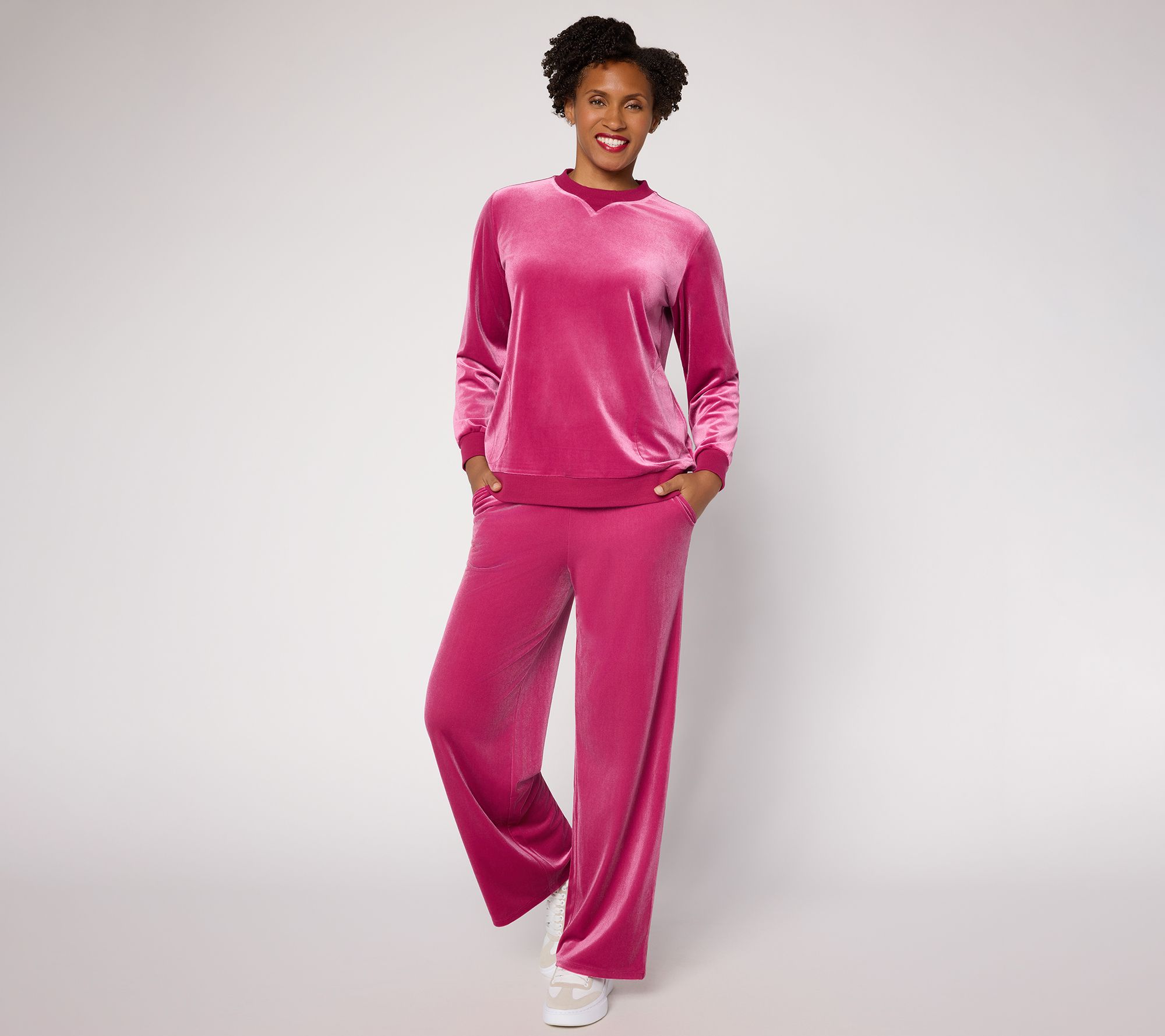 Give casual days a dose of luxe with this long-sleeve velvet sweatshirt, designed for comfort whether you're catching up with friends or relaxing at home. Side pockets keep essentials close, while ribbed trim at the neckline and sleeves adds a subtle finish to the plush feel. From LOGO by Lori Goldstein®.