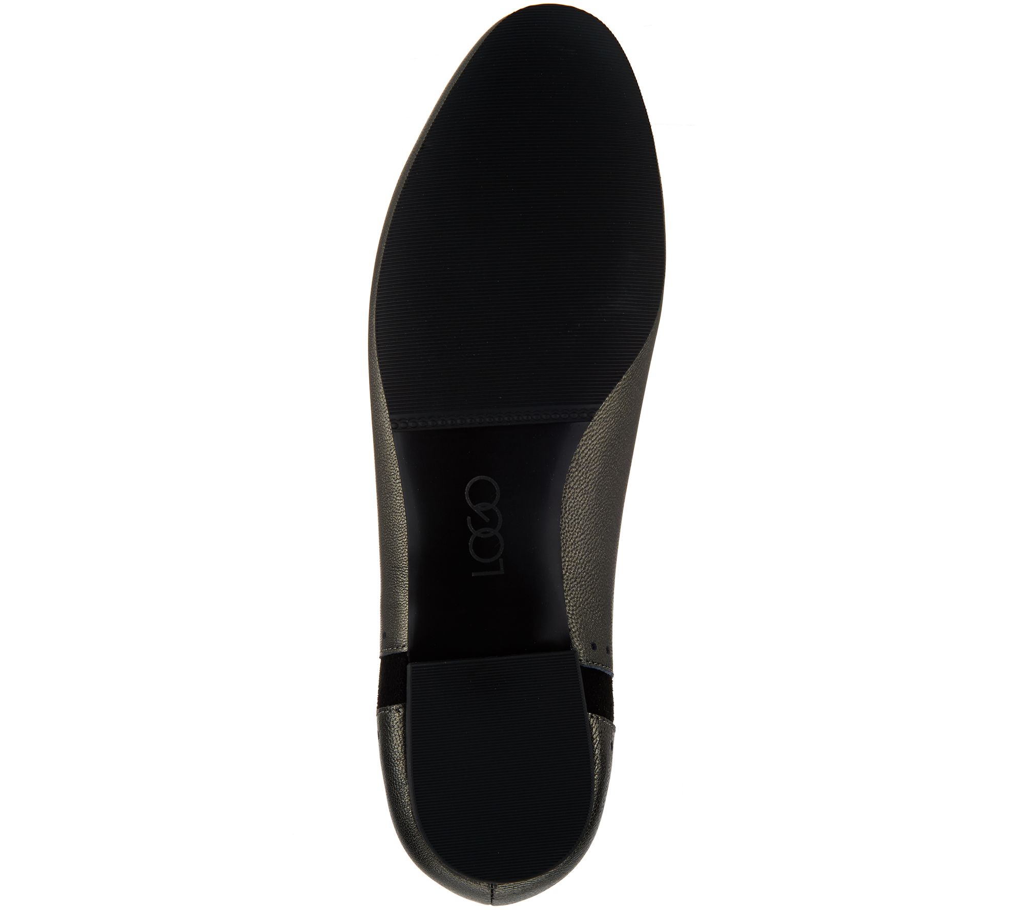 • Pebble leather with cutout circle details, faux suede on back and sides, rounded toe