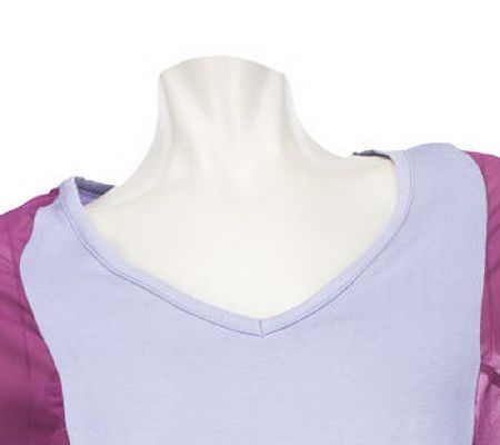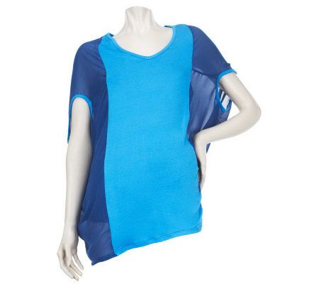 Top: color block, mixed media, V-neckline, short batwing sleeves