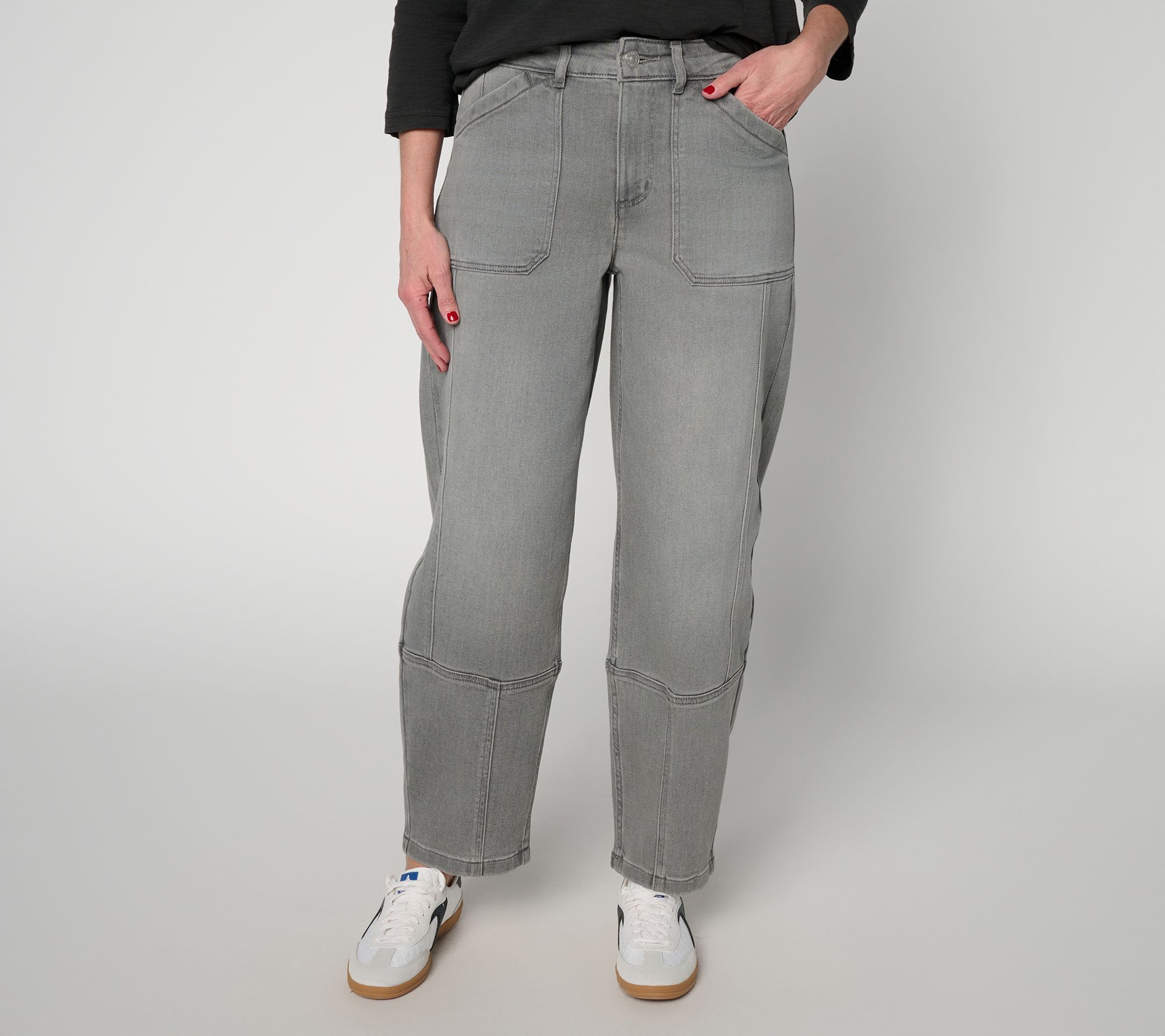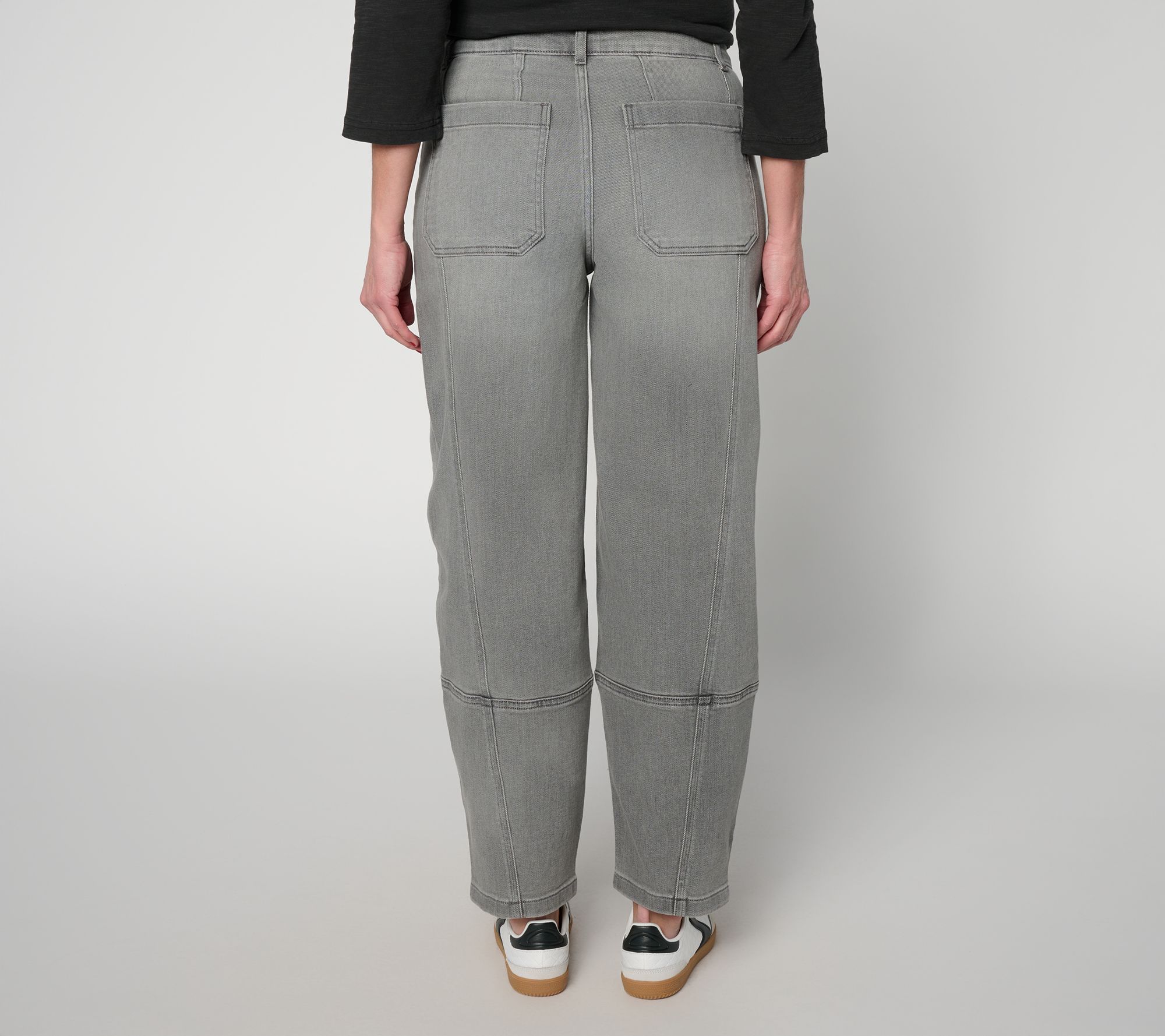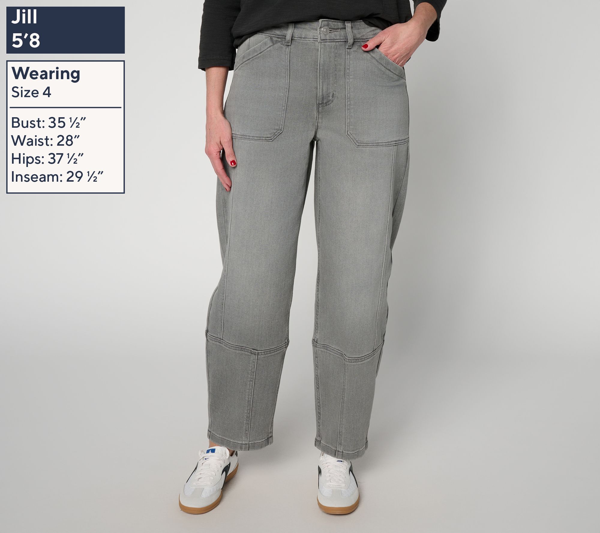 From sightseeing afternoons to relaxed weekends, these barrel-leg jeans give your look an easy upgrade with functional patch pockets and cool seam details. The mid-rise fit and ankle length offer a flattering, versatile base for pairing with sneakers, sandals, or boots. From LOGO by Lori Goldstein®.