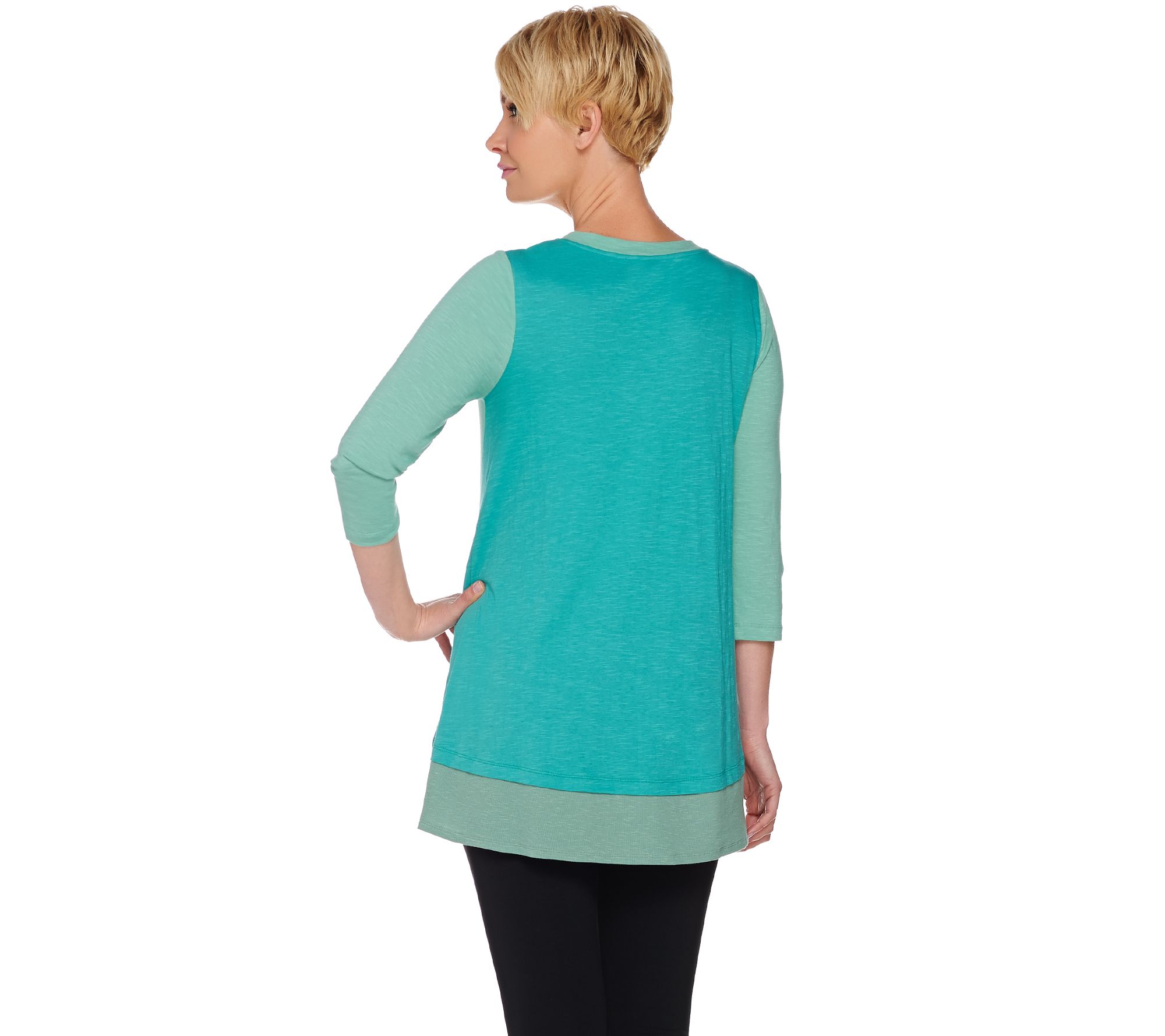 Features: color-block detail, V-neckline, front right pocket on hip, 3/4-length sleeves, ribbed trim on hi-low hem, right small side slit, off-center front slit