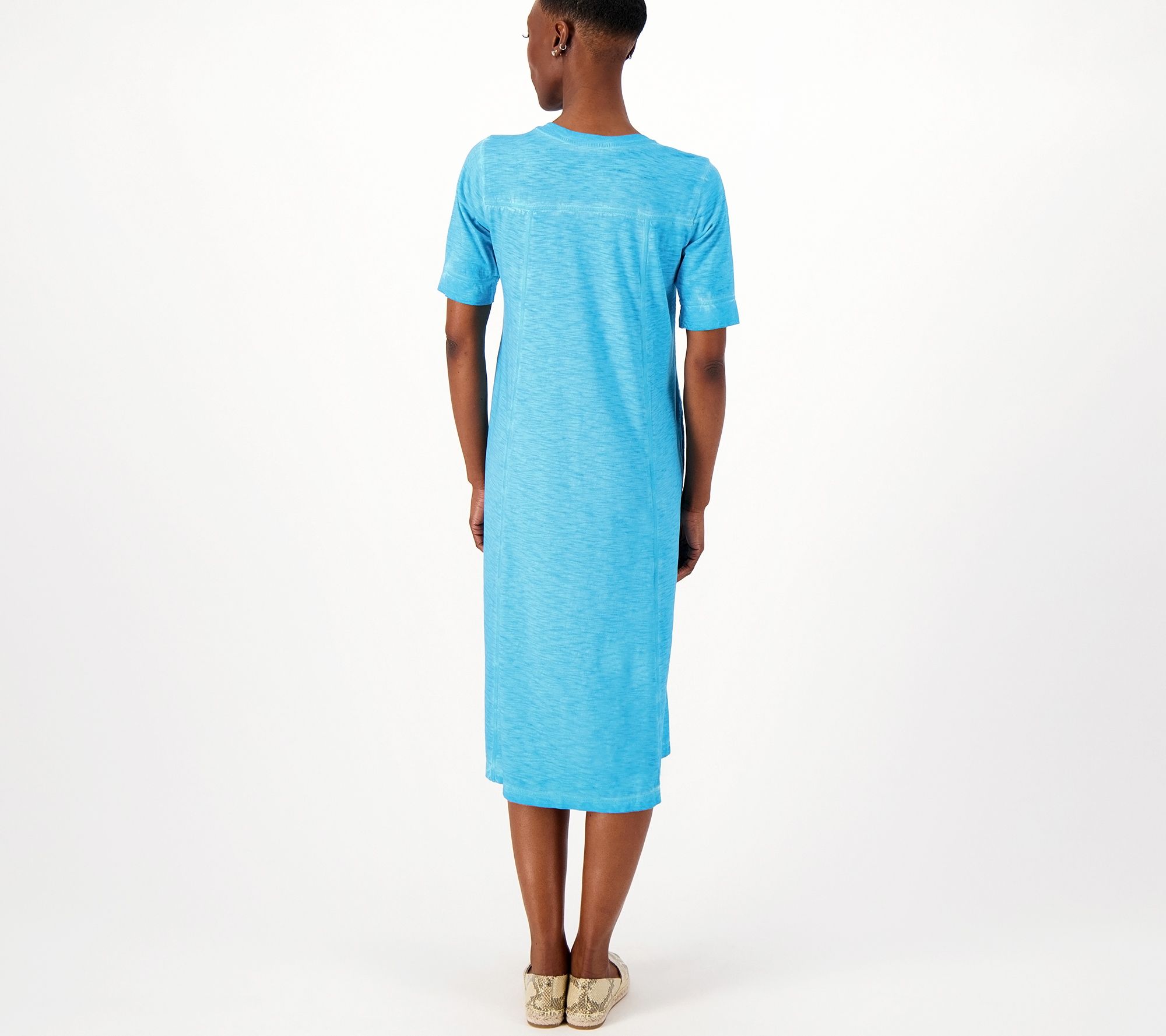 • Features: scoop neckline, elbow-length sleeves, on-seam pockets, distressed wash