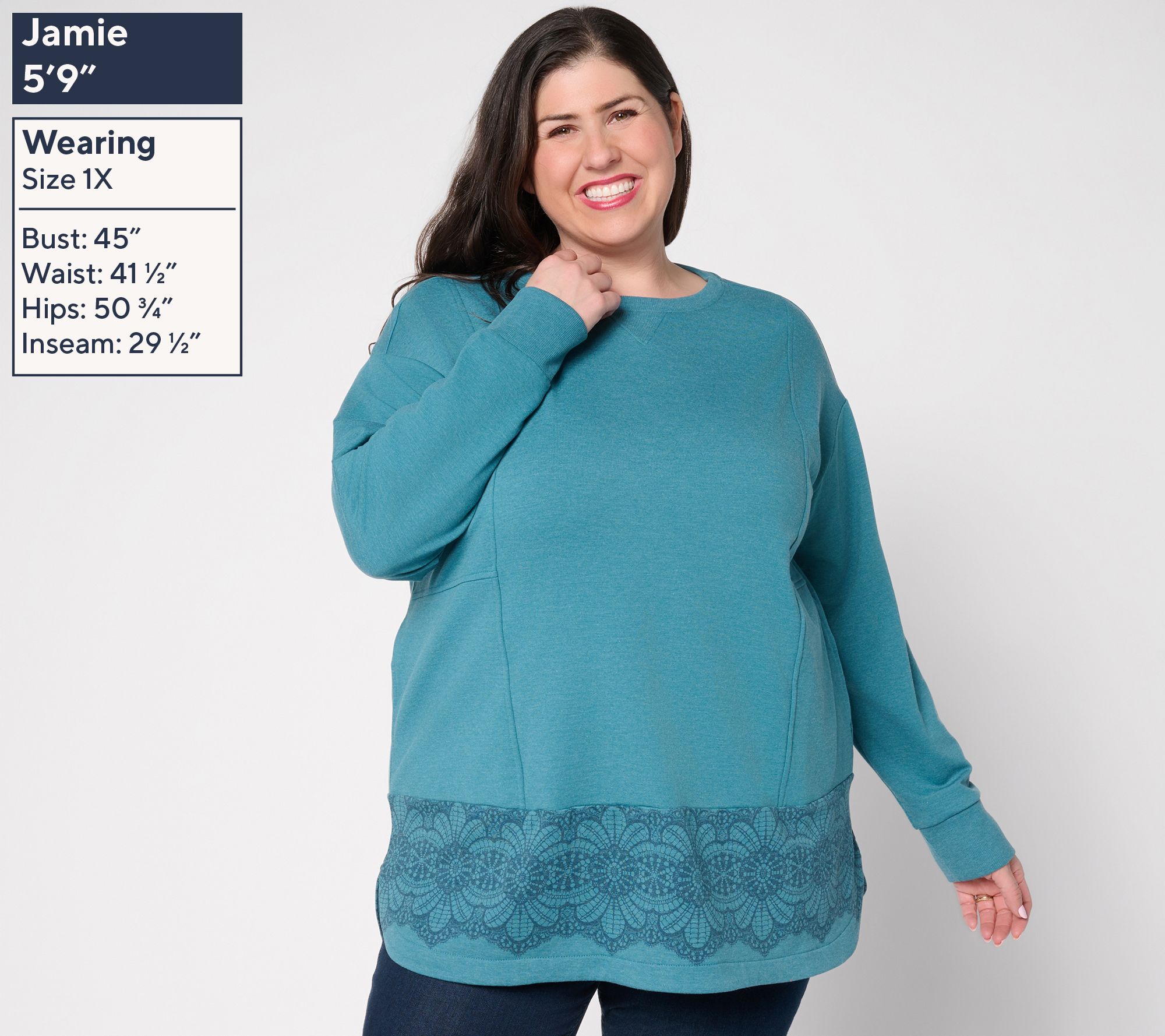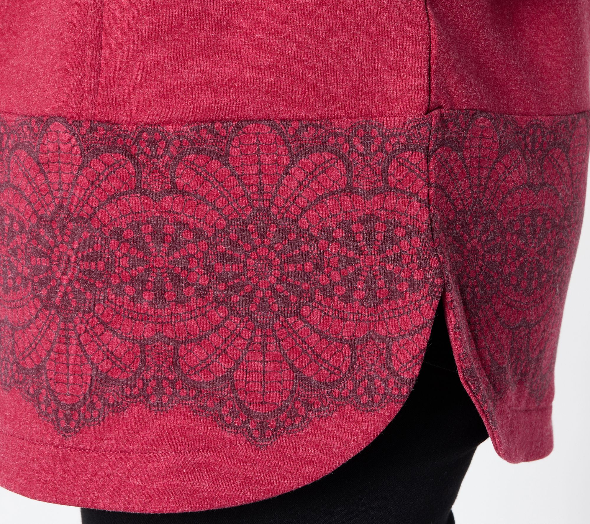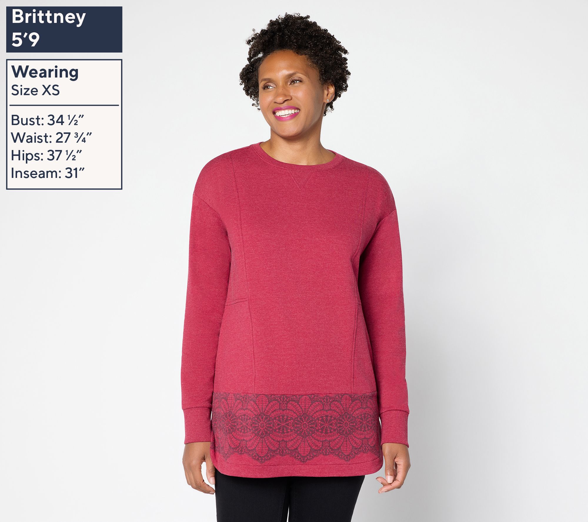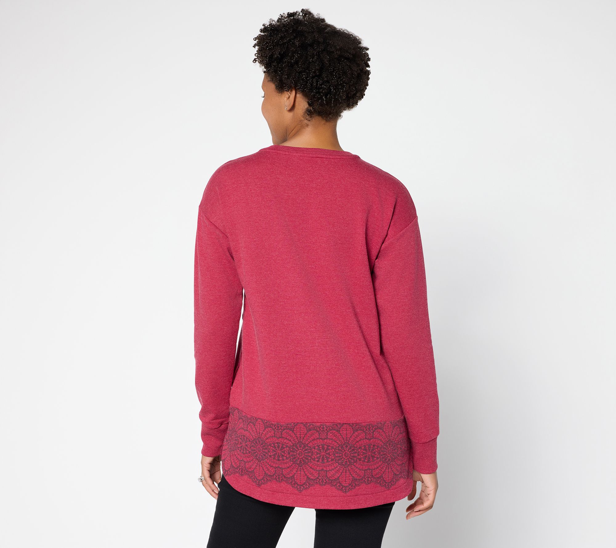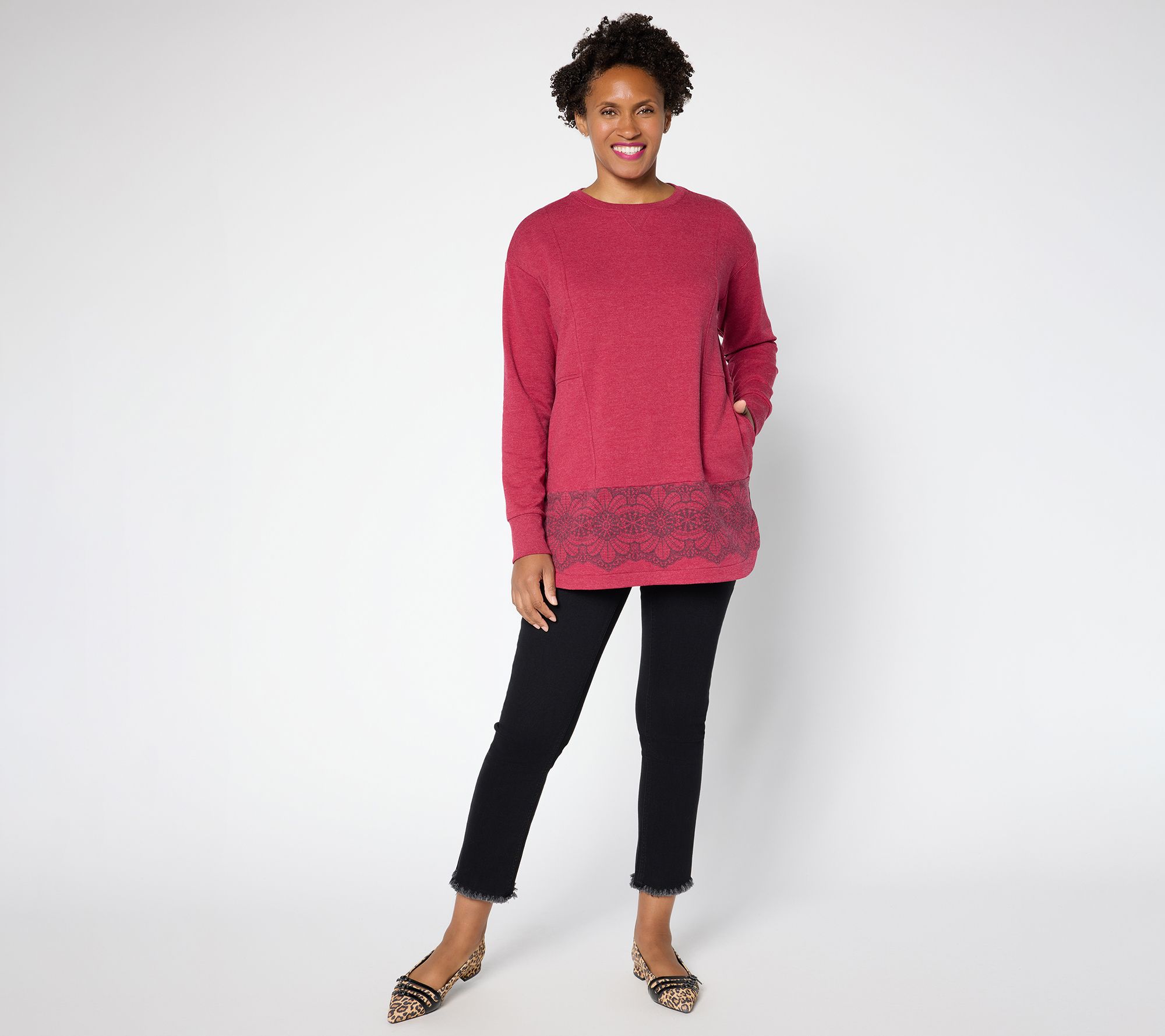 With bold border print details and a relaxed silhouette, this French terry tunic dresses up laid-back weekends or adds lively flair to weekday errands. The crew neckline and long sleeves provide coverage while seamed panels create interest for casual meet-ups or cozy evenings at home. From LOGO by Lori Goldstein®.