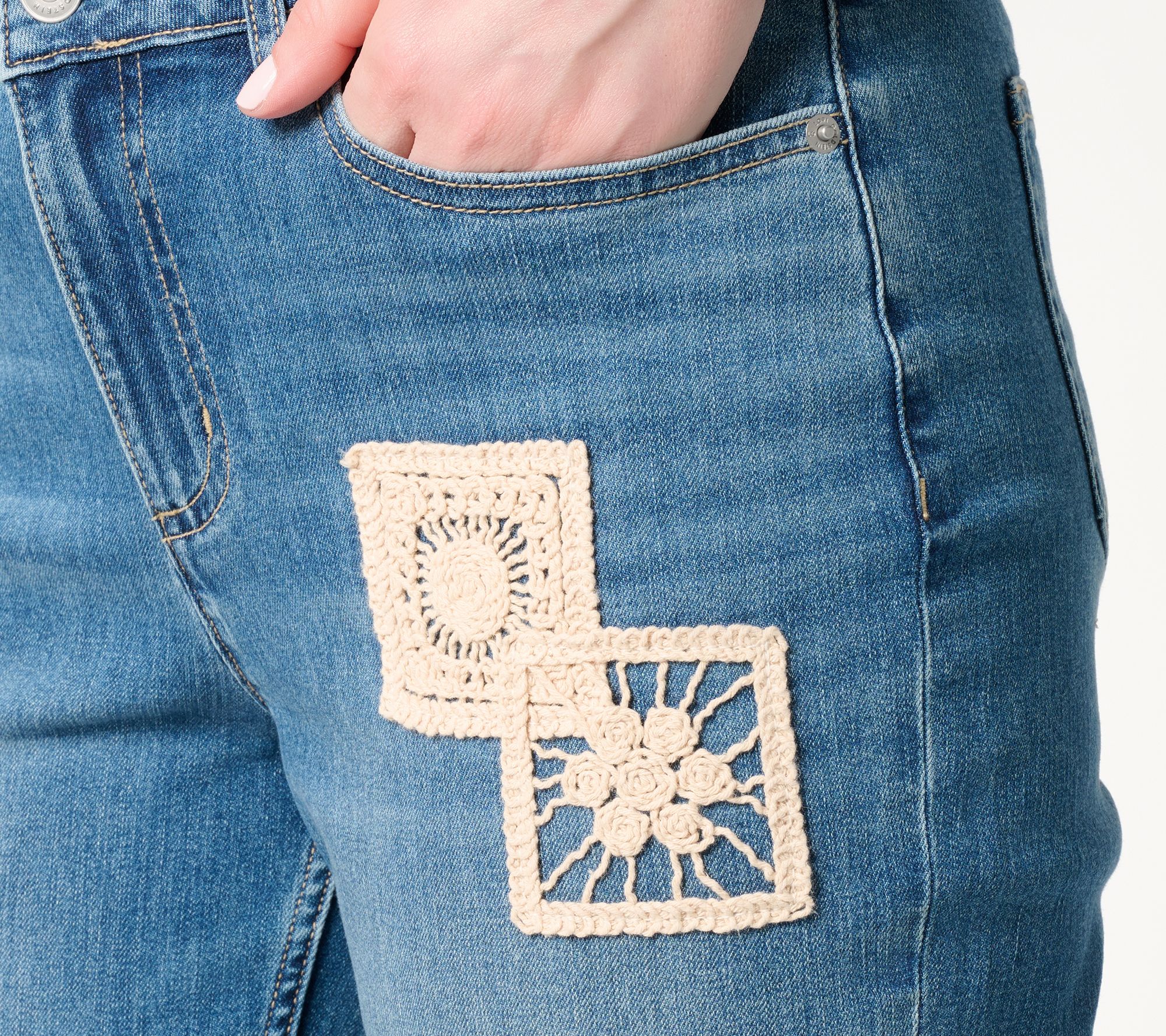Heading out for errands or relaxing at home, these tapered-leg ankle jeans offer inventive style with crochet patchwork details and a cuffed hem. They're an effortless choice for layering with your go-to sneakers or flats. From LOGO by Lori Goldstein®.