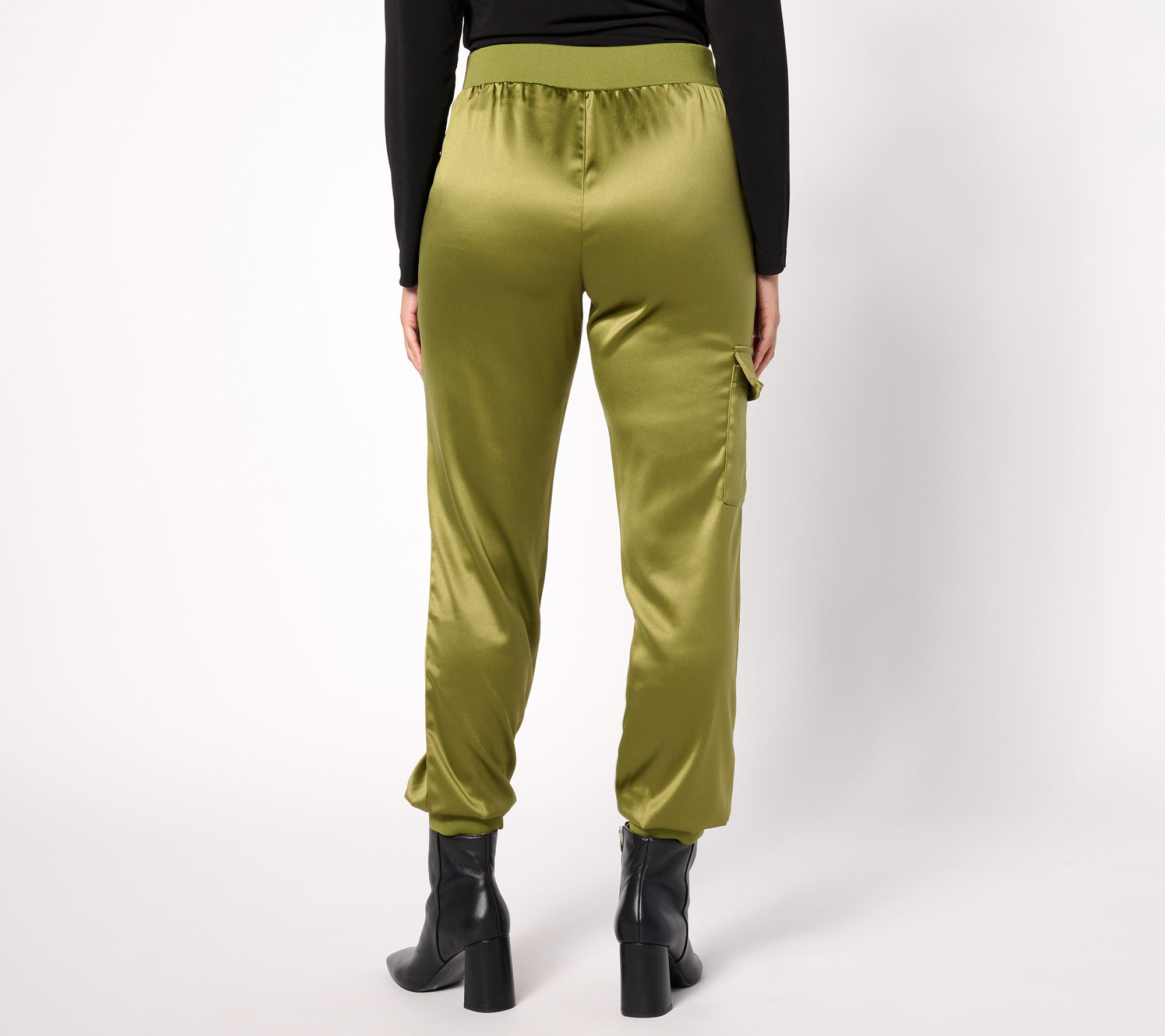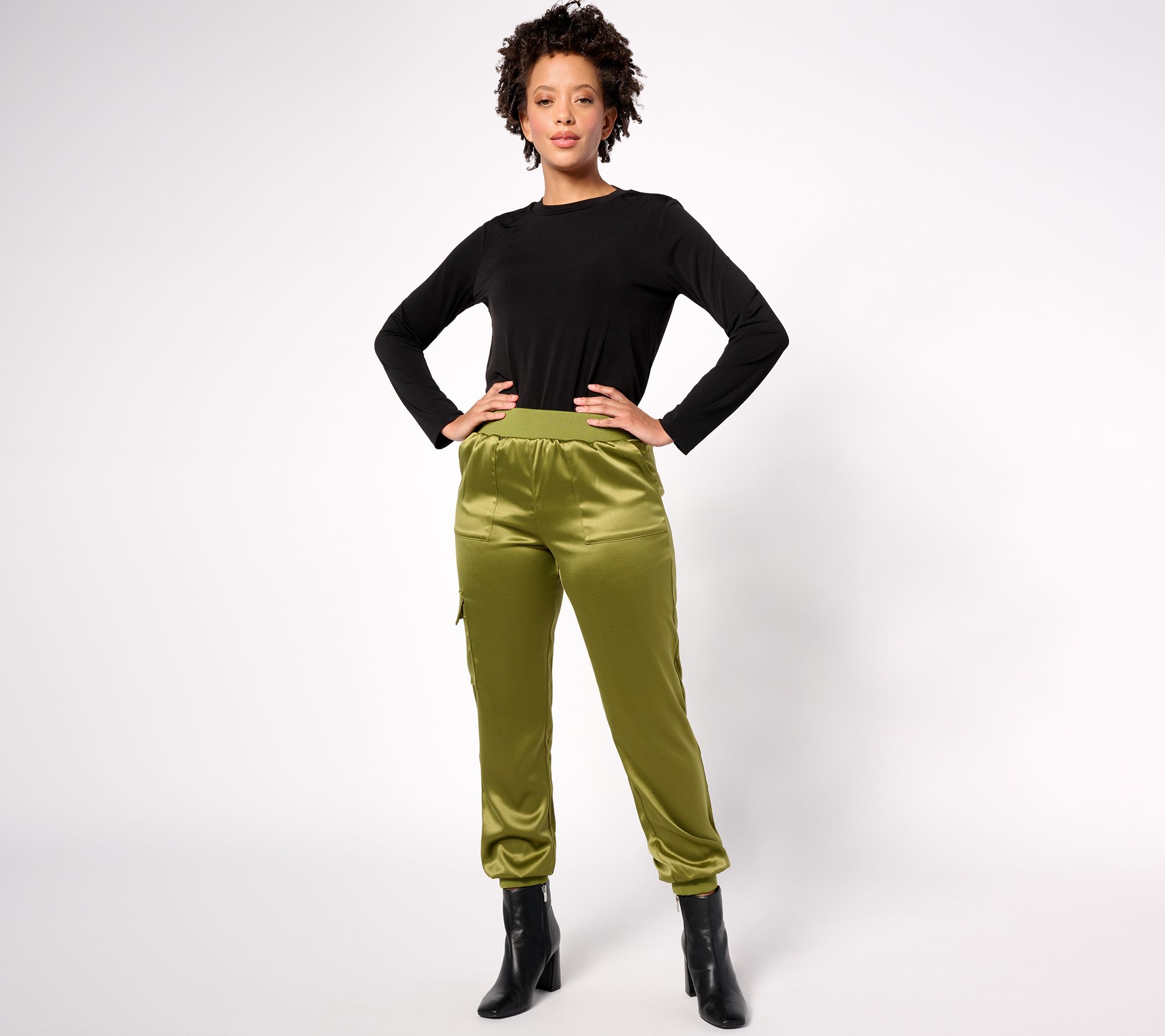 Best dressed is in your future when you arrive wearing these sassy satin cargo pants. The casual jogger-style cargos are ideal for any RSVP while the sleek satin fabric elevates the mood to party mode. Such a saucy boss! From LOGO by Lori Goldstein®.