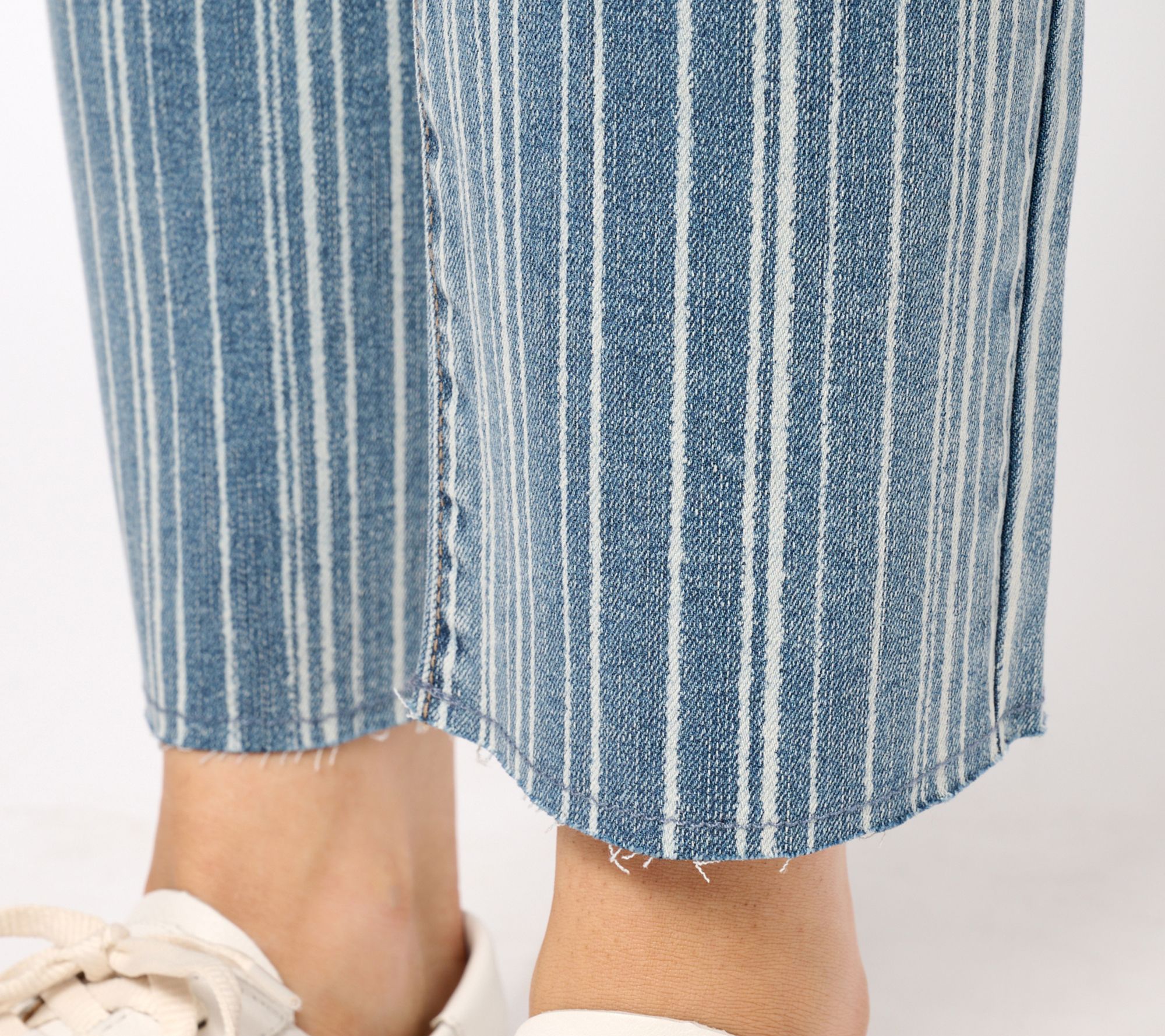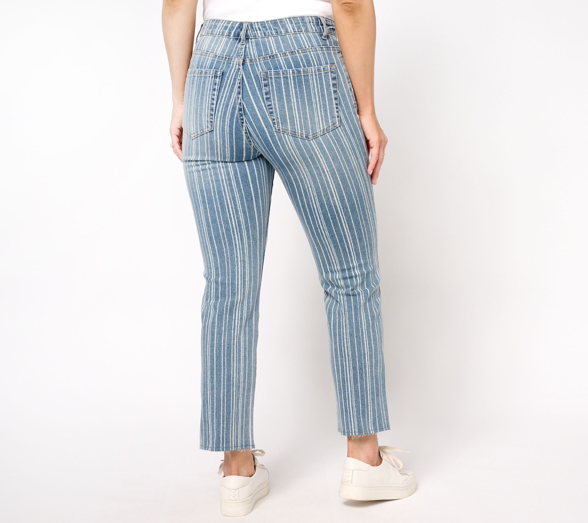 Putting a new spin on a tried-and-true wardrobe staple must be in her jeans. Lori Goldstein goes the distance with these straight-leg denim must-haves, adding softly faded striping that adds a fresh option to your jeans rotation. You've done it again, Lori! From LOGO by Lori Goldstein.