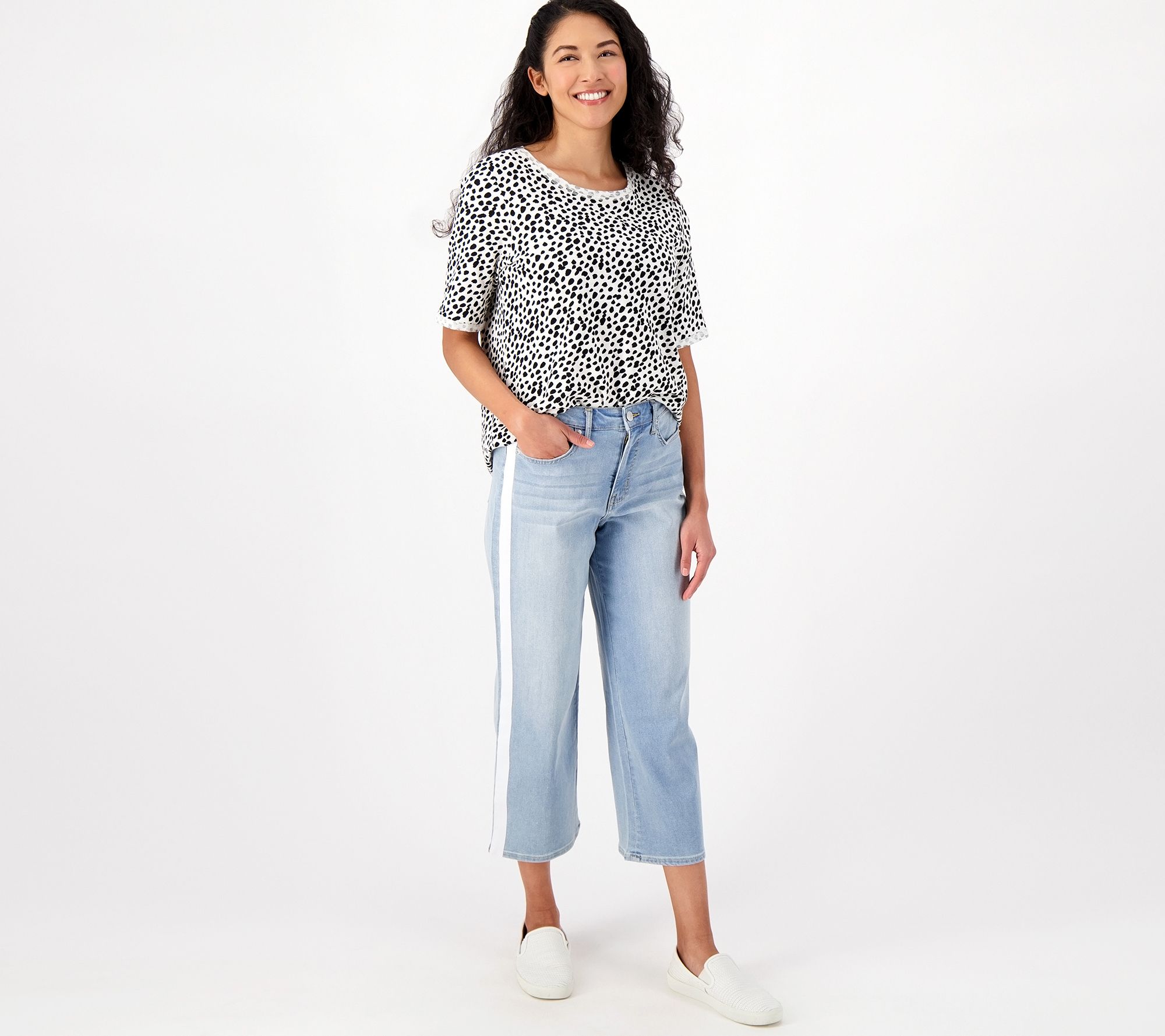 Love that athleisure look but don't always want to be caught wearing it 24/7? Lori Goldstein's got the answer with these wide-leg jeans. The lively stripe down the side lends your look a fresh sporty-sport feel, while the relaxed fit doesn't suction you in. (Yes, you can love your jeans again!) From LOGO by Lori Goldstein®.