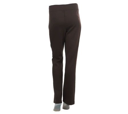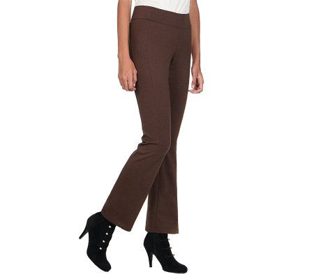 Pants that are practically perfect in every way. Fashioned in comfortable ponte knit, these pants are extremely versatile and oh-so flattering. Seaming details down the boot-cut legs and back ensure they enhance your silhouette. From LOGO by Lori Goldstein.