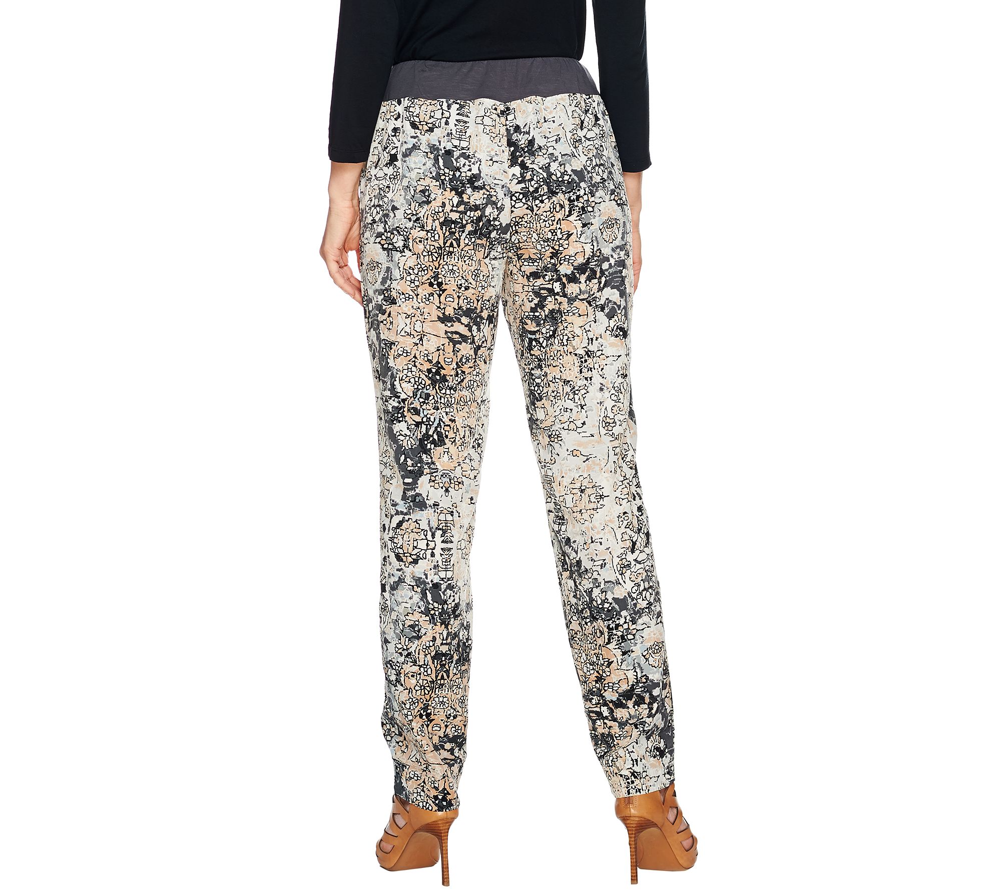 Flaunting a figure-flattering drape, these pretty pants by Lori Goldstein are done in a printed challis fabric. The solid-colored, full elastic waistband creates a comfy pull-on style you'll love. From LOGO by Lori Goldstein(R).