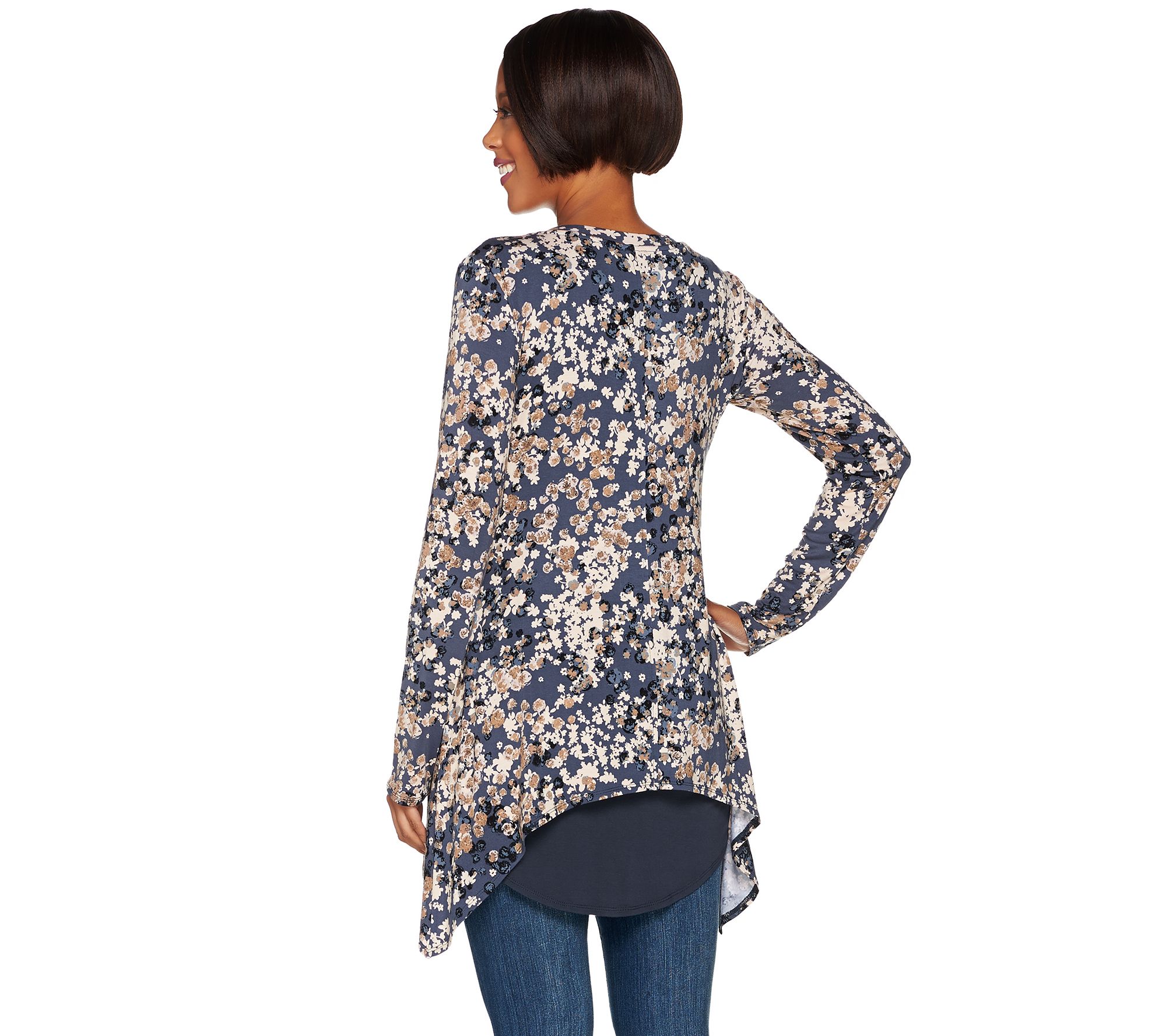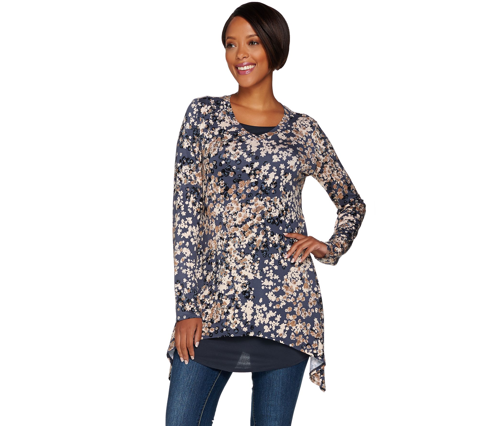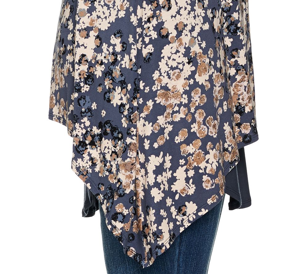 • Top Features: allover print, V-neck, long sleeves, sharkbite hem