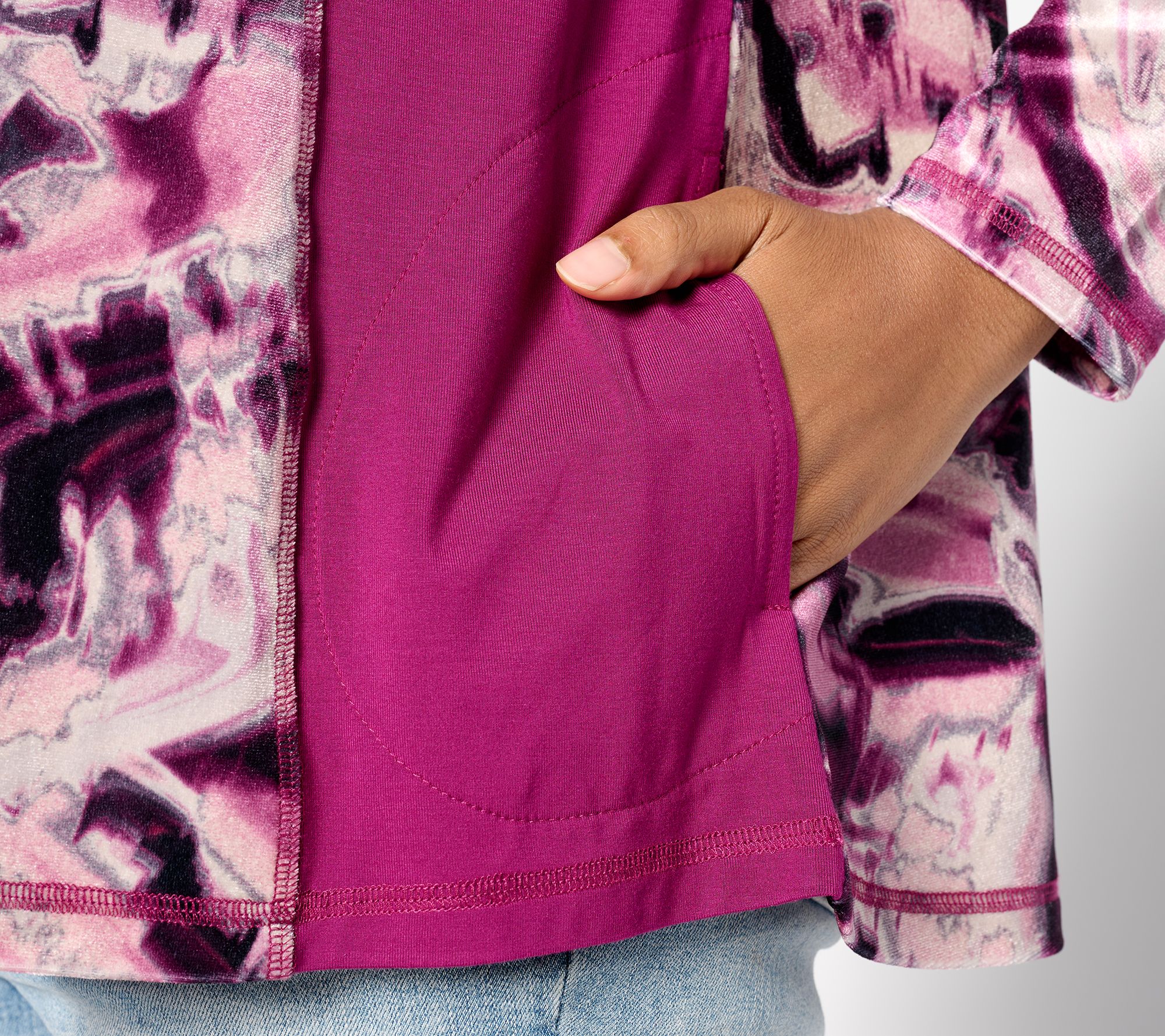 • Features: scoop neckline, pieced printed design, pockets, long sleeves, front yoke, hems and princess seams with decorative coverstitch