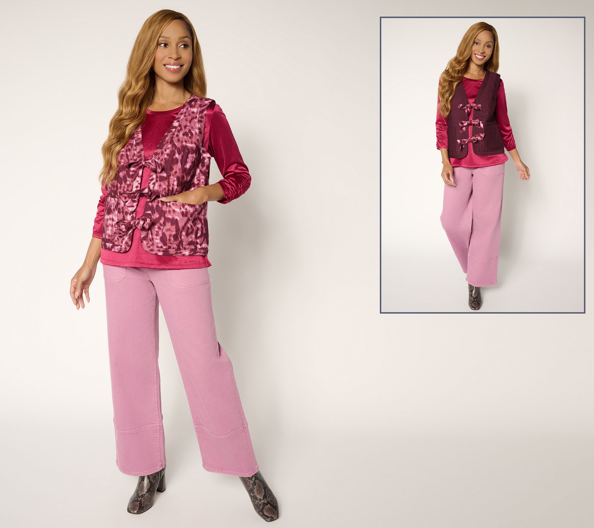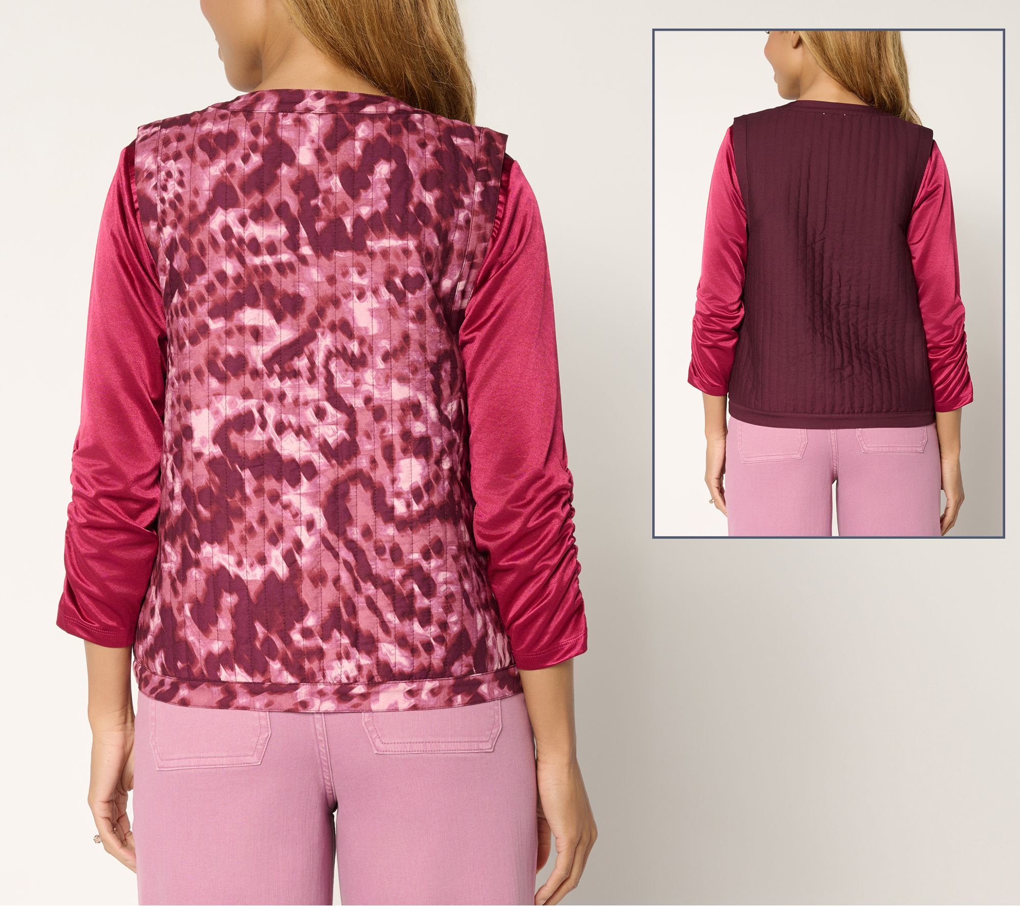 Sometimes you feel like a print. Sometimes you don't. A mood reversal is never a problem with this tie-front vest. This reversible layer flaunts a lively print on one side, while the other shows off a solid hue for more understated days ('cause there's more to you than meets the eye). From LOGO by Lori Goldstein®.