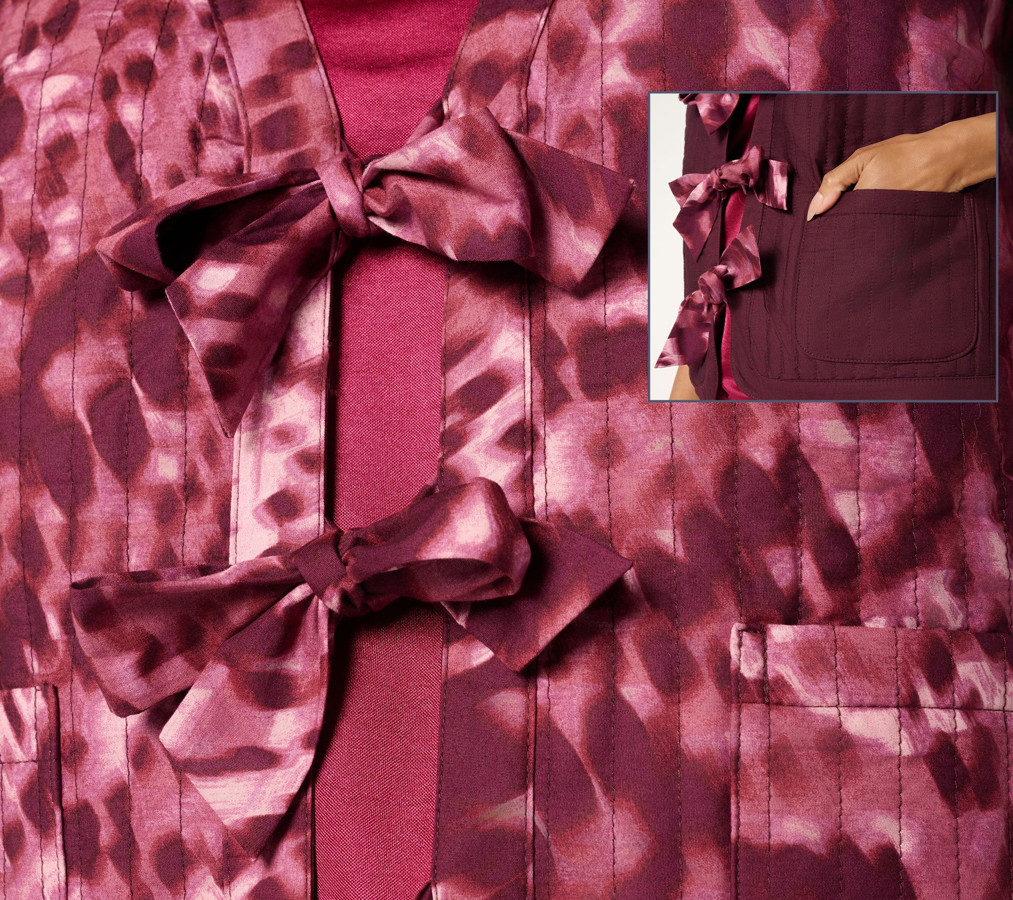 Features: quilted design, reversible, printed exterior with solid interior, self ties at front placket, patch pockets on both sides