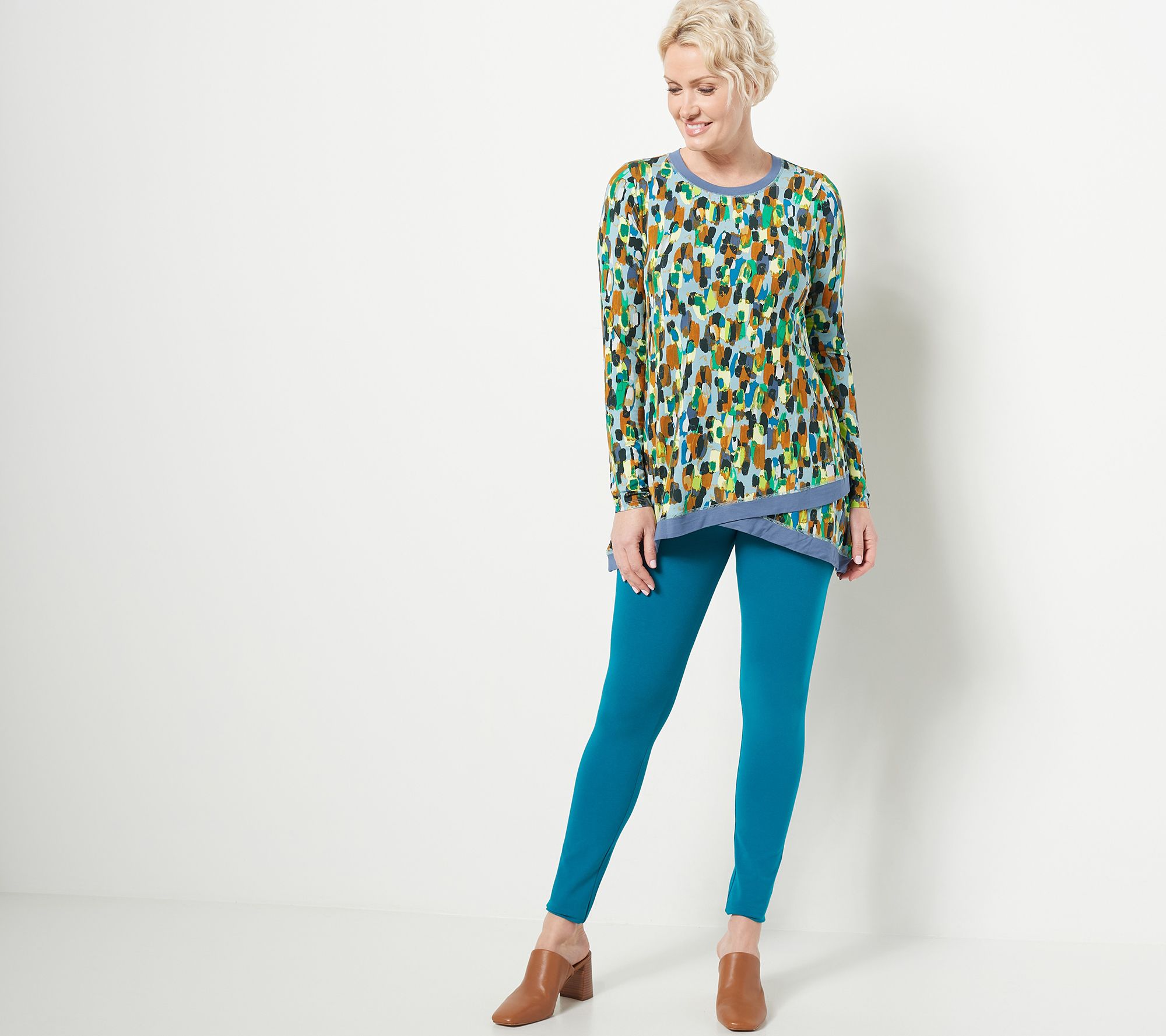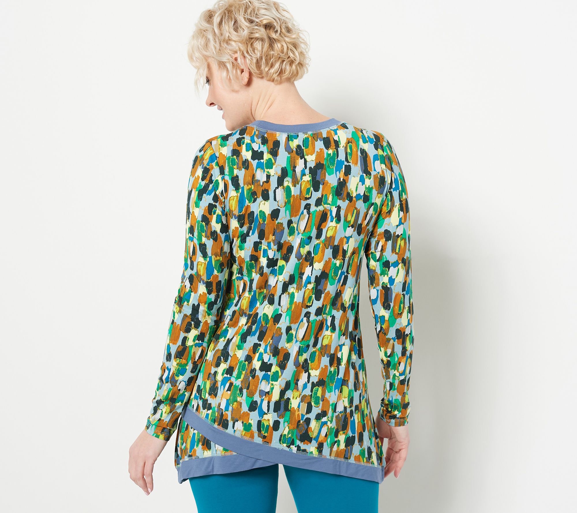 Cascading layers across the bottom hemline of this top give it an easy-going vibe. The print is trendy, the style is unmatched, and it's soo ready to call your closet its new home. From LOGO by Lori Goldstein®.