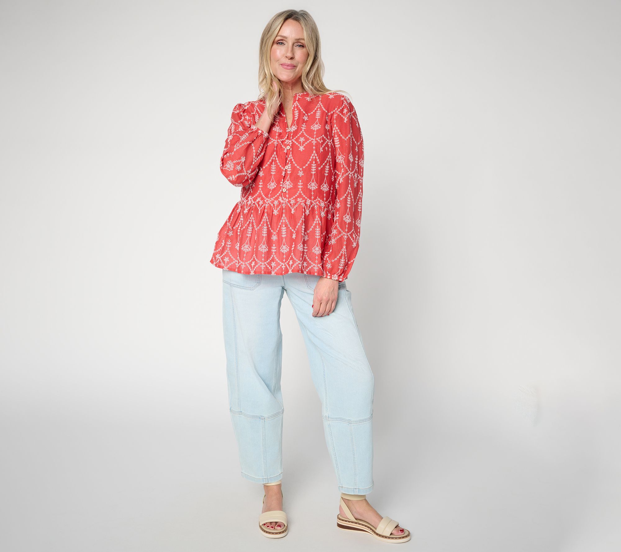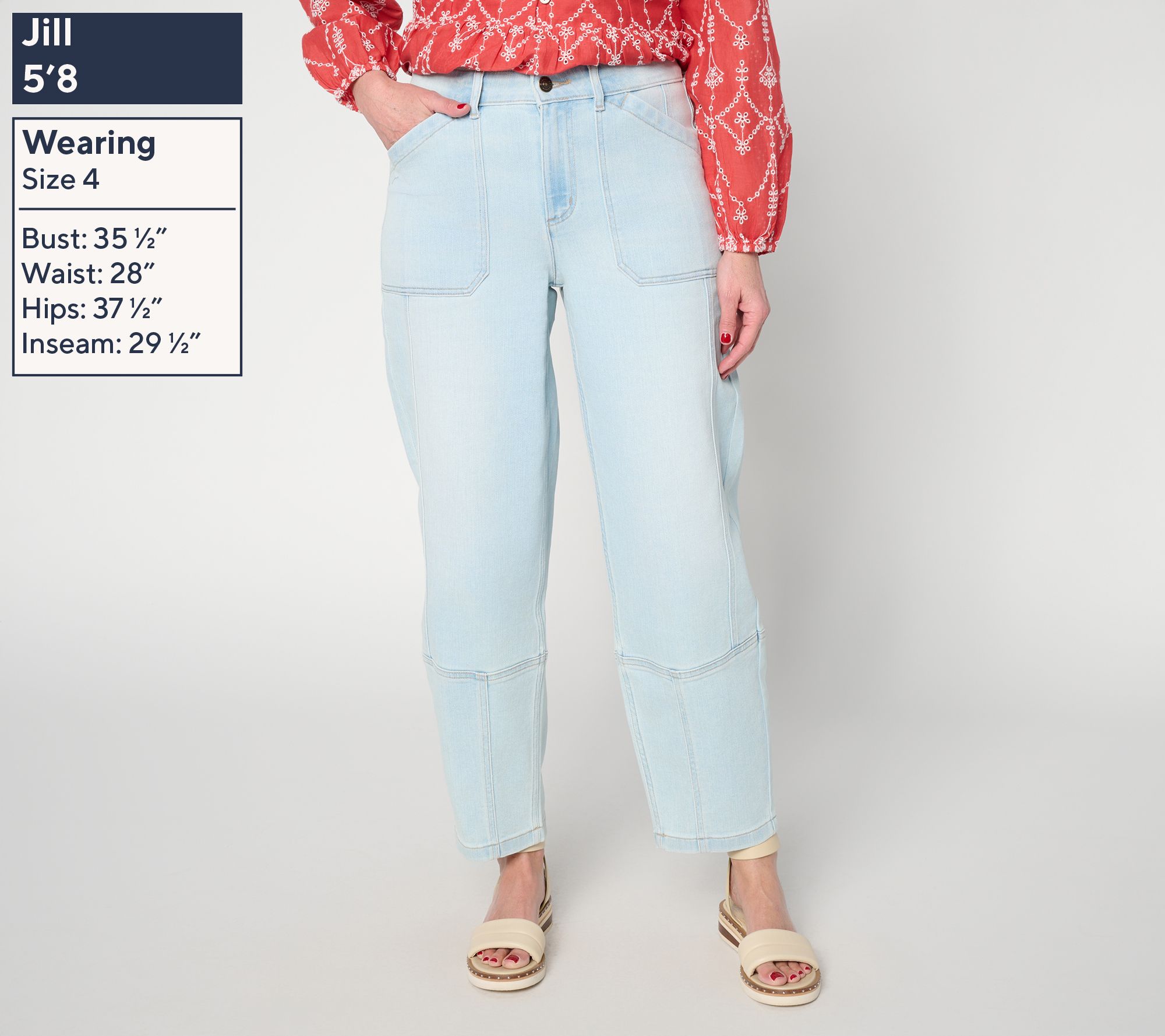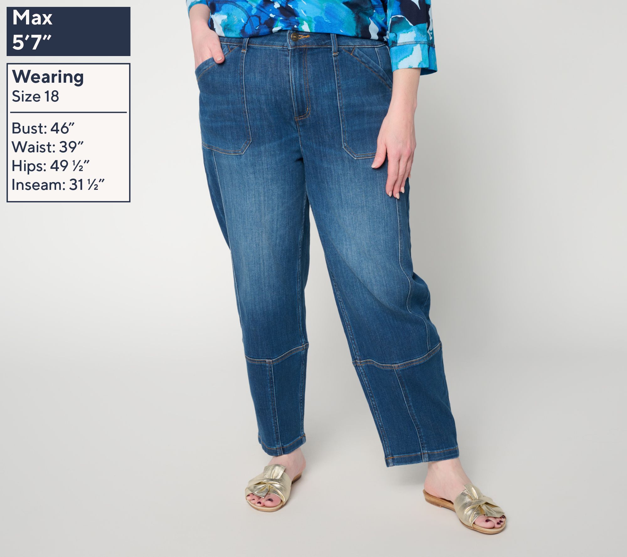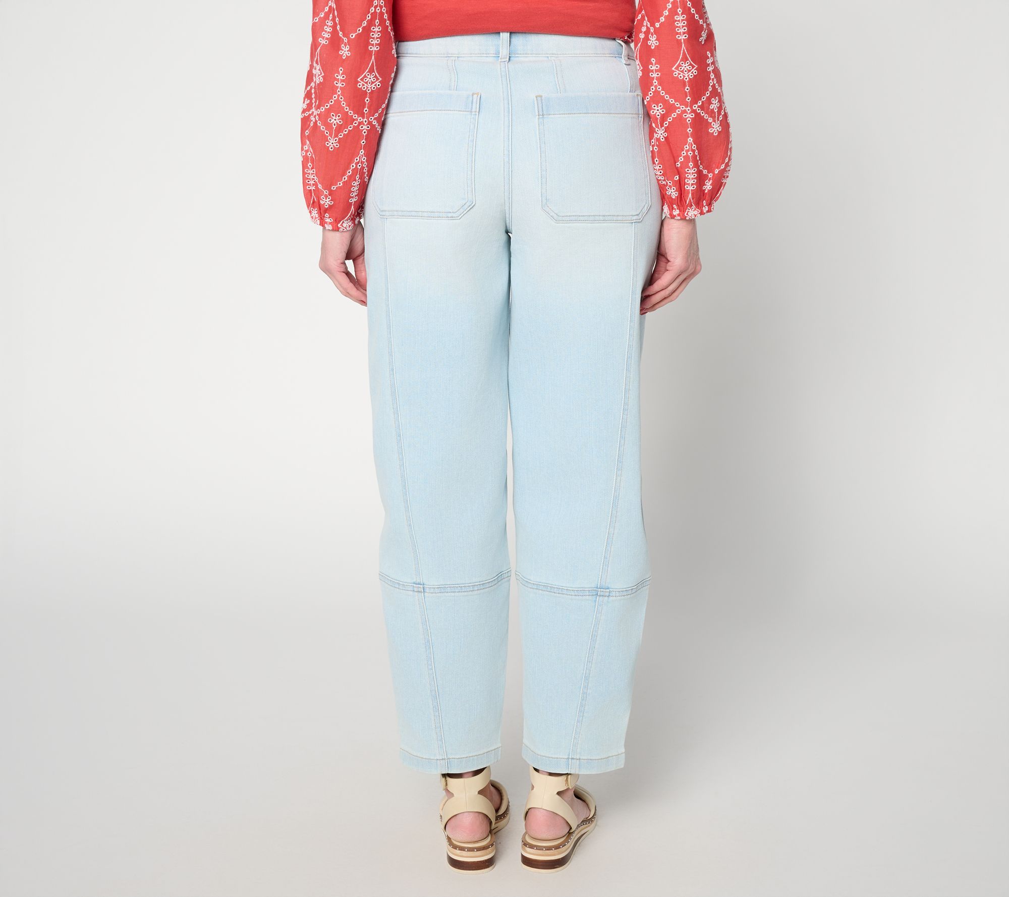 From sightseeing afternoons to relaxed weekends, these barrel-leg jeans give your look an easy upgrade with functional patch pockets and cool seam details. The mid-rise fit and ankle length offer a flattering, versatile base for pairing with sneakers, sandals, or boots. From LOGO by Lori Goldstein®.