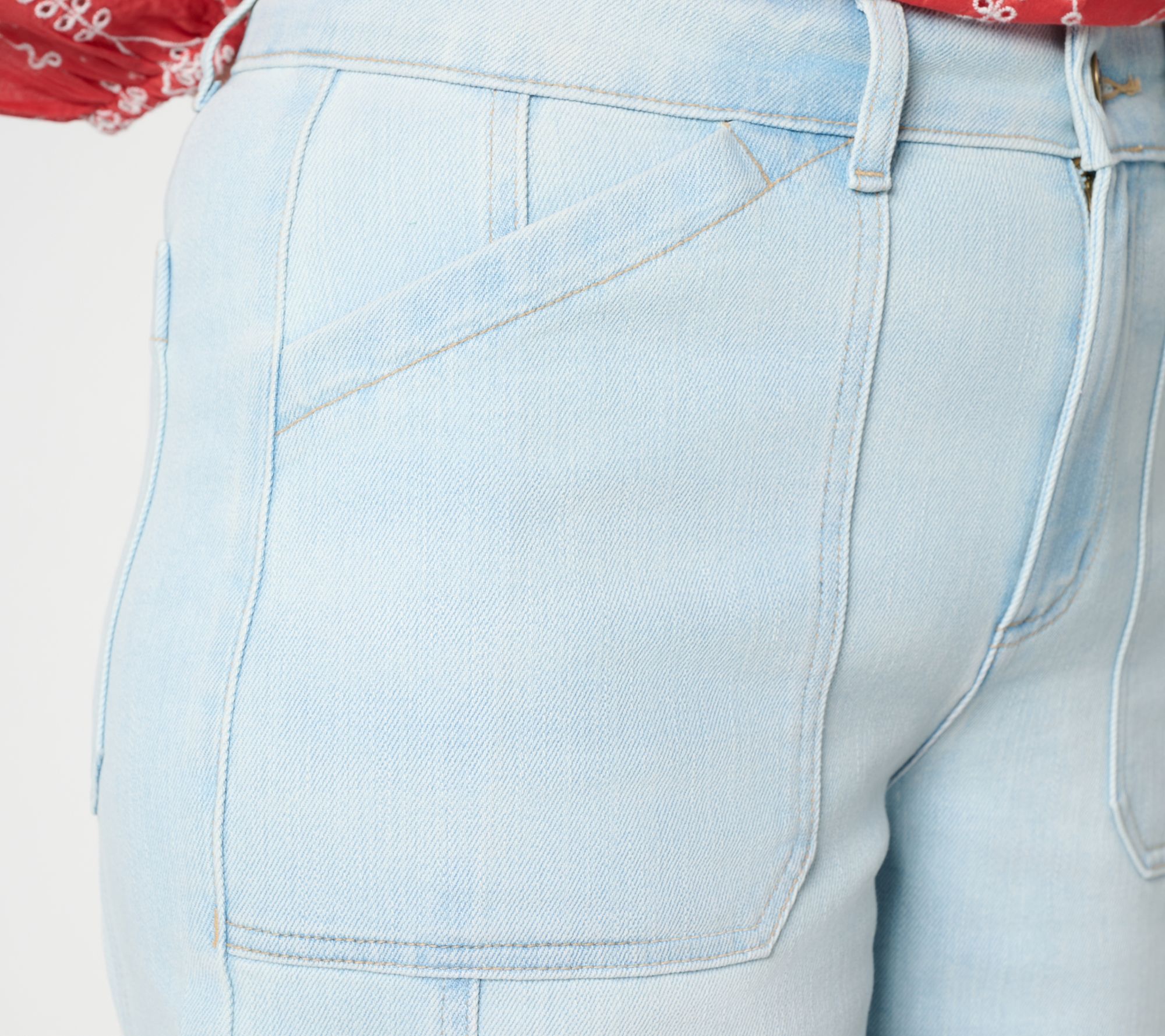 Leg Shape: barrel leg; curves slightly outward from thigh to knee, then tapers to leg opening