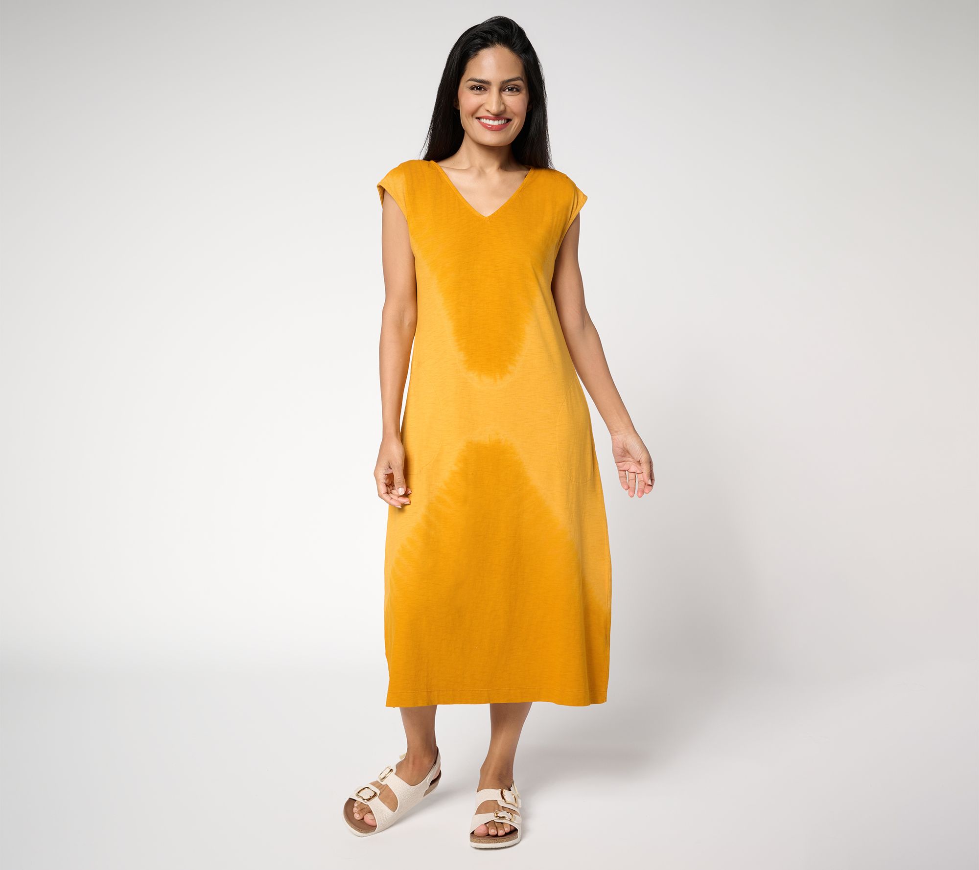 Bring a splash of color to your day with this tie-dye midi dress in 100% cotton. Whether you're off to brunch or a casual day with friends, the sleeveless design and drop shoulder pleats offer effortless style and comfort. Keep the essentials close with convenient side pockets as you revel in the whimsical patterns that make you stand out. From LOGO by Lori Goldstein®.