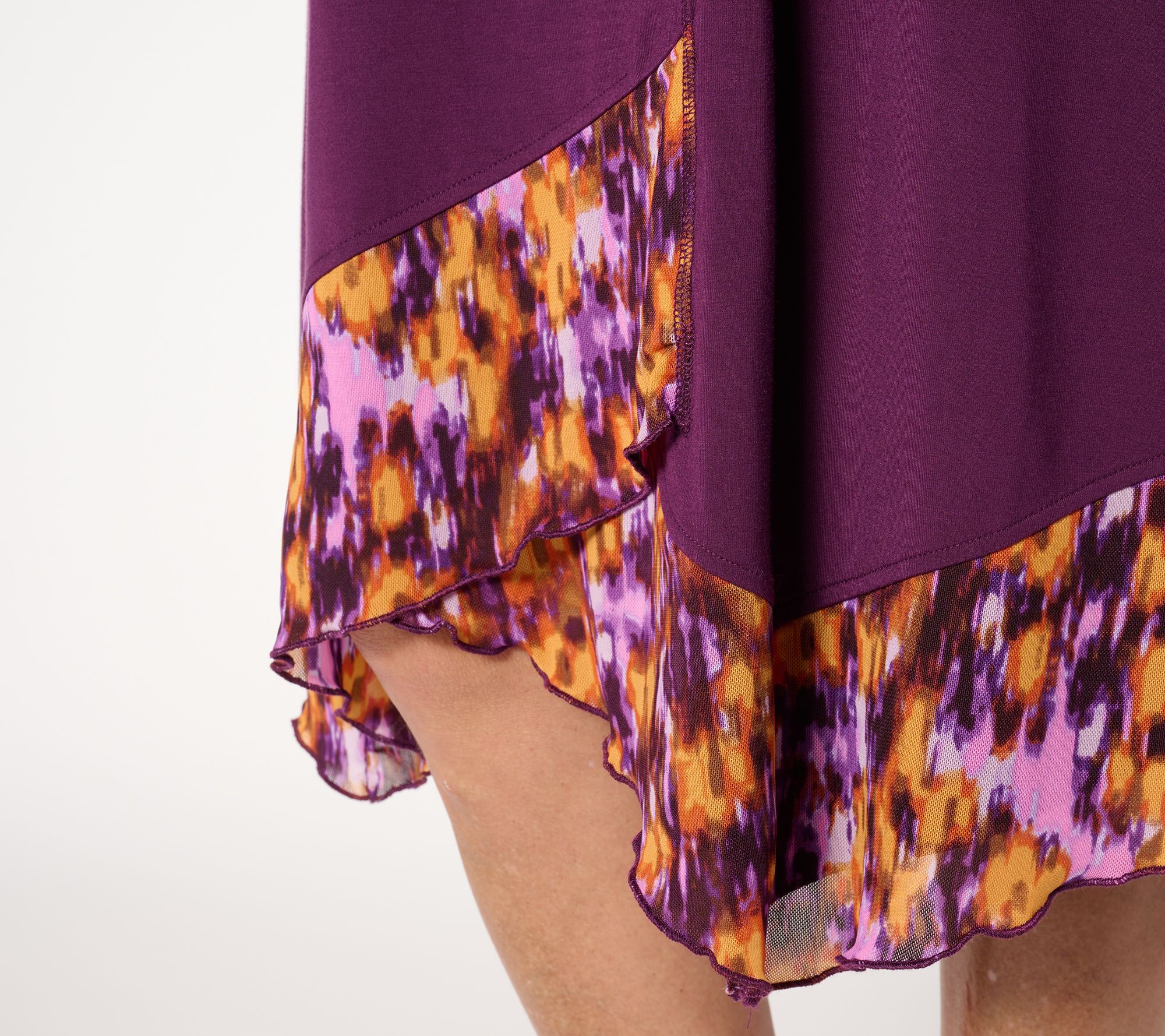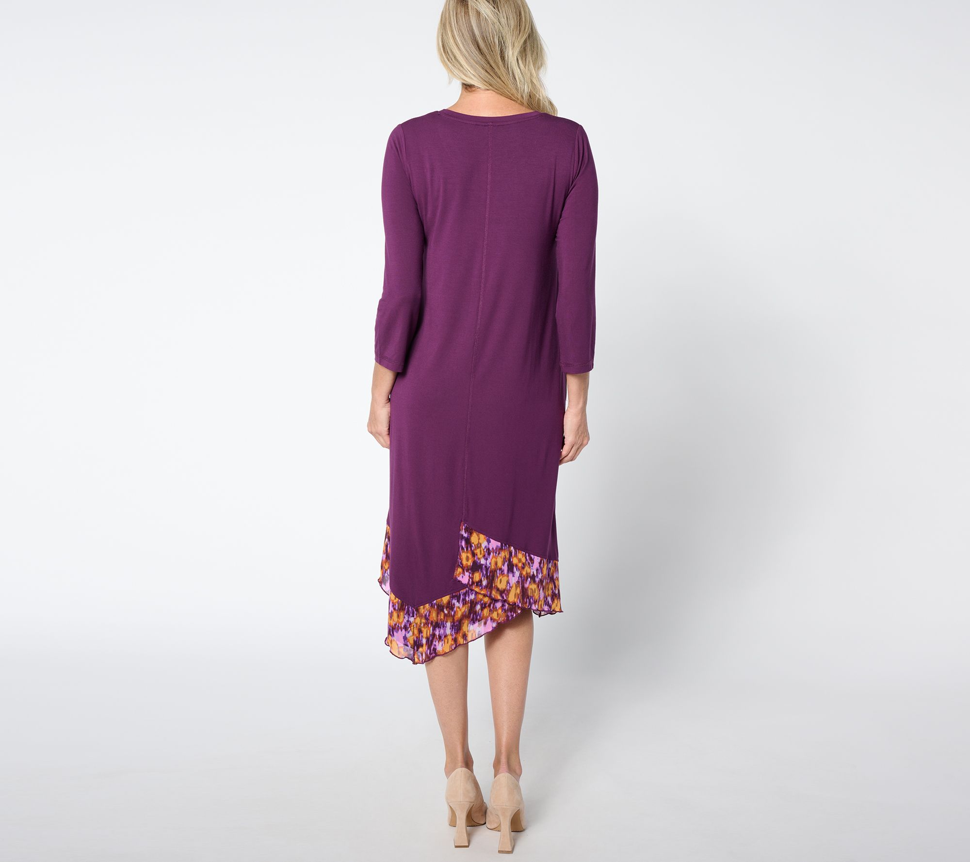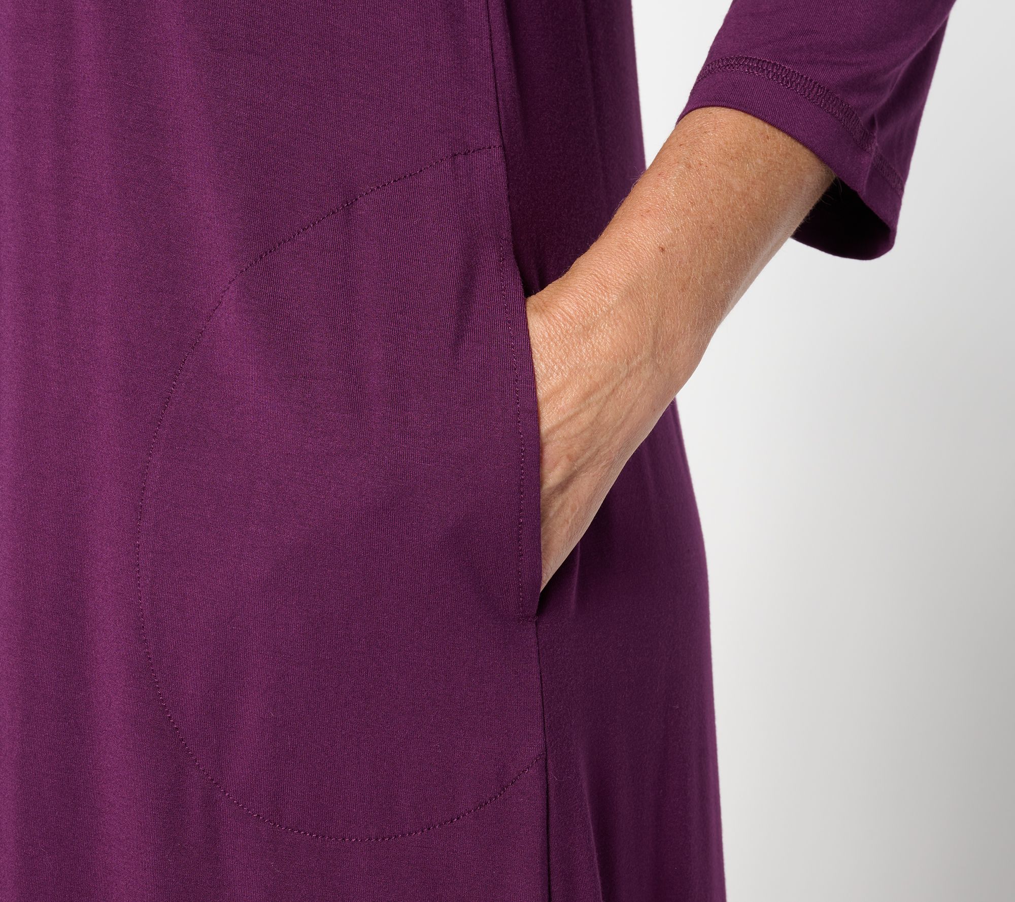 Features: 3/4-length sleeves, pearl-edge hemmed flounce, side pockets, cover stitch at center front, center back, and sleeve hem