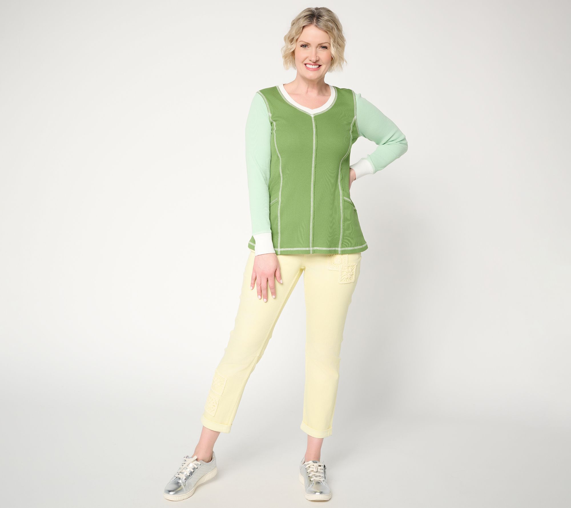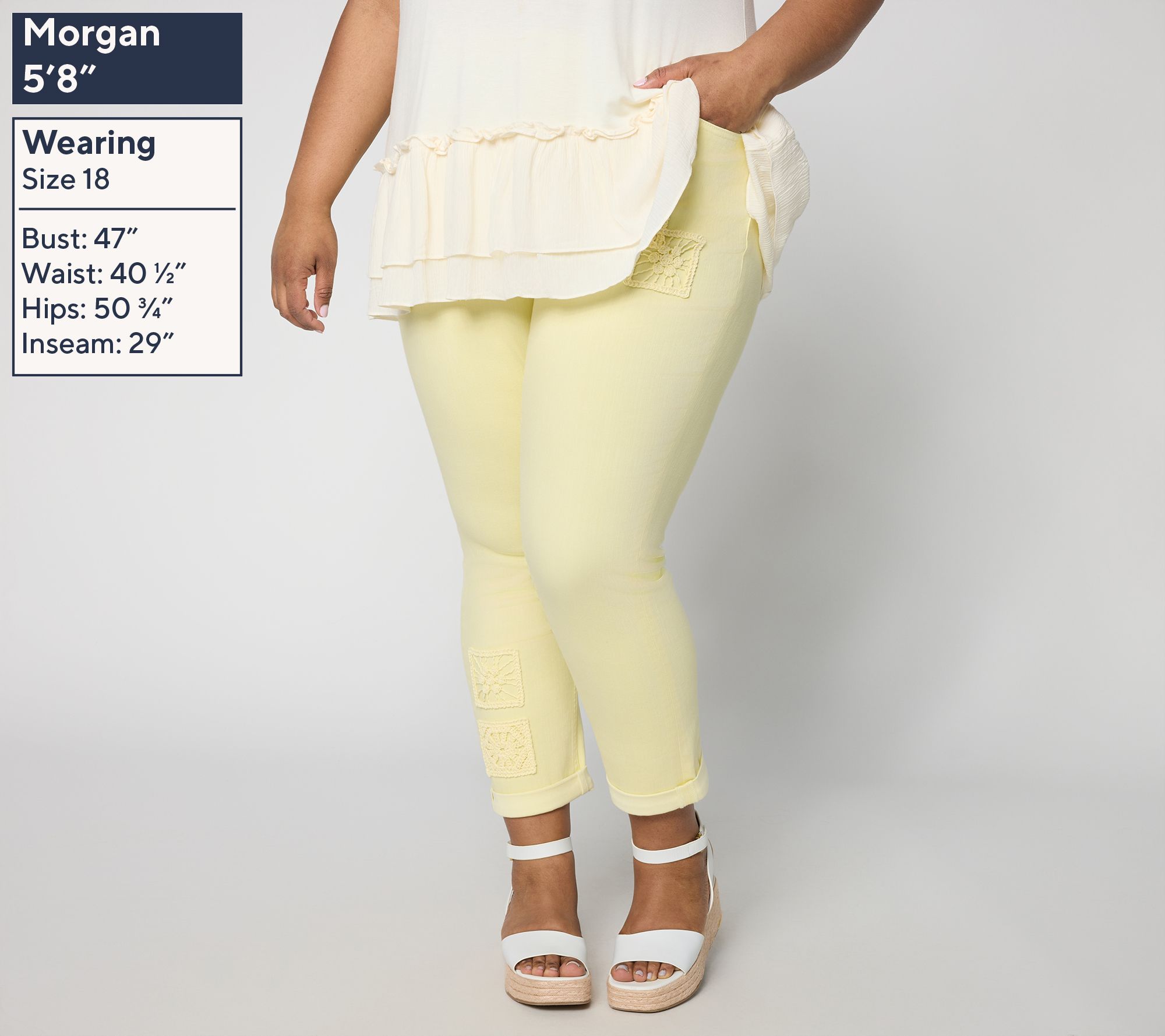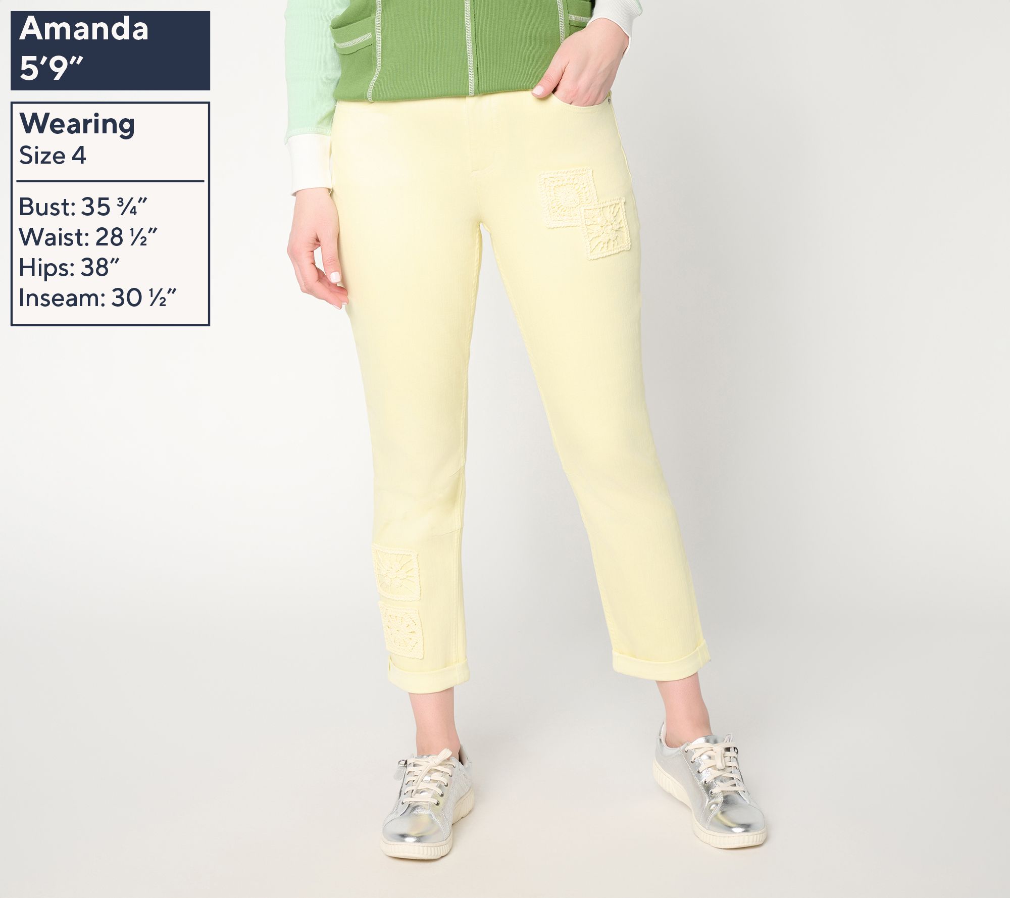 Heading out for errands or relaxing at home, these tapered-leg ankle jeans offer inventive style with crochet patchwork details and a cuffed hem. They're an effortless choice for layering with your go-to sneakers or flats. From LOGO by Lori Goldstein®.