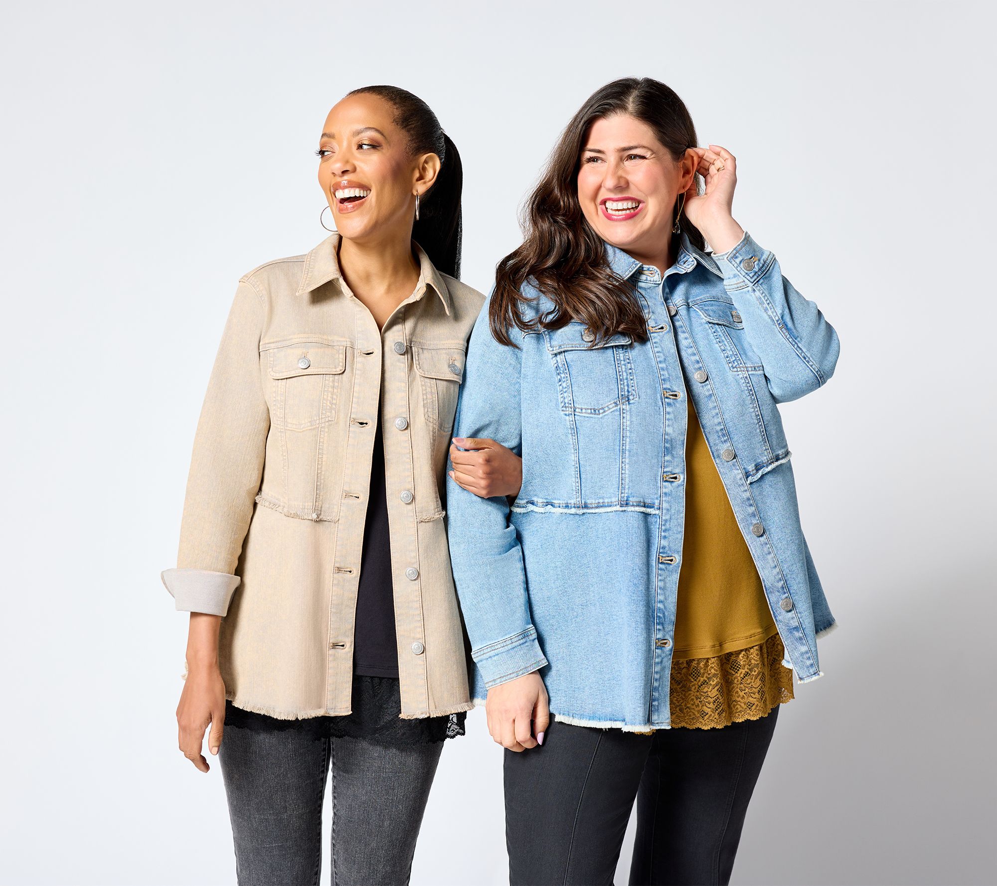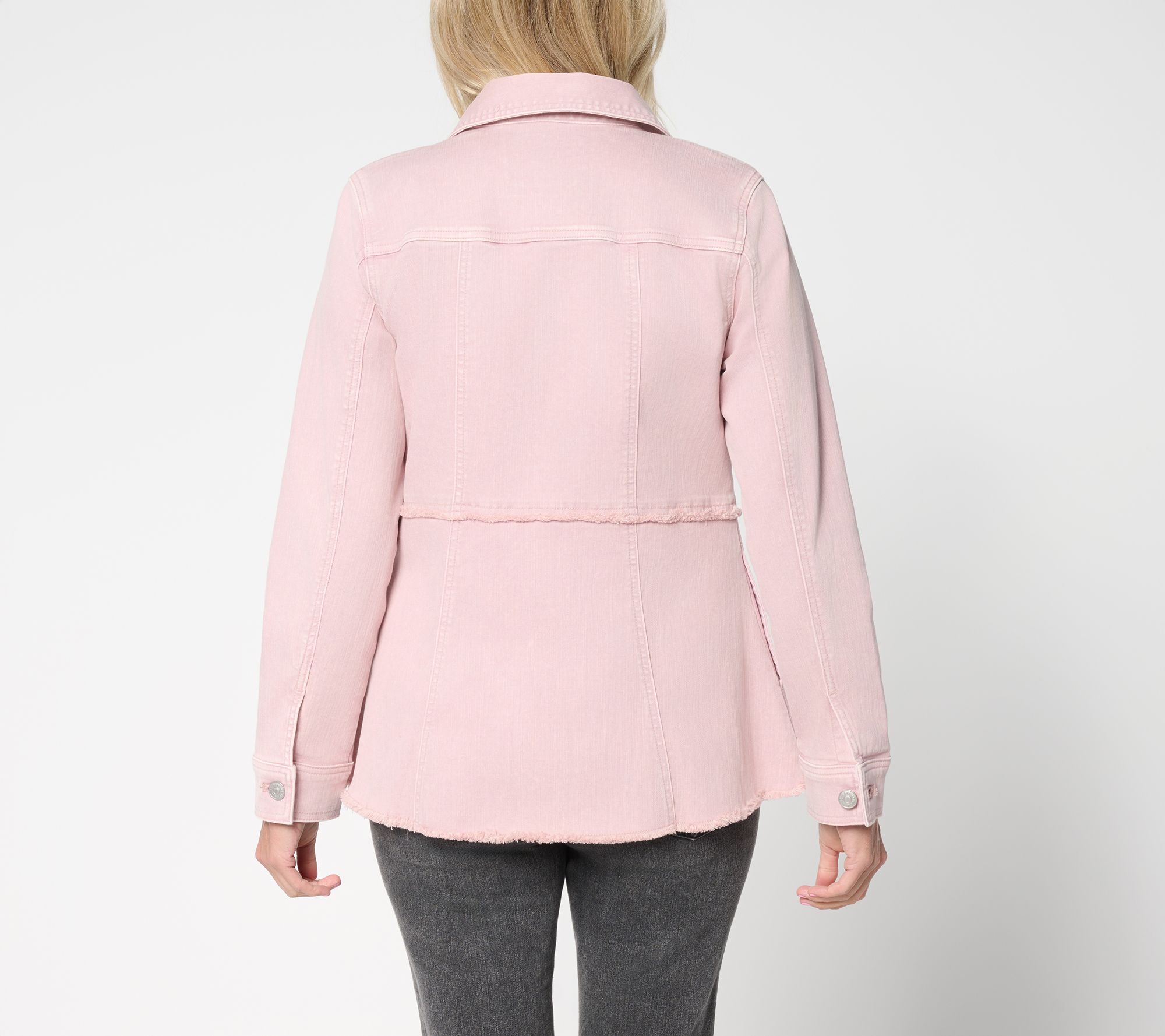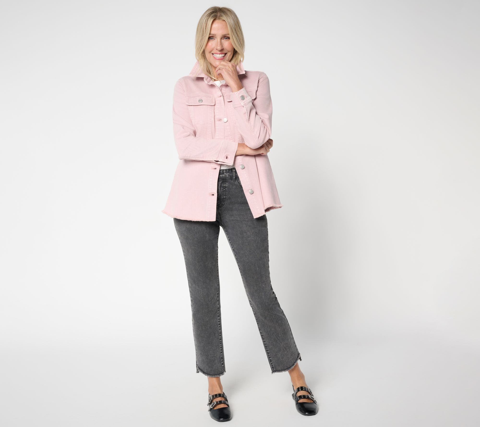 Down-to-earth denim with a designer touch... LOGO by Lori Goldstein's latest layer is turning heads with its sweet silhouette and trend-right colors and washes. Updated in an A-line design, this denim jacket keeps the classic look we love and adds a few flattering flourishes.