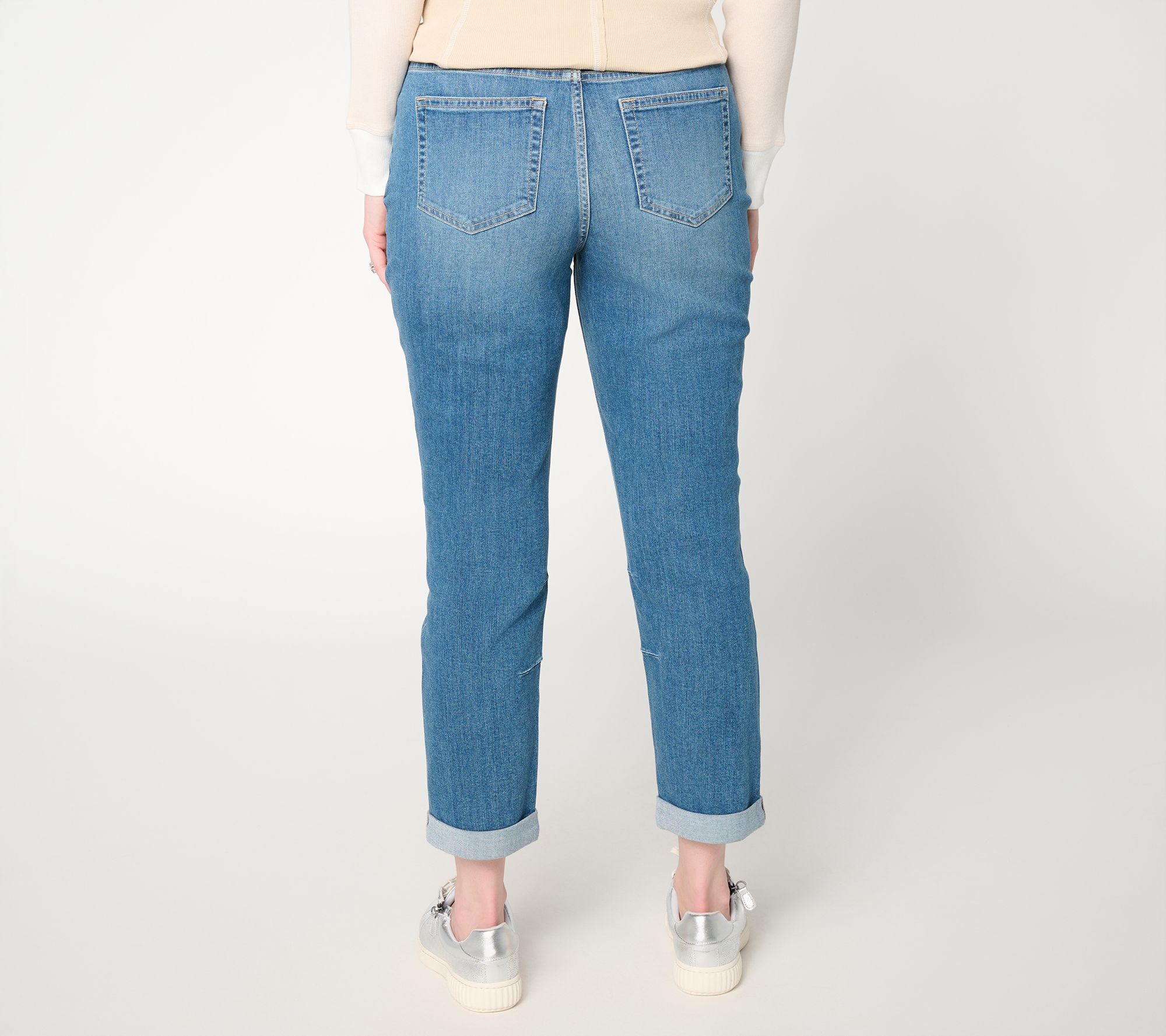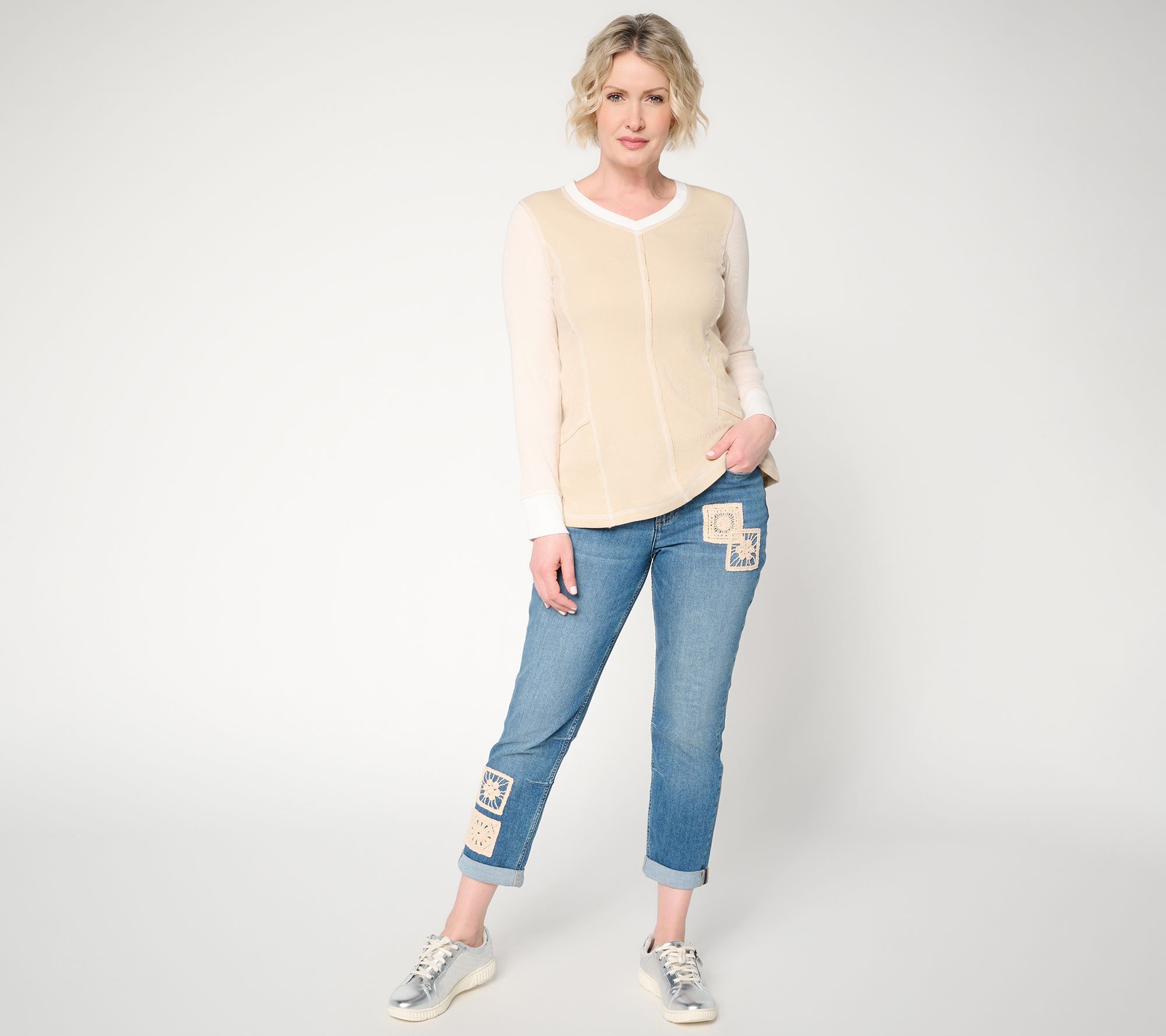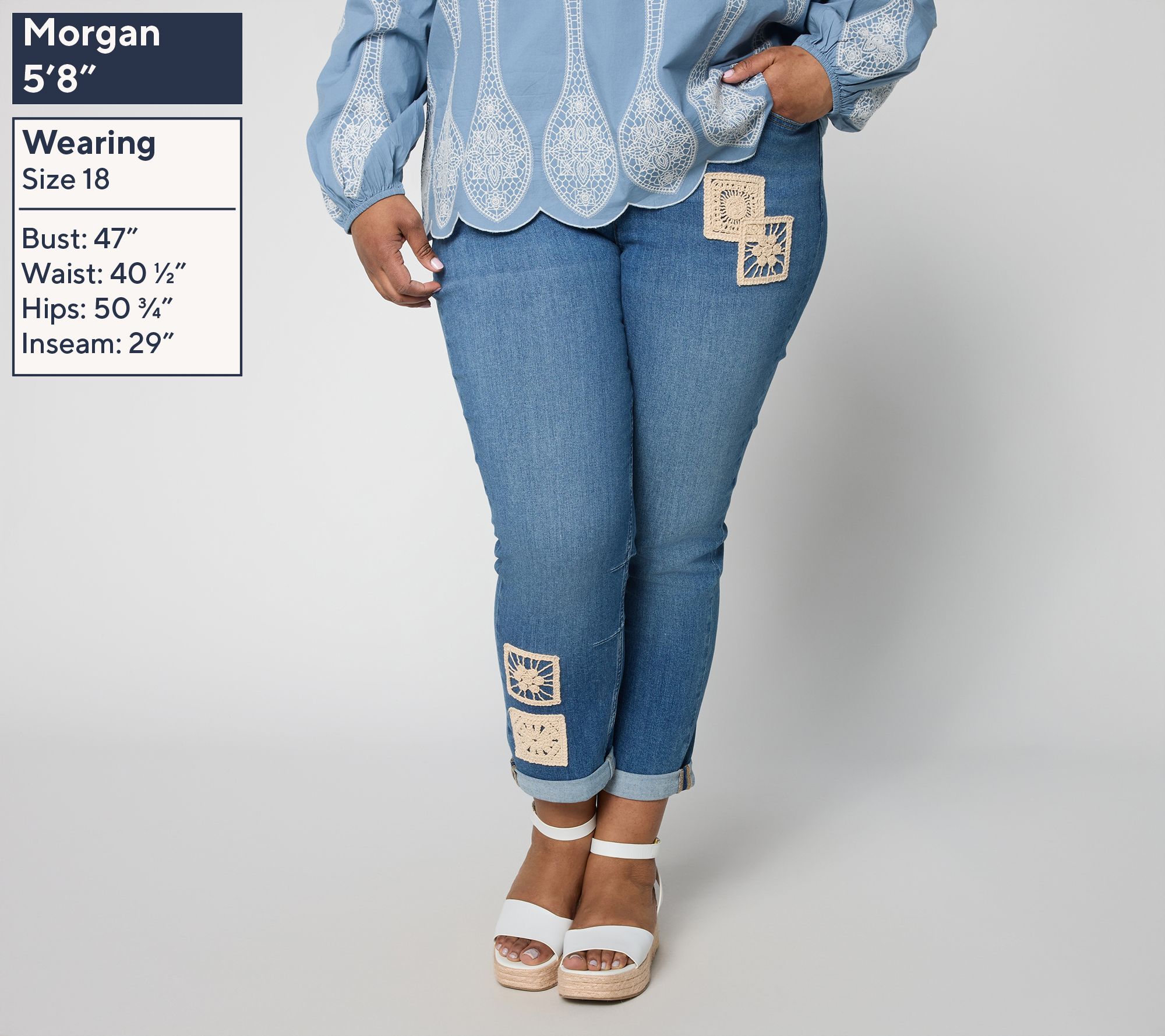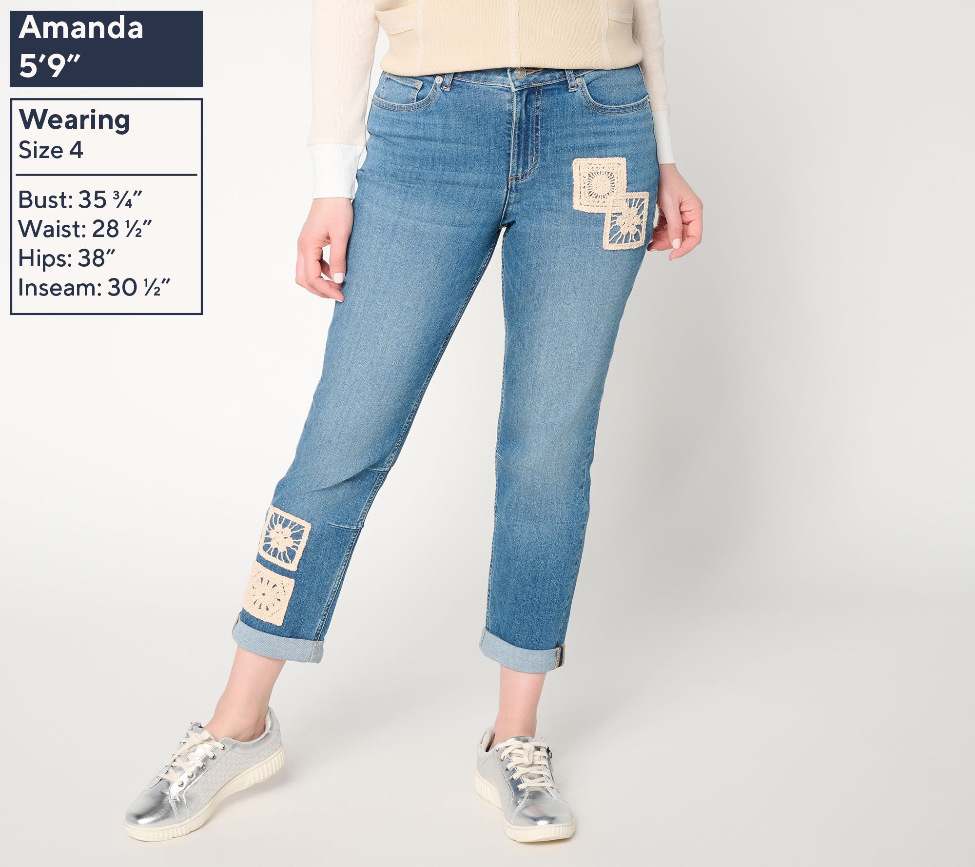 Heading out for errands or relaxing at home, these tapered-leg ankle jeans offer inventive style with crochet patchwork details and a cuffed hem. They're an effortless choice for layering with your go-to sneakers or flats. From LOGO by Lori Goldstein®.
